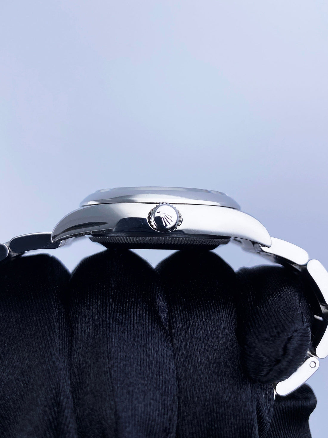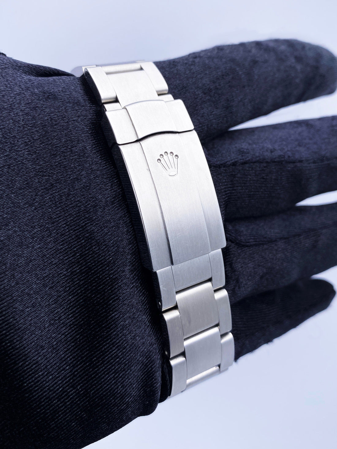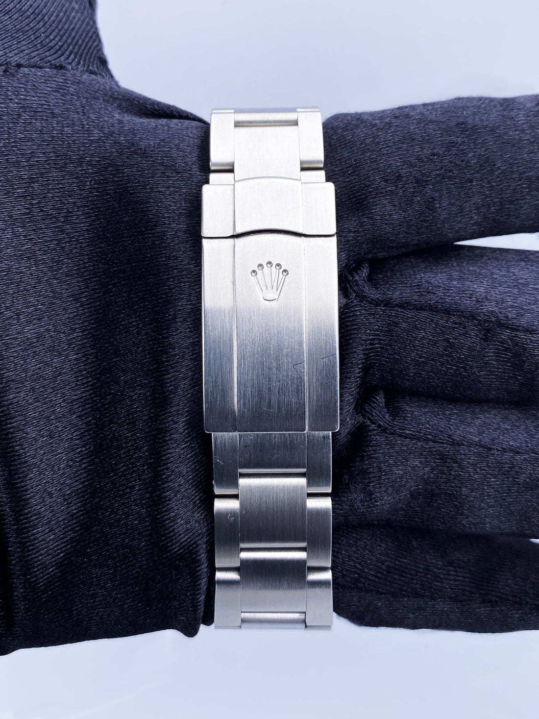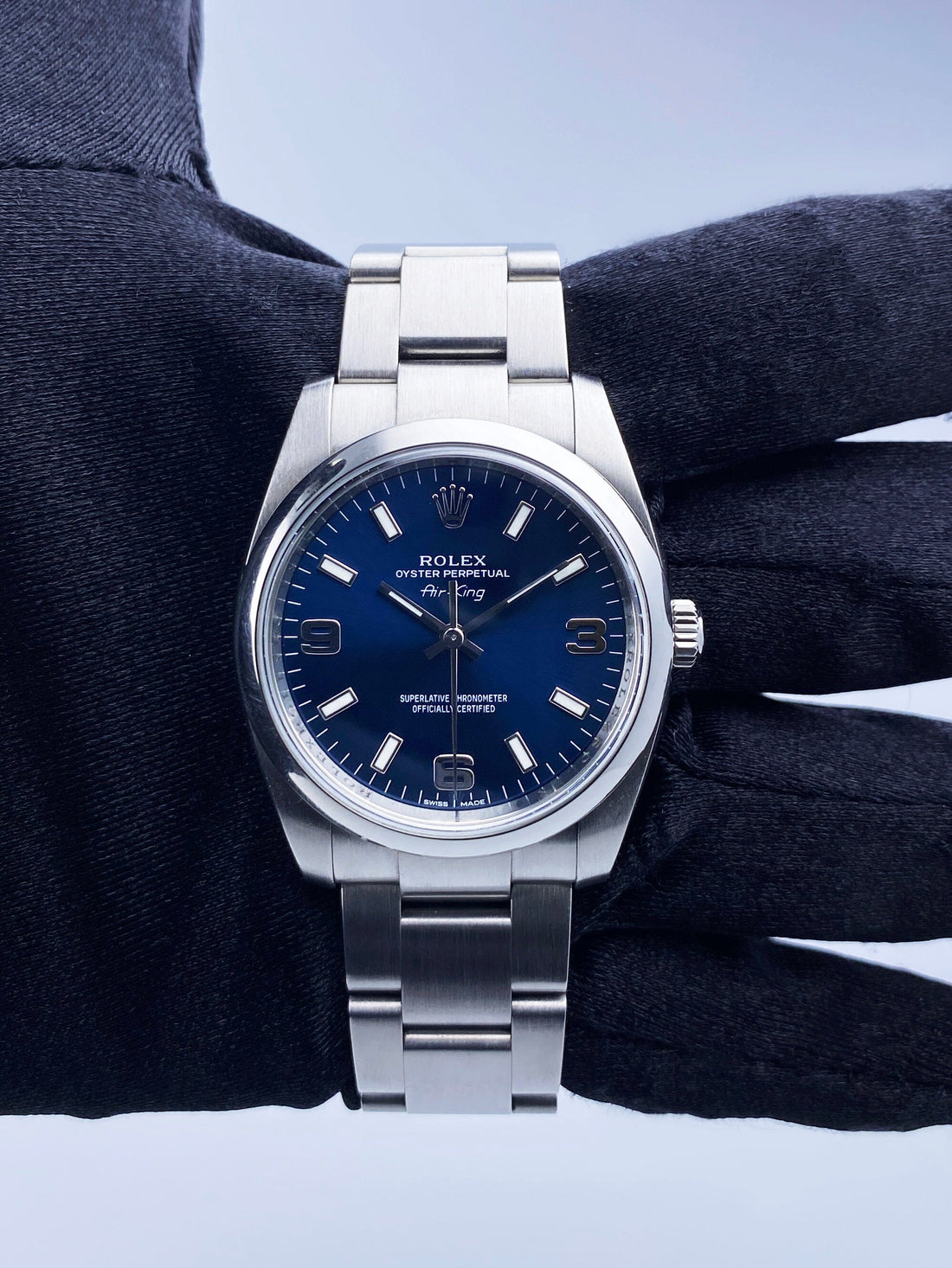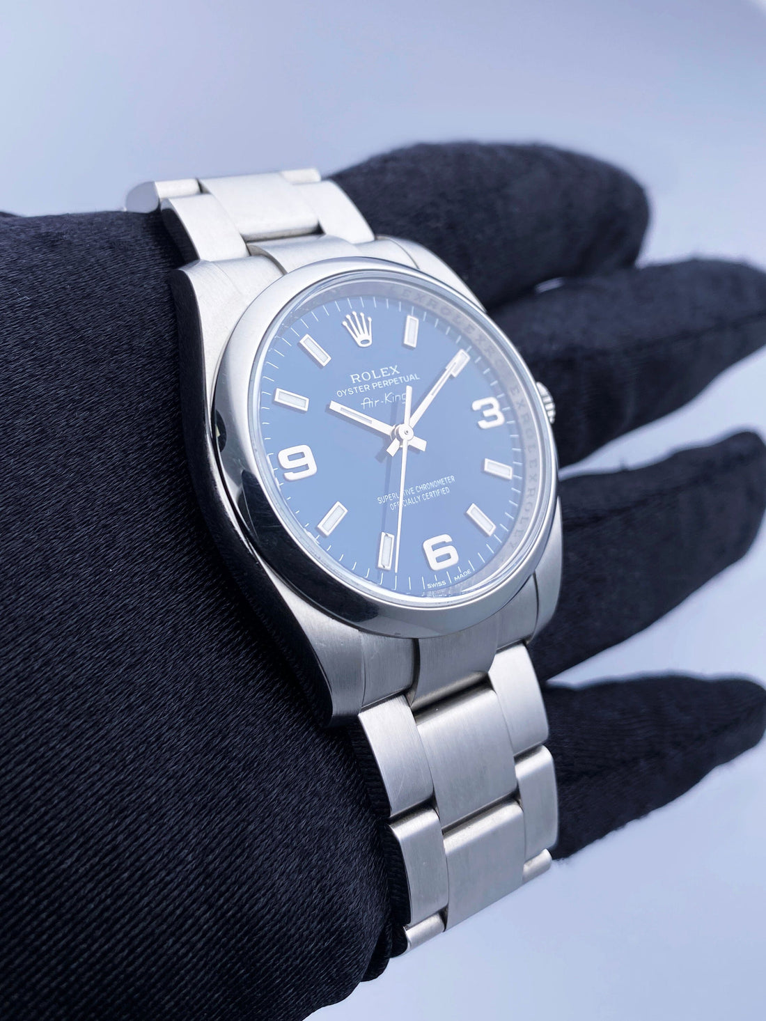Rolex Oyster Perpetual Air King 114200 Mens Watch. 34mm stainless steel case. Stainless steel smooth bezel. Blue dial with luminous steel hands and Arabic numeral & index hour marker. Minute marker around the outer dial. Stainless steel Oyster bracelet with stainless steel fold over clasp. Will fit up to 7-Inch wrist. Sapphire crystal. Stainless steel case back. Automatic self-winding movement. This watch comes with original Box and Papers.