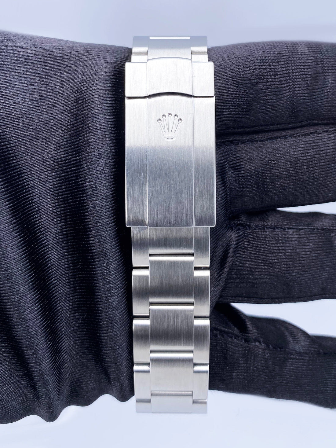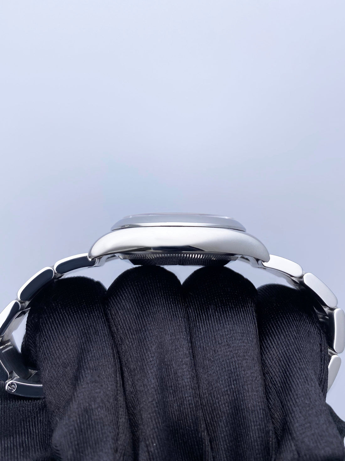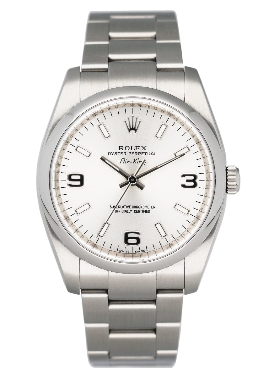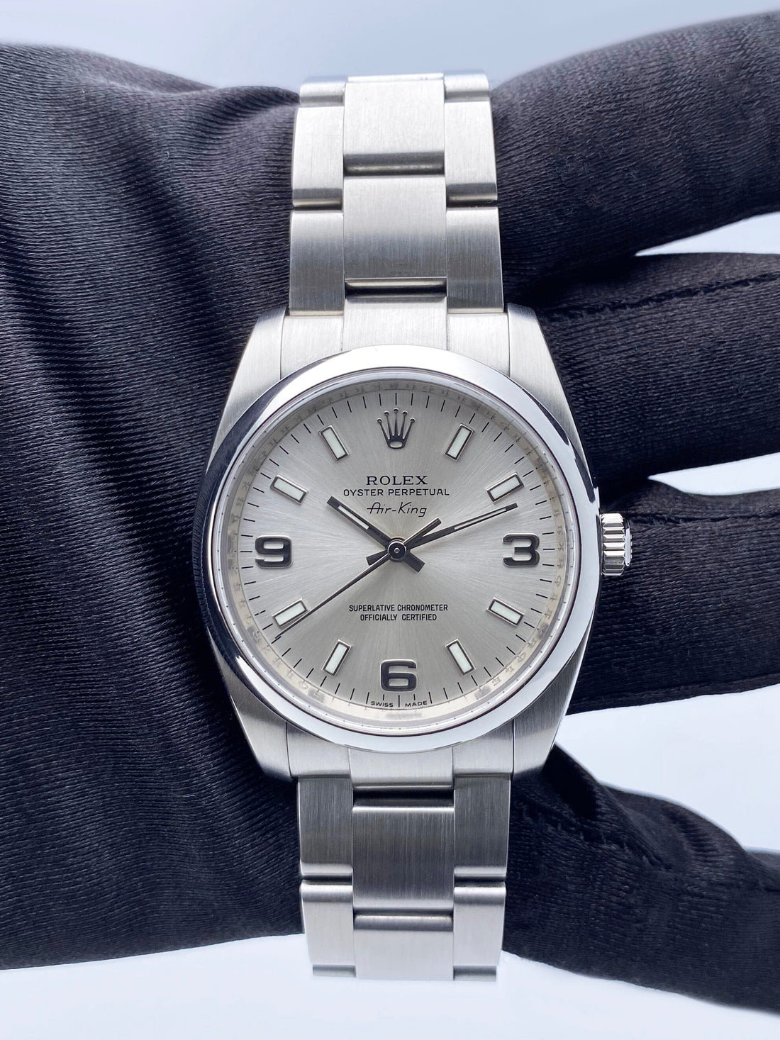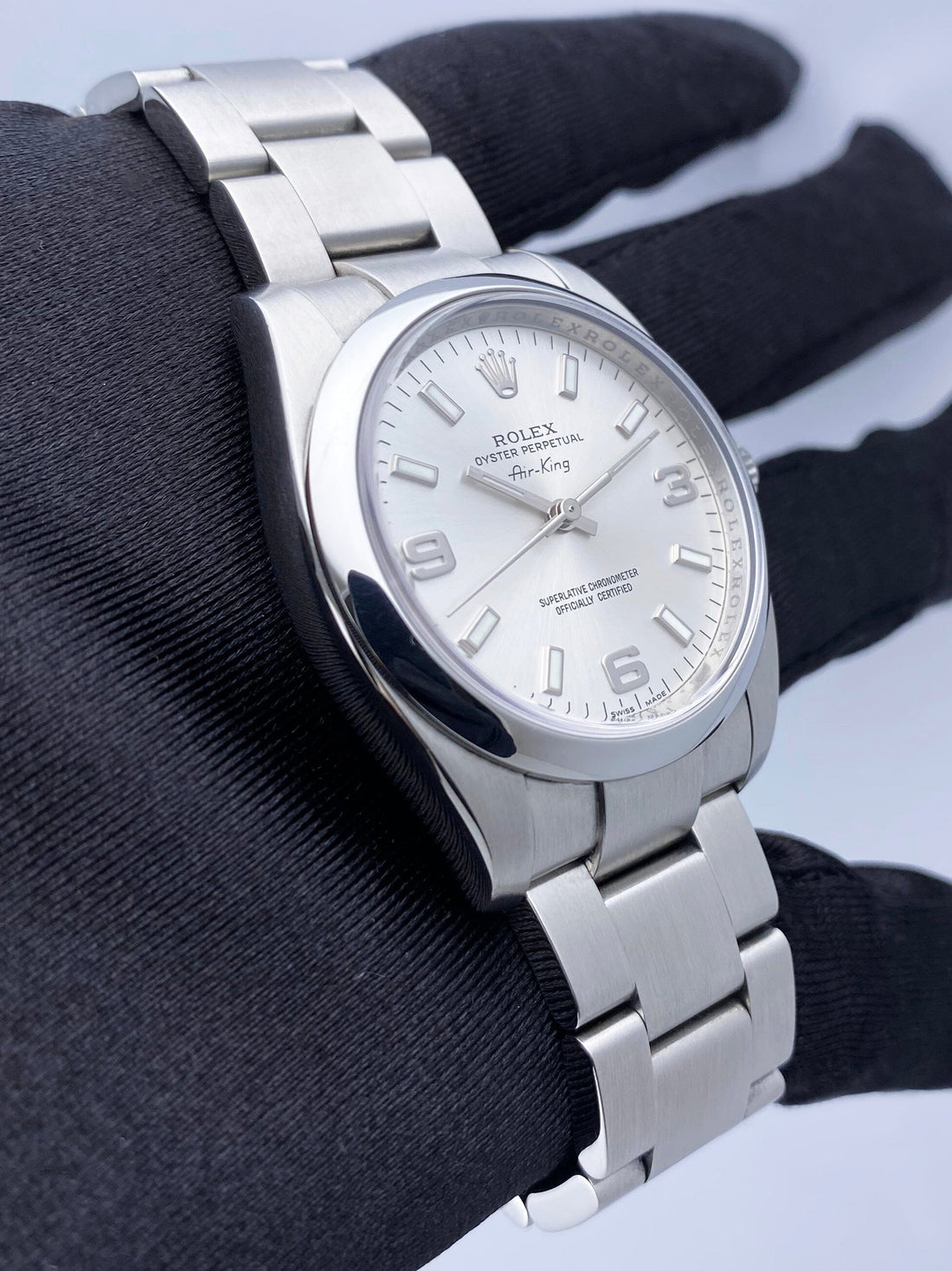 Rolex Oyster Perpetual Air King 114200 Mens Watch. 34mm stainless steel case. Stainless steel smooth bezel. Silver dial with luminous steel hands and Arabic numeral & index hour marker. Minute marker around the outer dial. Stainless steel Oyster bracelet with stainless steel fold over clasp. Will fit up to 7-Inch wrist. Sapphire crystal. Stainless steel case back. Automatic self-winding movement. This watch comes with original Box and Papers.
