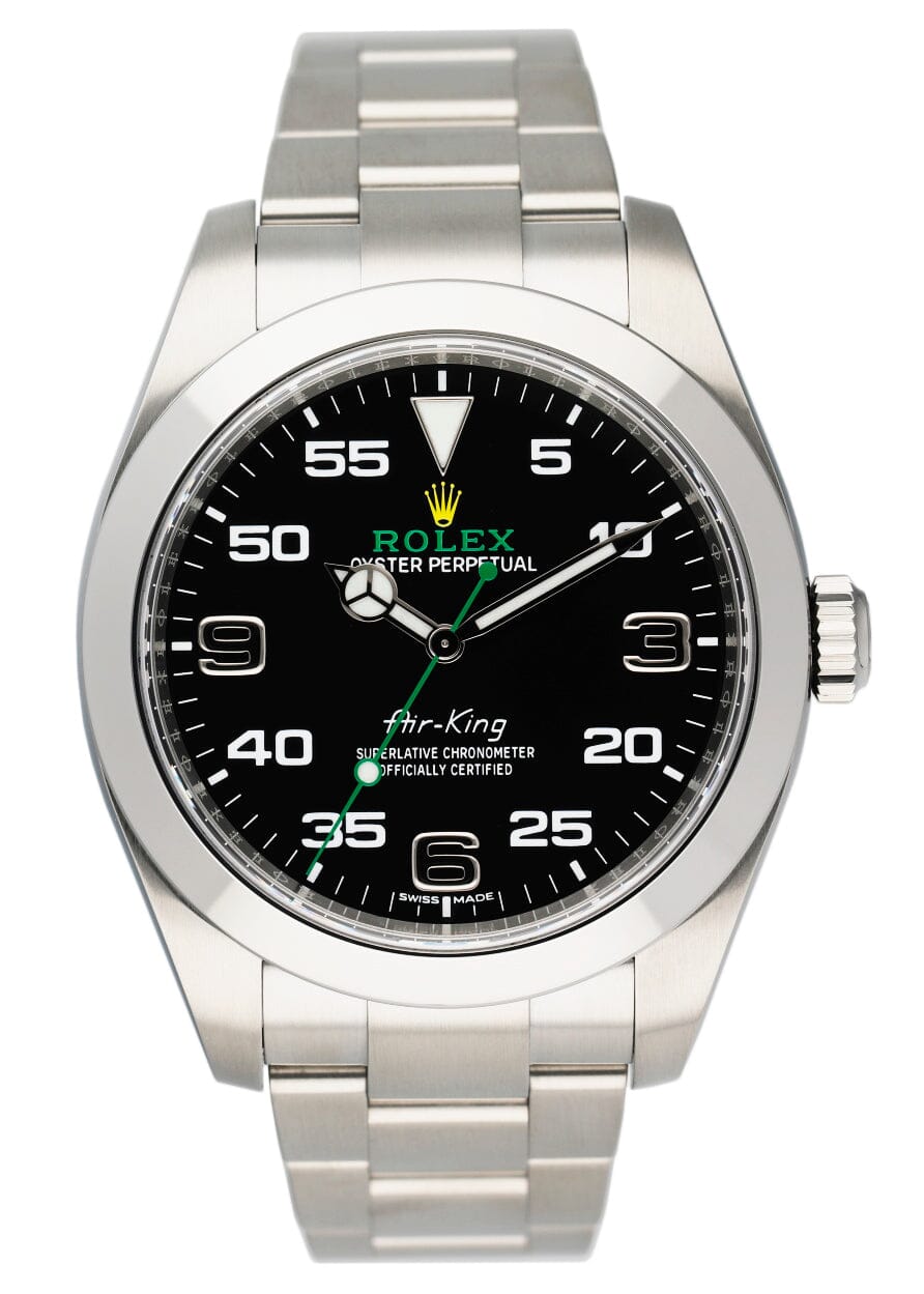 Rolex Oyster Perpetual Air King 116900 Mens Watch. 40mm stainless steel case with stainless steel smooth bezel. Black dial with luminous steel hands and Arabic numeral hour and minute markers. Stainless steel Oyster bracelet with fold over clasp. Will fit up to a 7-inch wrist. Sapphire crystal. Stainless steel case back. Calibre 3230 Automatic self-winding chronometer movement with a 70-hour power reserve. This watch comes with original Box & Papers.
