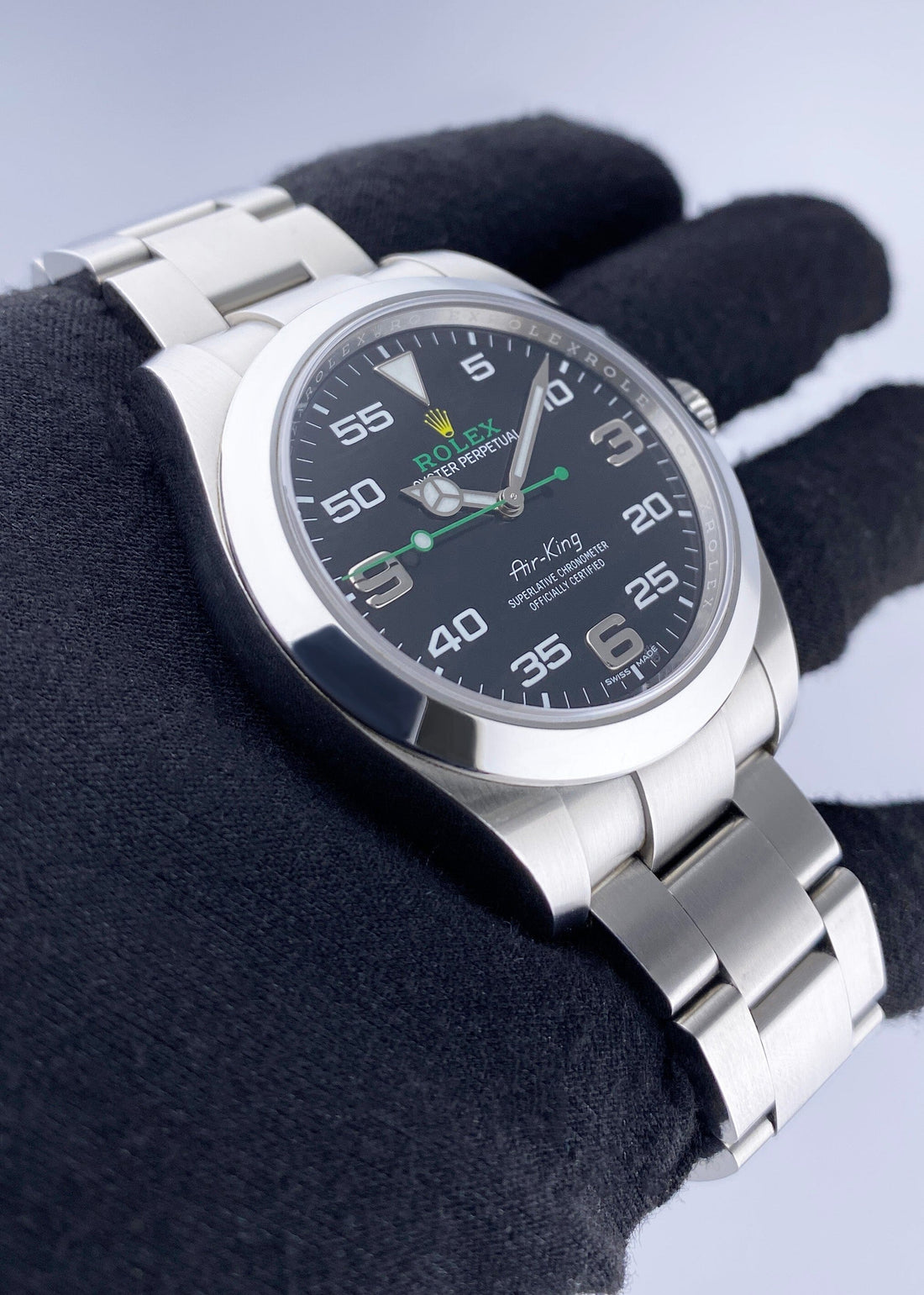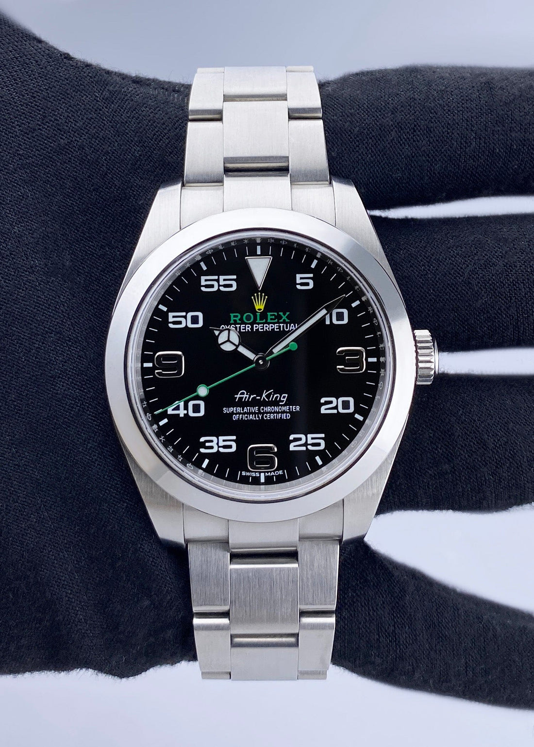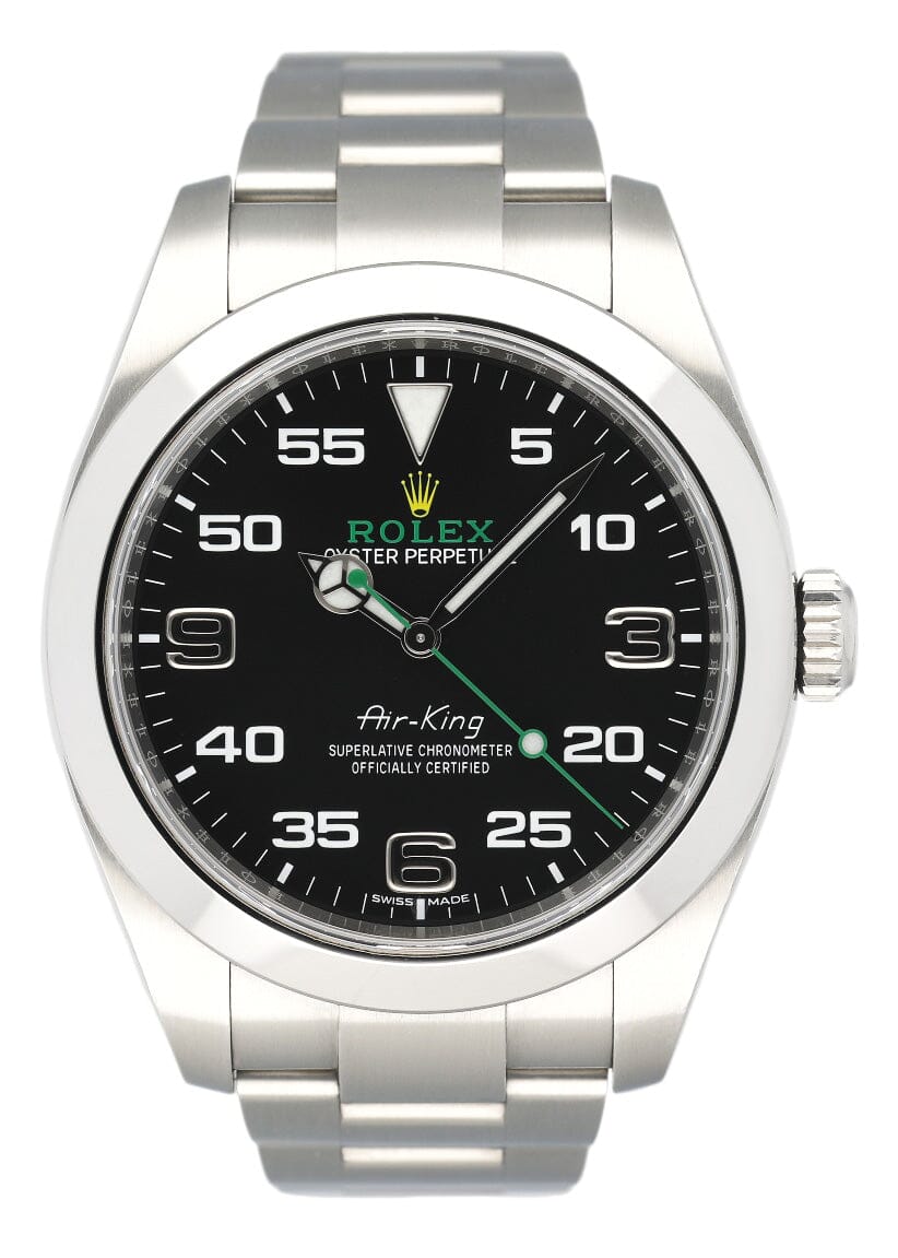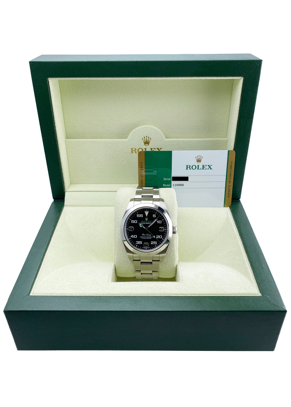 Rolex Oyster Perpetual Air King 116900 Mens Watch. 40mm stainless steel case with stainless steel smooth bezel. Black dial with luminous steel hands and Arabic numeral hour and minute markers. Stainless steel Oyster bracelet with fold over clasp. Will fit up to a 7.5-inch wrist. Sapphire crystal. Stainless steel case back. Automatic self-winding chronometer movement. This watch comes with original Box and Papers.