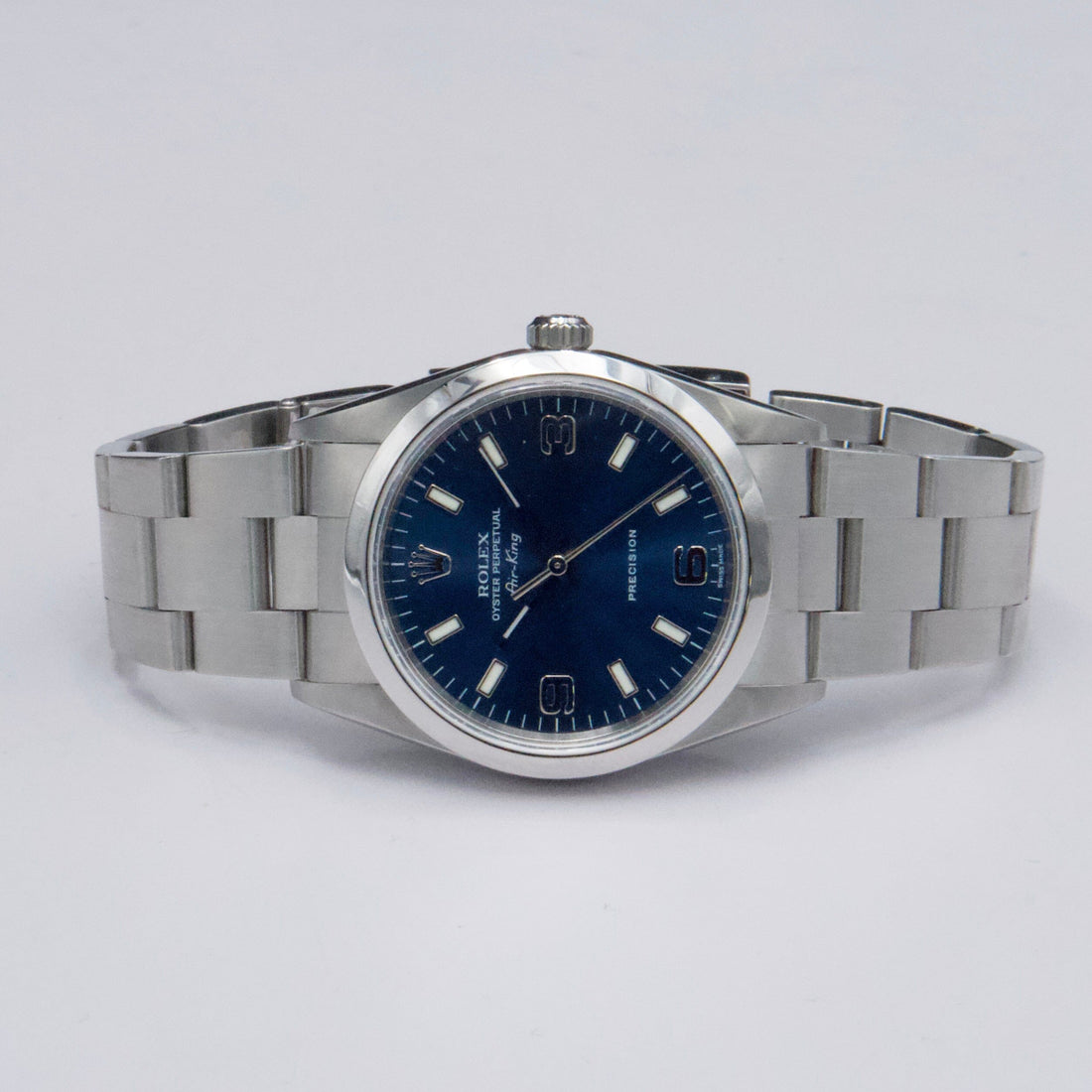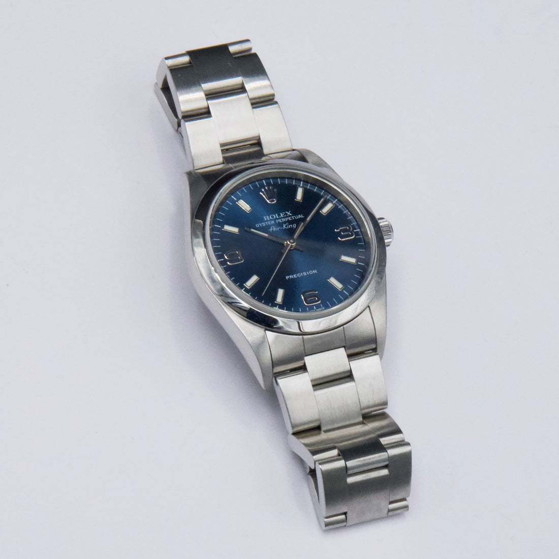 Rolex Air-King Precision 14000M Mens Watch. 34mm stainless steel case. Stainless steel smoothed bezel. Blue dial with steel hands and index hour markers. Minute markers on the outer dial. Stainless steel Oyster bracelet with fold over clasp. Will fit up to a 7-inch wrist. Sapphire crystal. Stainless steel case back. Automatic self-winding movement. This watch comes with original Box and Papers.