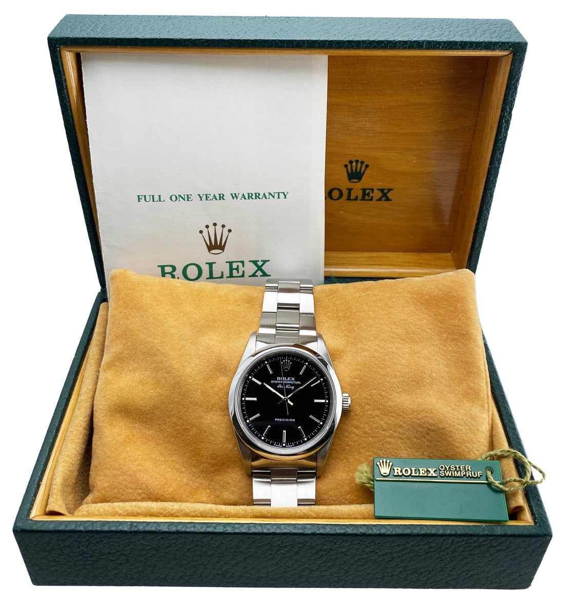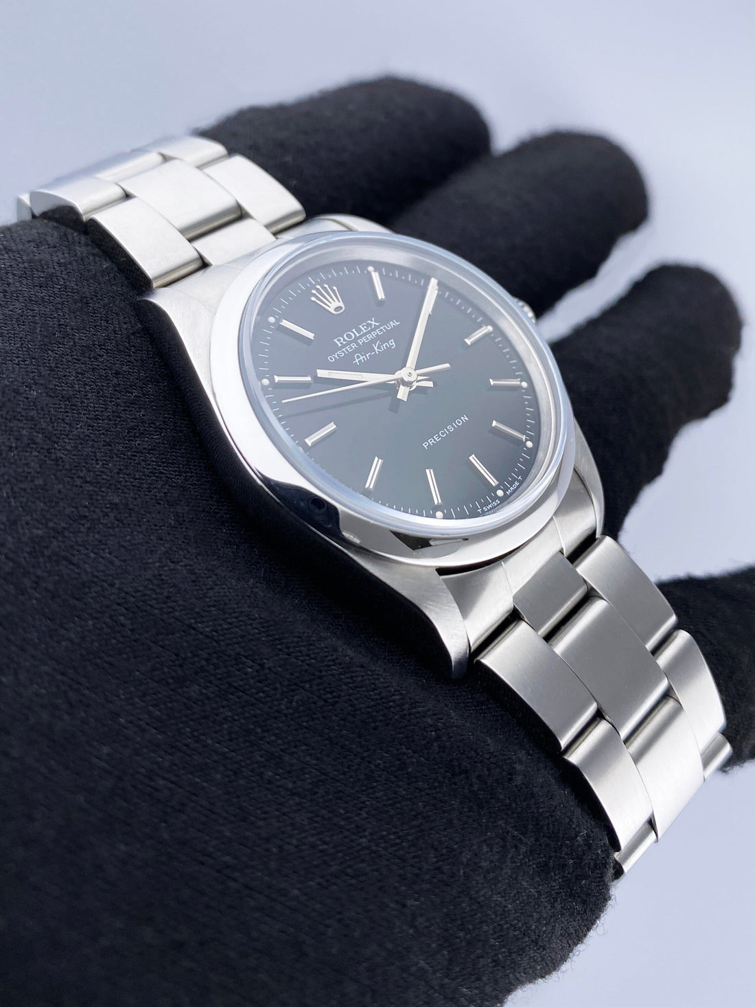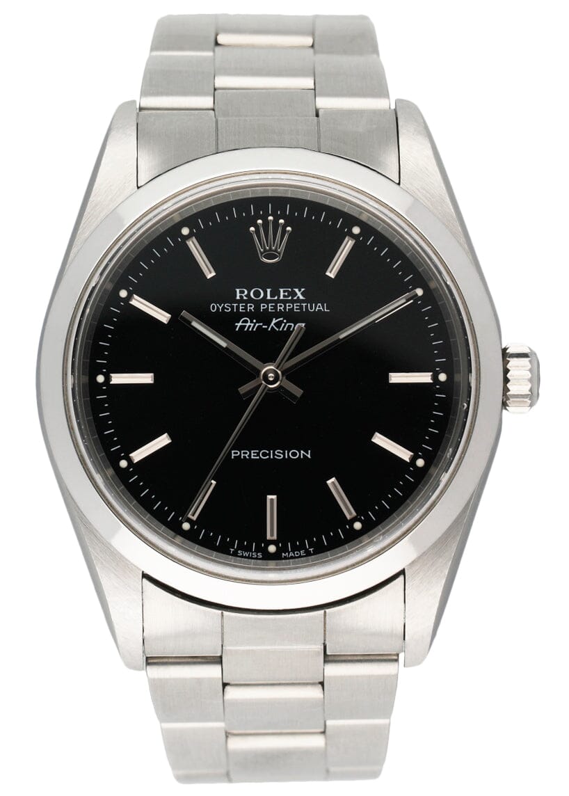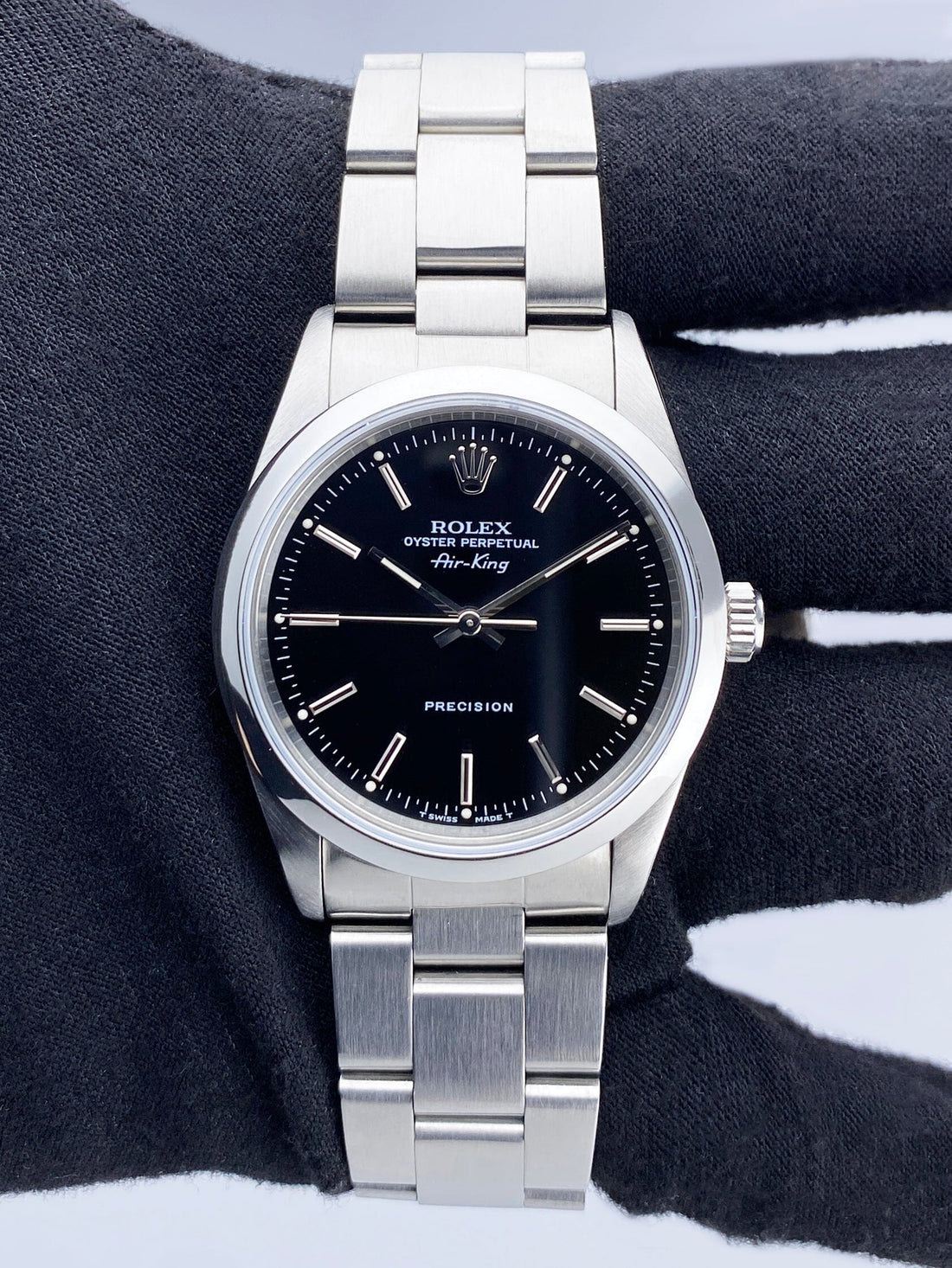 Rolex Air-King Precision 14000 Men's Watch. 34mm stainless steel case. Stainless steel smooth bezel. Black dial with Luminous Steel hands and index hour markers. Minute markers on the outer dial. Stainless steel bracelet with fold over clasp. Will fit up to a 7-inch wrist. Sapphire crystal. Stainless steel case back. Automatic self-winding movement. This watch comes with Box and Papers.