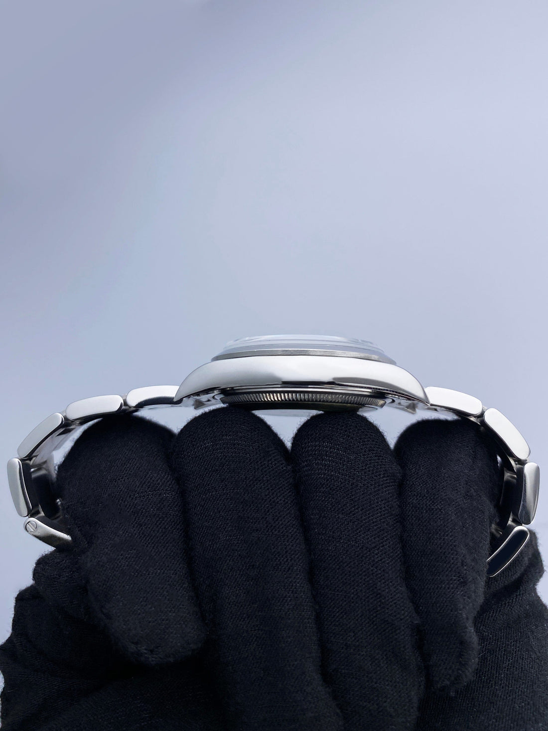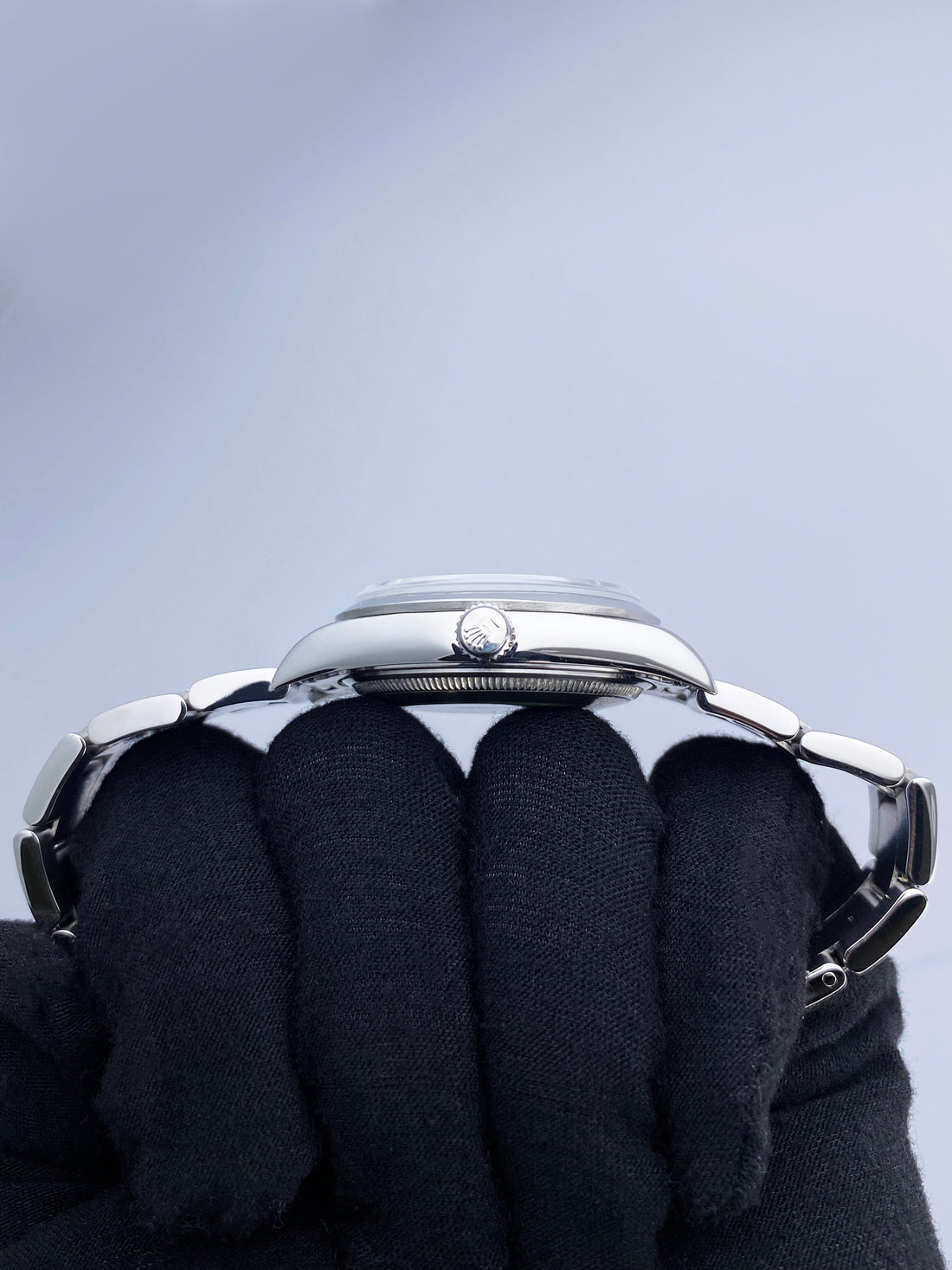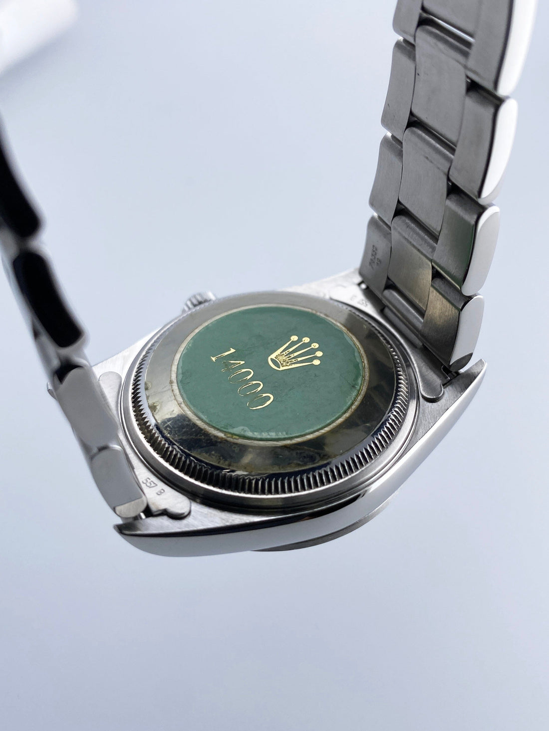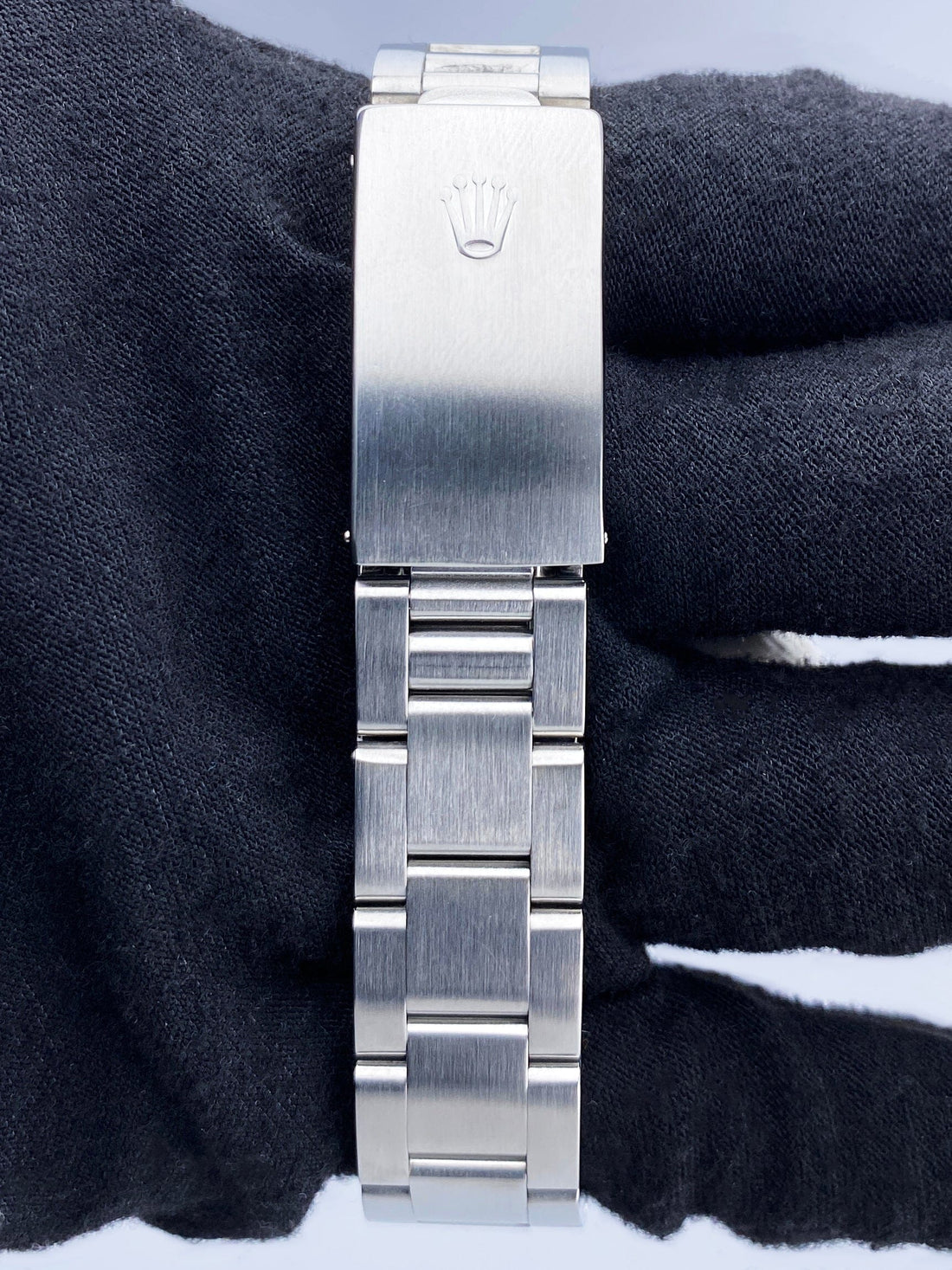 Rolex Air-King Precision 14000 Men's Watch. 34mm stainless steel case. Stainless steel smooth bezel. Black dial with Luminous Steel hands and index hour markers. Minute markers on the outer dial. Stainless steel bracelet with fold over clasp. Will fit up to a 7-inch wrist. Sapphire crystal. Stainless steel case back. Automatic self-winding movement. This watch comes with Box and Papers.