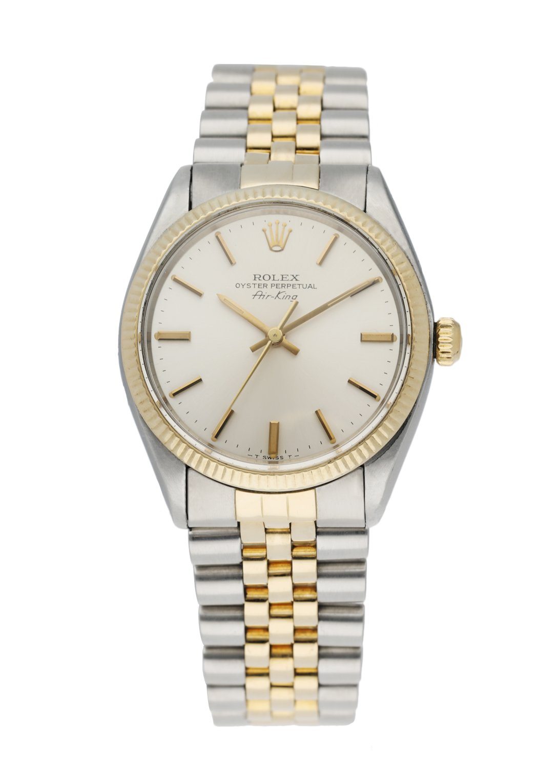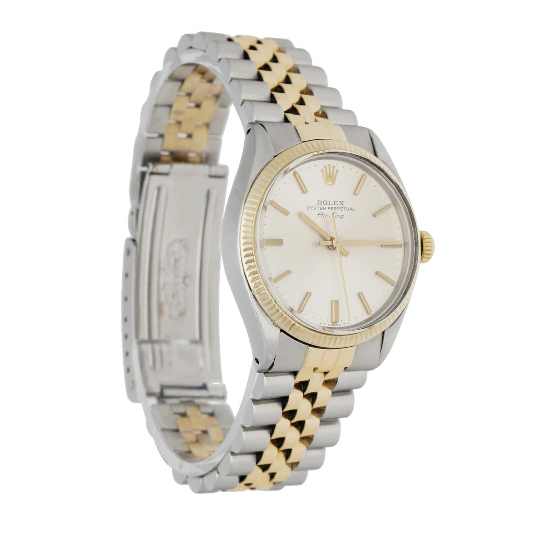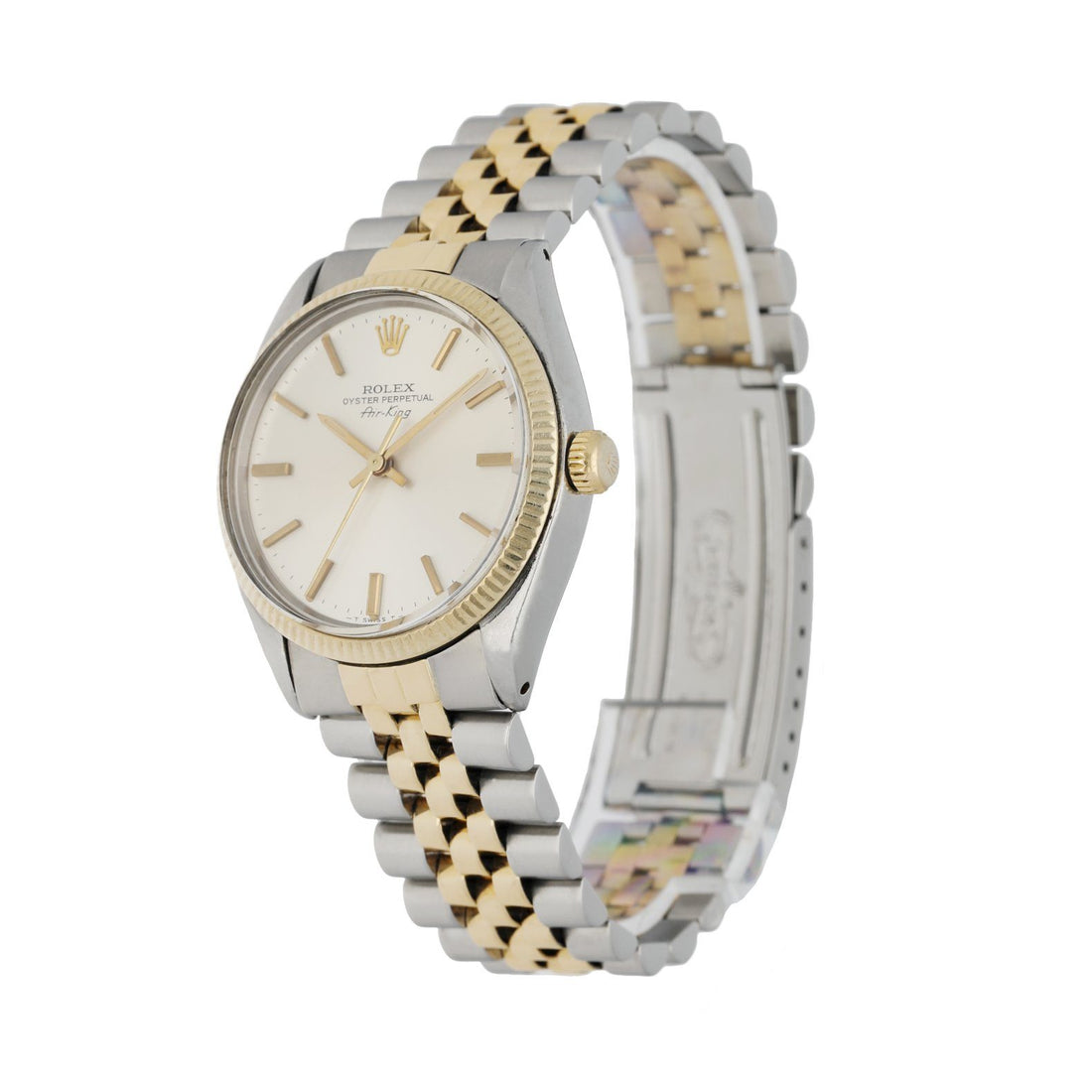 Rolex Oyster Perpetual Air-King 5501 Men's Watch. 34mm stainless steel case with 18K yellow gold fluted bezel. Silver dial golden hands and index hour markers. Stainless steel & 18K yellow gold jubilee bracelet with a fold-over clasp. Will fit up to a 7.25-inch wrist. Mechanical hand winding movement. Acrylic Crystal, Solid case back. Circa 1981. This watch comes with original Box & Papers.