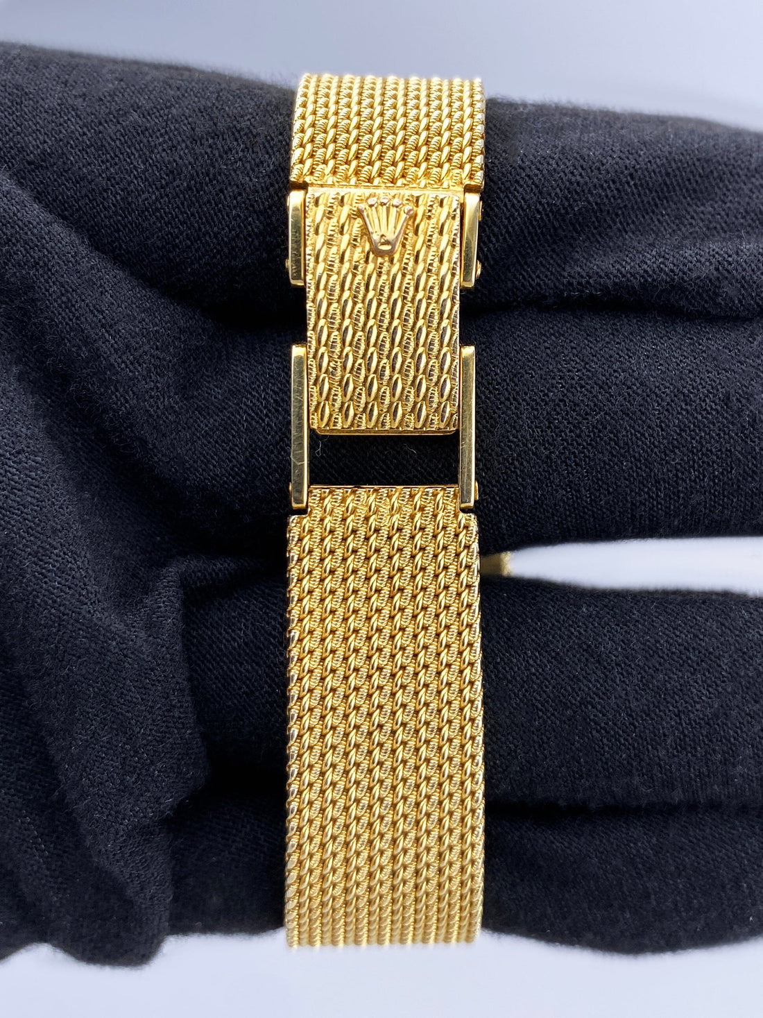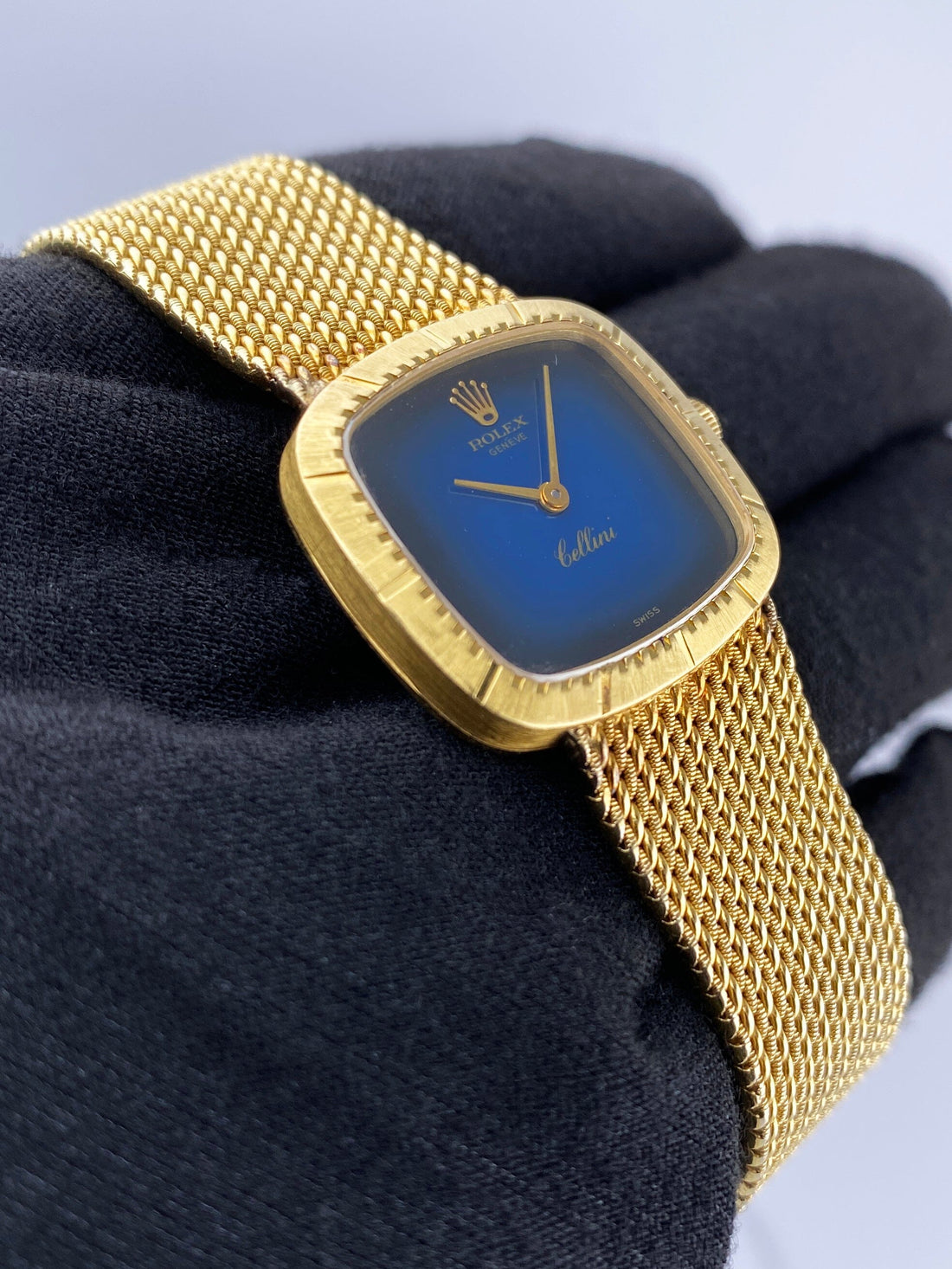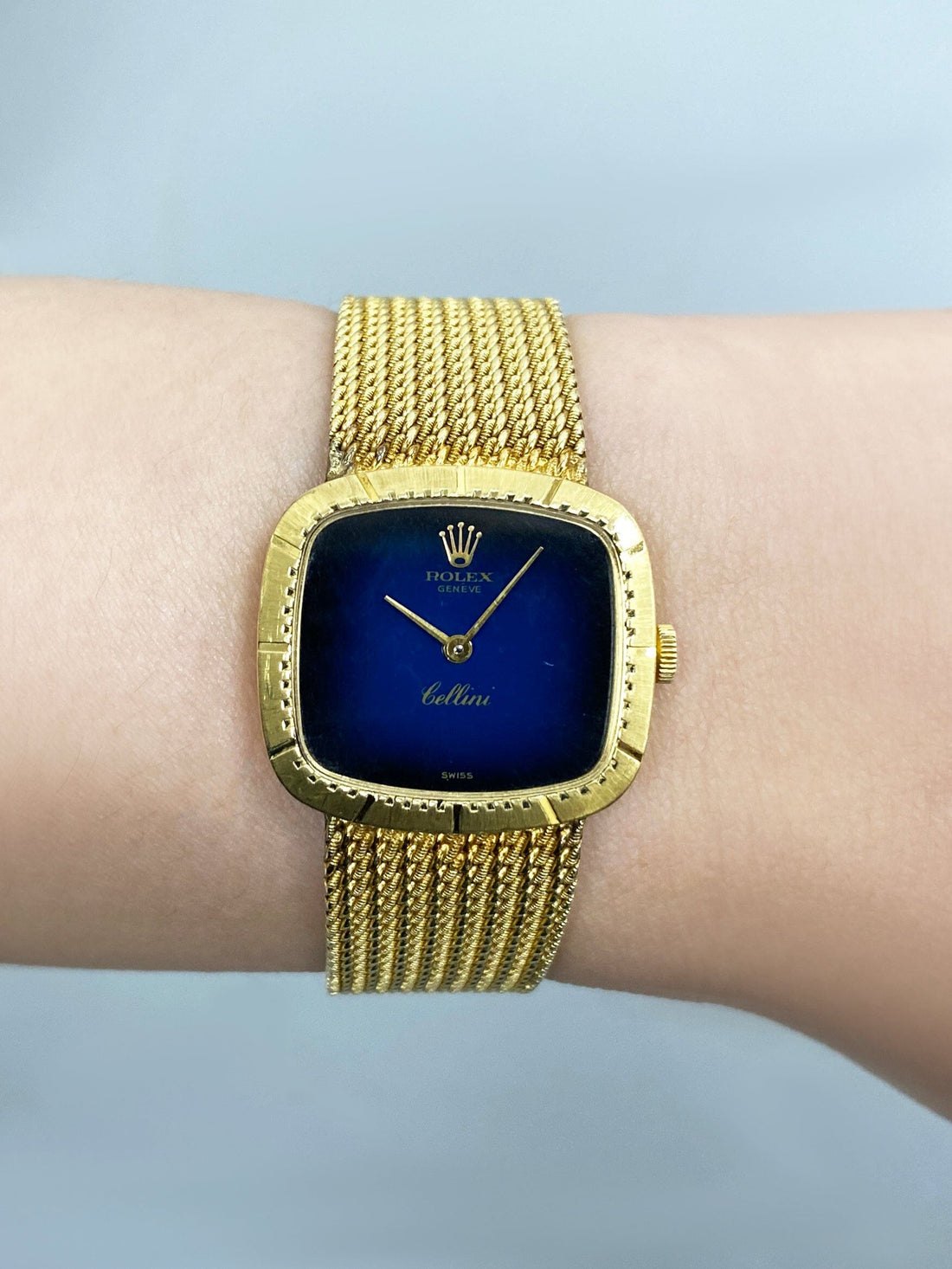 Rolex Cellini Ladies Watch. 25mm 18K yellow gold case. 18K yellow gold bezel. Blue dial with gold hands. 18K yellow mesh bracelet with jewelry clasp. Will fit up to a 6.25-inch wrist. Acrylic crystal. 18K yellow gold case back. Mechanical hand-winding movement.