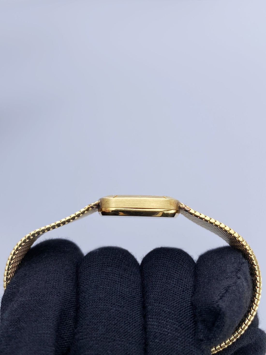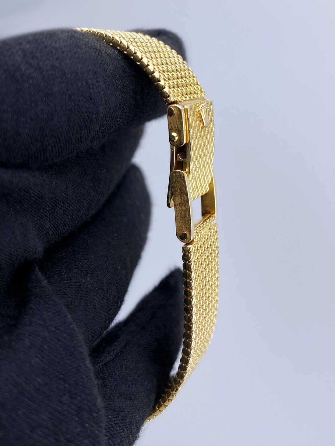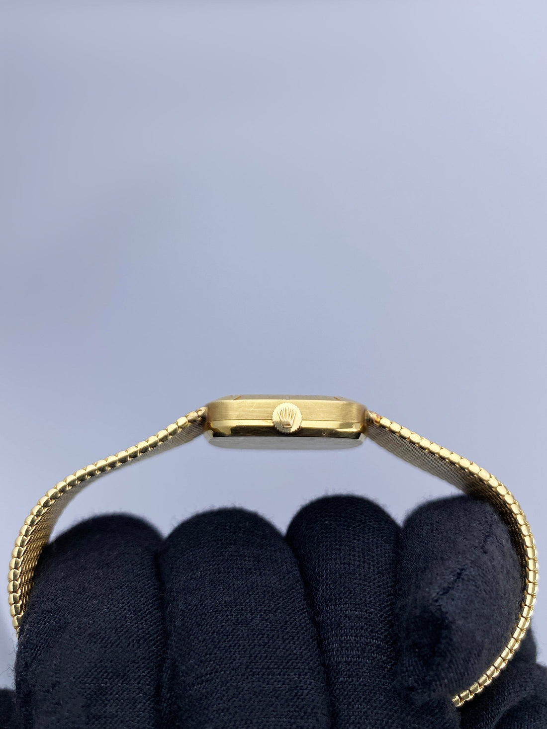 Rolex Cellini Ladies Watch. 25mm 18K yellow gold case. 18K yellow gold bezel. Blue dial with gold hands. 18K yellow mesh bracelet with jewelry clasp. Will fit up to a 6.25-inch wrist. Acrylic crystal. 18K yellow gold case back. Mechanical hand-winding movement.