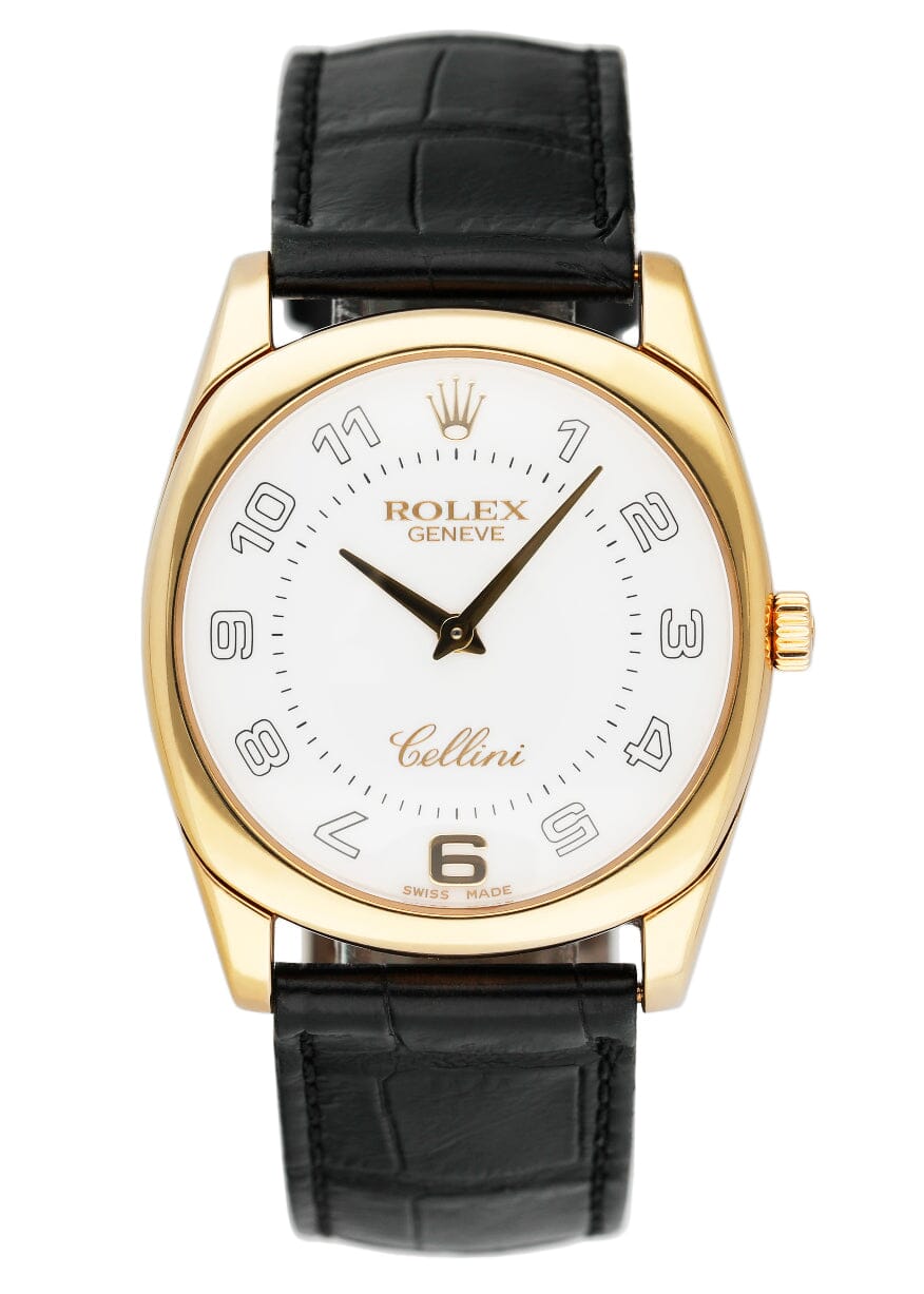 Rolex Cellini Danaos 4233/8 Mens Watch. 33mm 18K yellow gold case with 18K yellow gold bezel. White dial with gold hands and Arabic numeral hour marker. Minute maker on the inner dial. Black leather strap with 18K yellow gold buckle. Will fit up to a 7-inch wrist. Sapphire crystal. 18K yellow gold case back. Mechanical hand winding movement. This watch comes with the original Box and Papers. Circa: 2005.