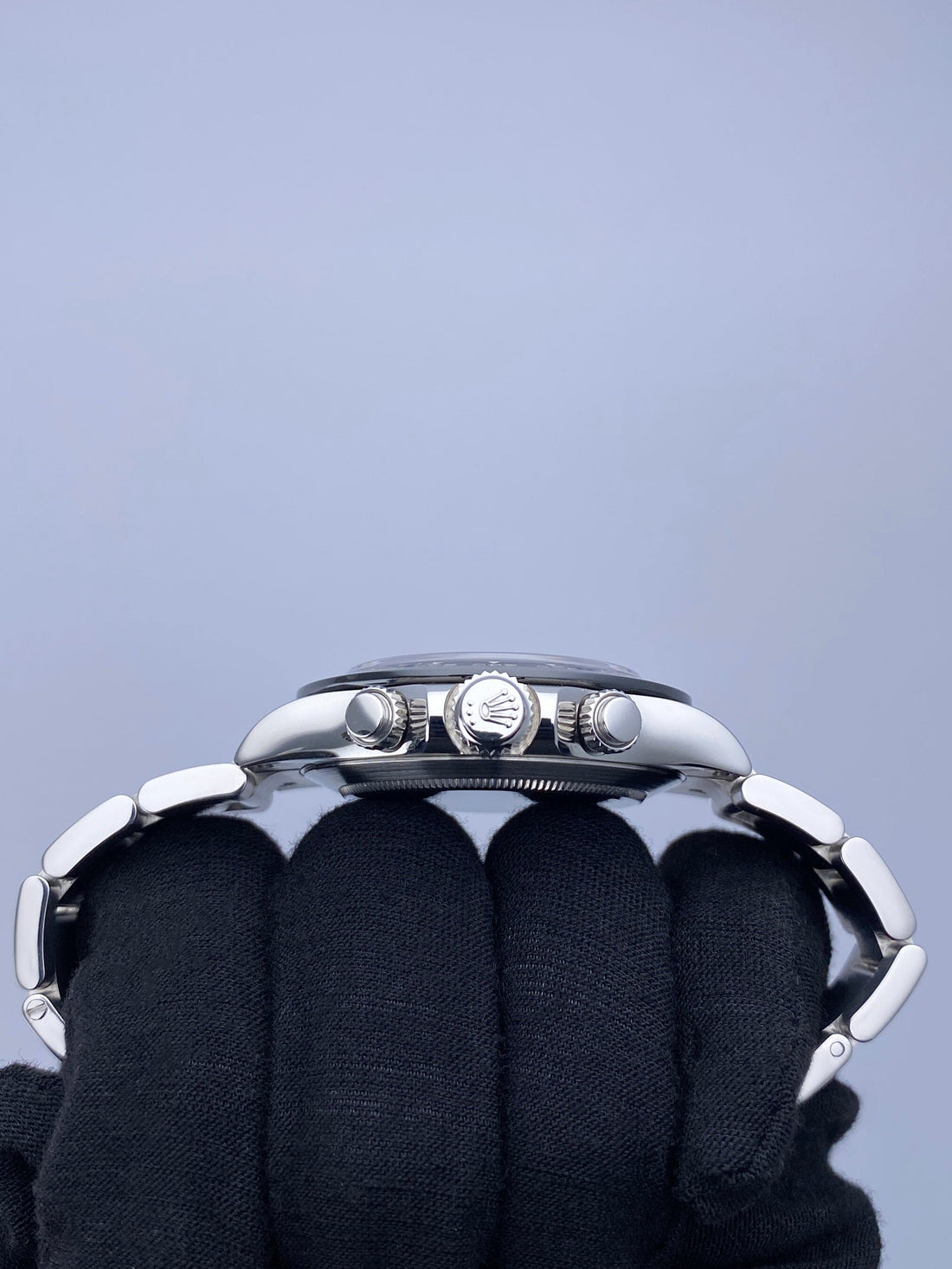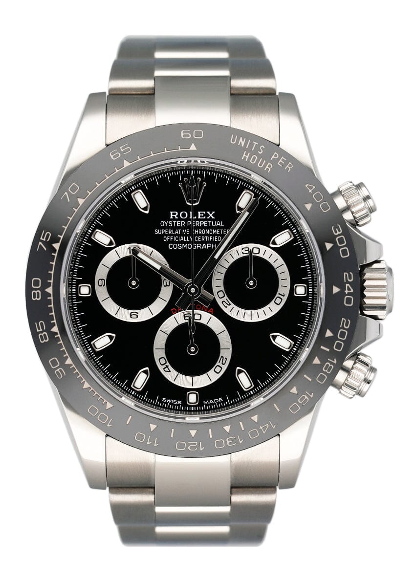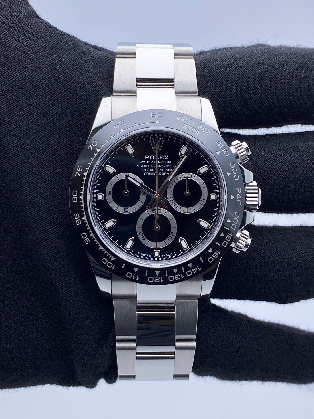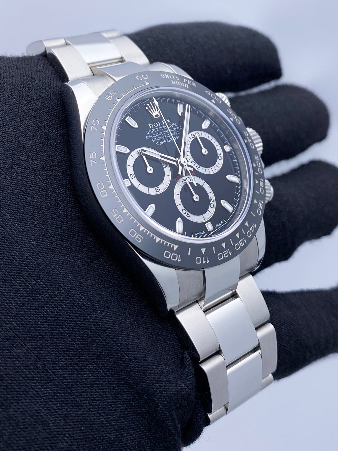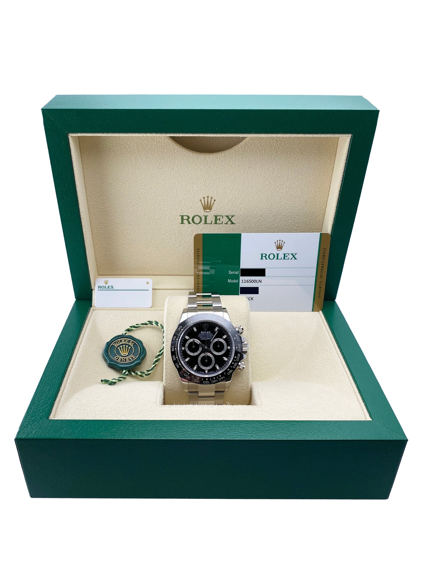 Rolex Cosmograph Daytona 116500LN Mens Watch. 40mm stainless steel case. Black ceramic bezel with tachymetric scale. Black dial with luminous steel hands and index hour markers. Minute markers on the outer dial. Three sub-dials. Small seconds hand at 6 o'clock. 30-minute counter at 3 o'clock. 12-hour counter at 9 o'clock. Stainless steel Oyster bracelet with fold over clasp with safety. Will fit up to a 7.5-inch wrist. Sapphire crystal. Stainless steel case back. Caliber 4130 Automatic self-winding chronometer movement with a 72-hour power reserve. This watch comes with original Box and Papers.
