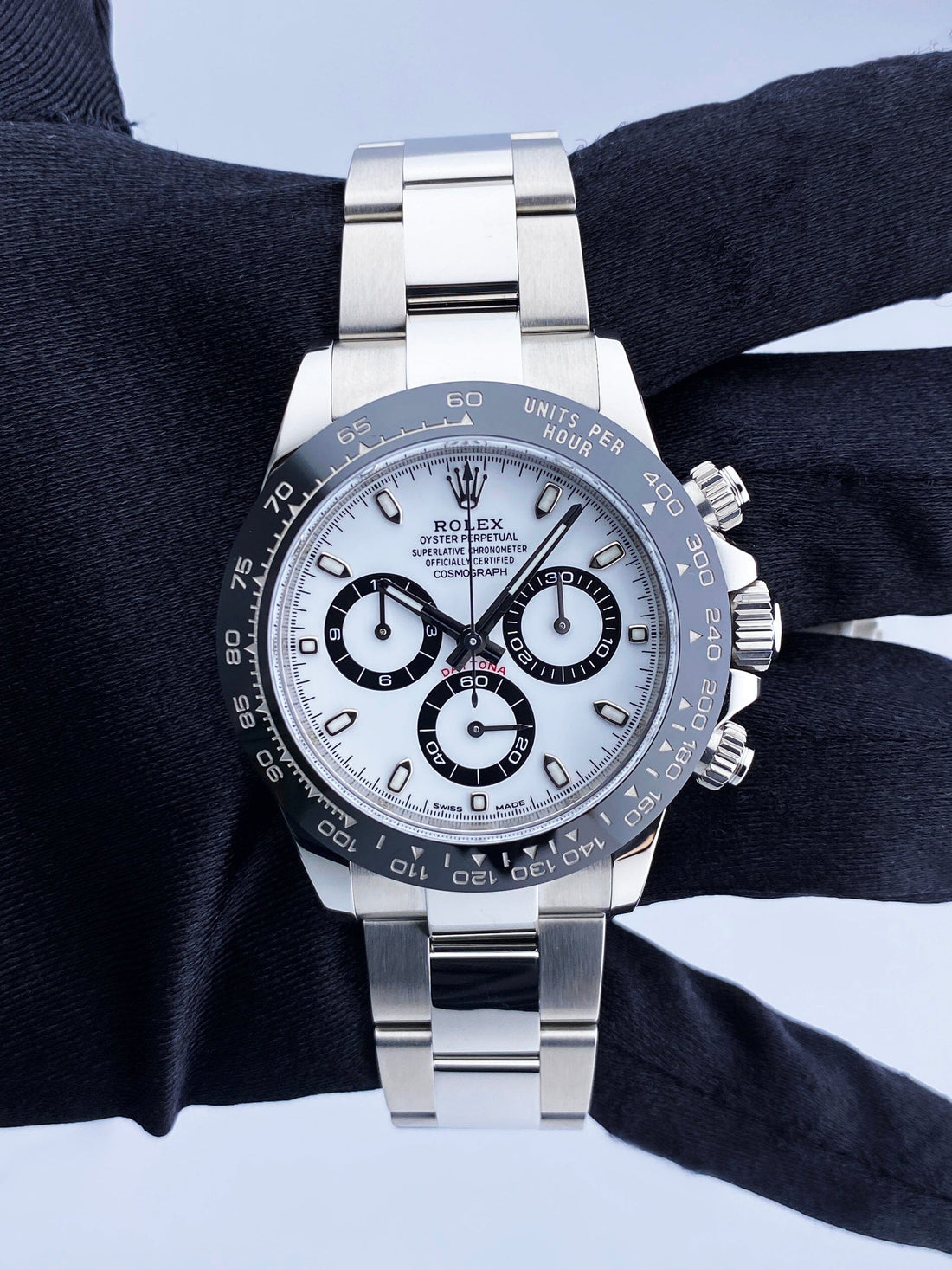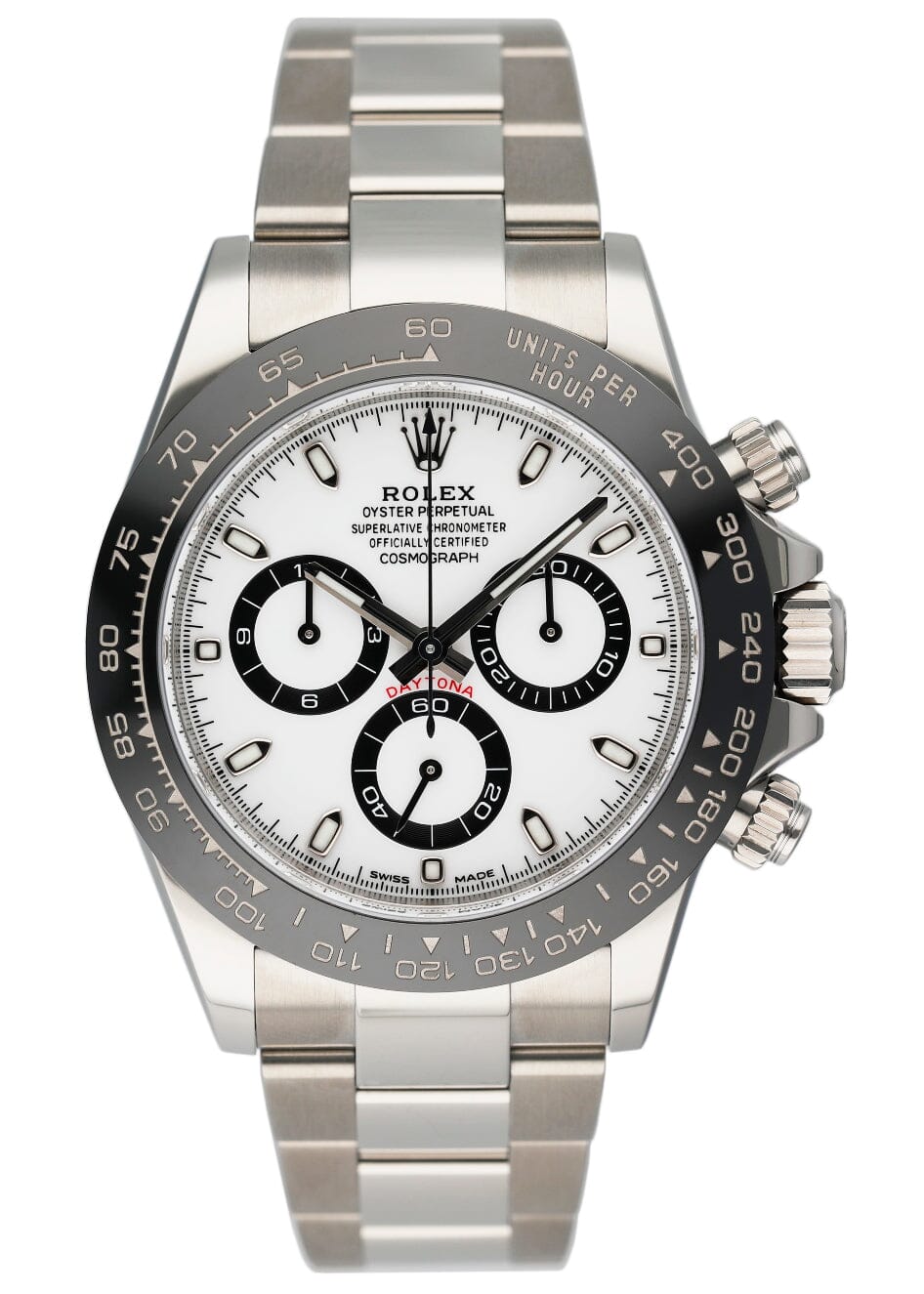 Rolex Cosmograph Daytona 116500LN Mens Watch. 40mm stainless steel case. Black ceramic bezel with tachymetric scale. White dial with luminous steel hands and index hour markers. Minute markers on the outer dial. Three sub-dials. Small seconds hand at 6 o'clock. 30-minute counter at 3 o'clock. 12-hour counter at 9 o'clock. Stainless steel Oyster bracelet with fold over clasp with safety. Will fit up to a 7-inch wrist. Sapphire crystal. Stainless steel case back. Caliber 4130 Automatic self-winding chronometer movement with a 72-hour power reserve. This watch comes with original Box and Papers.