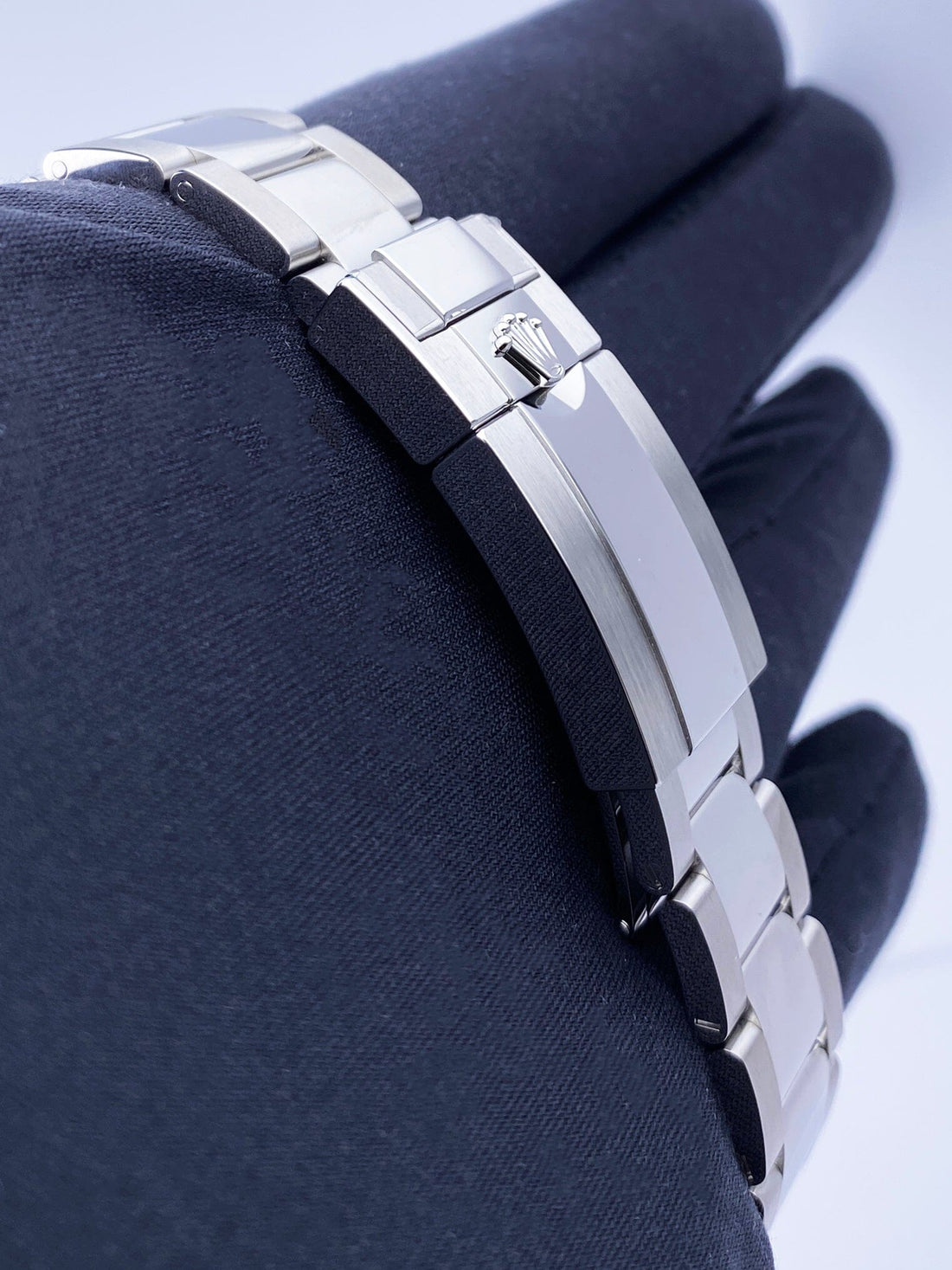 Rolex Cosmograph Daytona 126500LN Mens Watch. 40mm stainless steel case. Black ceramic bezel with tachymetric scale. White dial with luminous steel hands and index hour markers. Minute markers on the outer dial. Three sub-dials. Small seconds hand at 6 o'clock. 30-minute counter at 3 o'clock. 12-hour counter at 9 o'clock. Stainless steel Oyster bracelet with fold over clasp with safety. Will fit up to a 7.5-inch wrist. Sapphire crystal. Stainless steel case back. Caliber 4131 Automatic self-winding chronometer movement with a 72-hour power reserve. This watch comes with original Box and Papers.