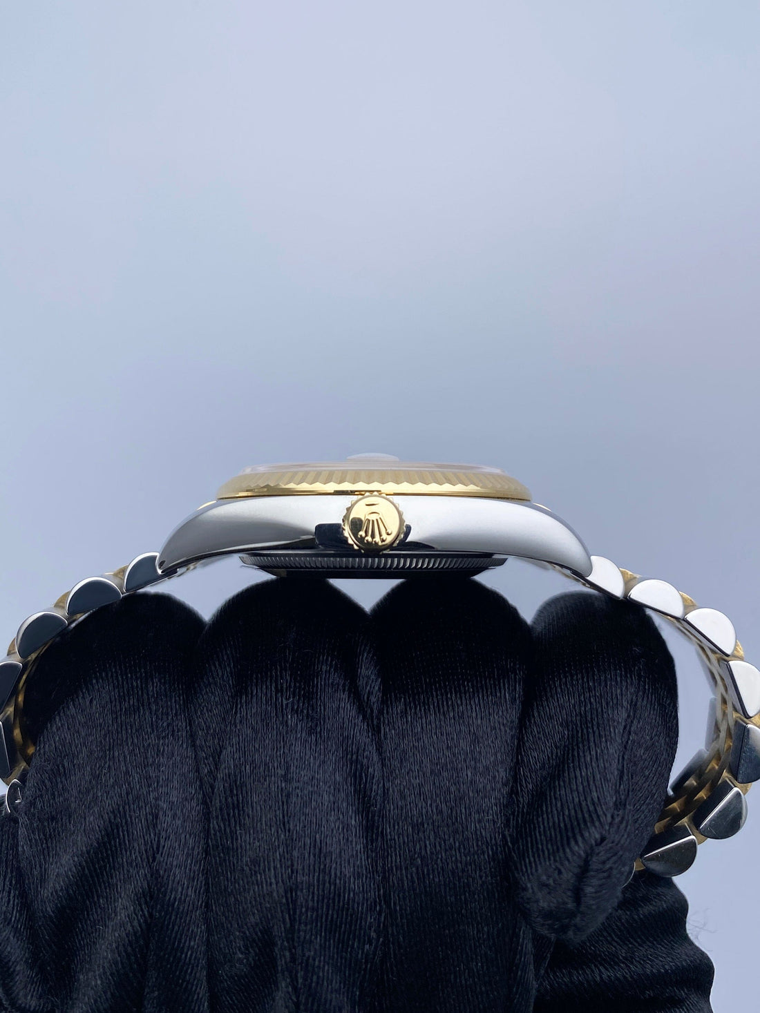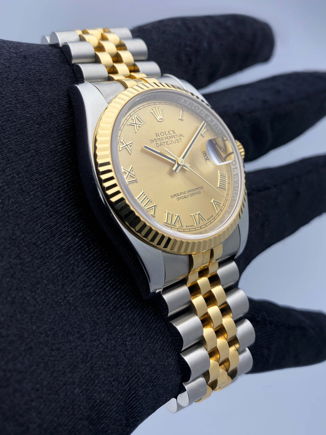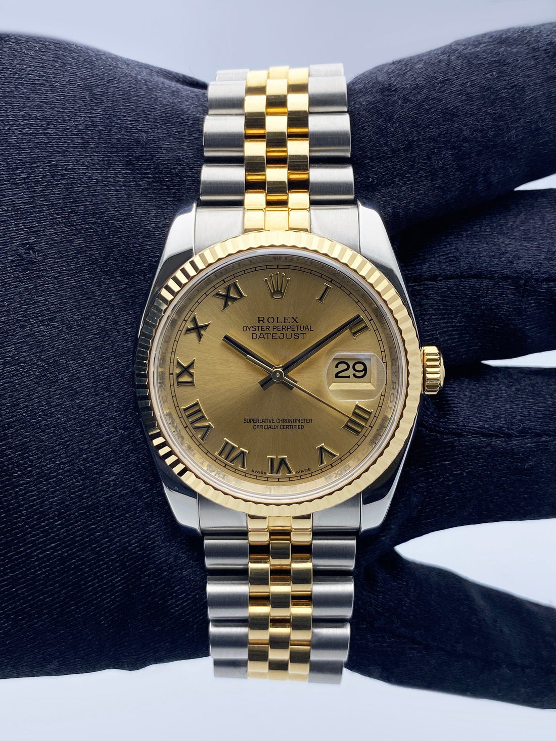 Rolex Datejust 116233 Mens Watch. 36mm stainless steel case. 18K yellow gold fluted bezel. Champagne dial with golden hands and golden Roman numeral hour marker. 18K yellow gold & stainless steel Jubilee bracelet with stainless steel hidden fold over clasp. Will fit up to 7-inch wrist. Sapphire crystal. Stainless steel case back. Automatic self winding movement. This watch comes with original Box and Papers.
