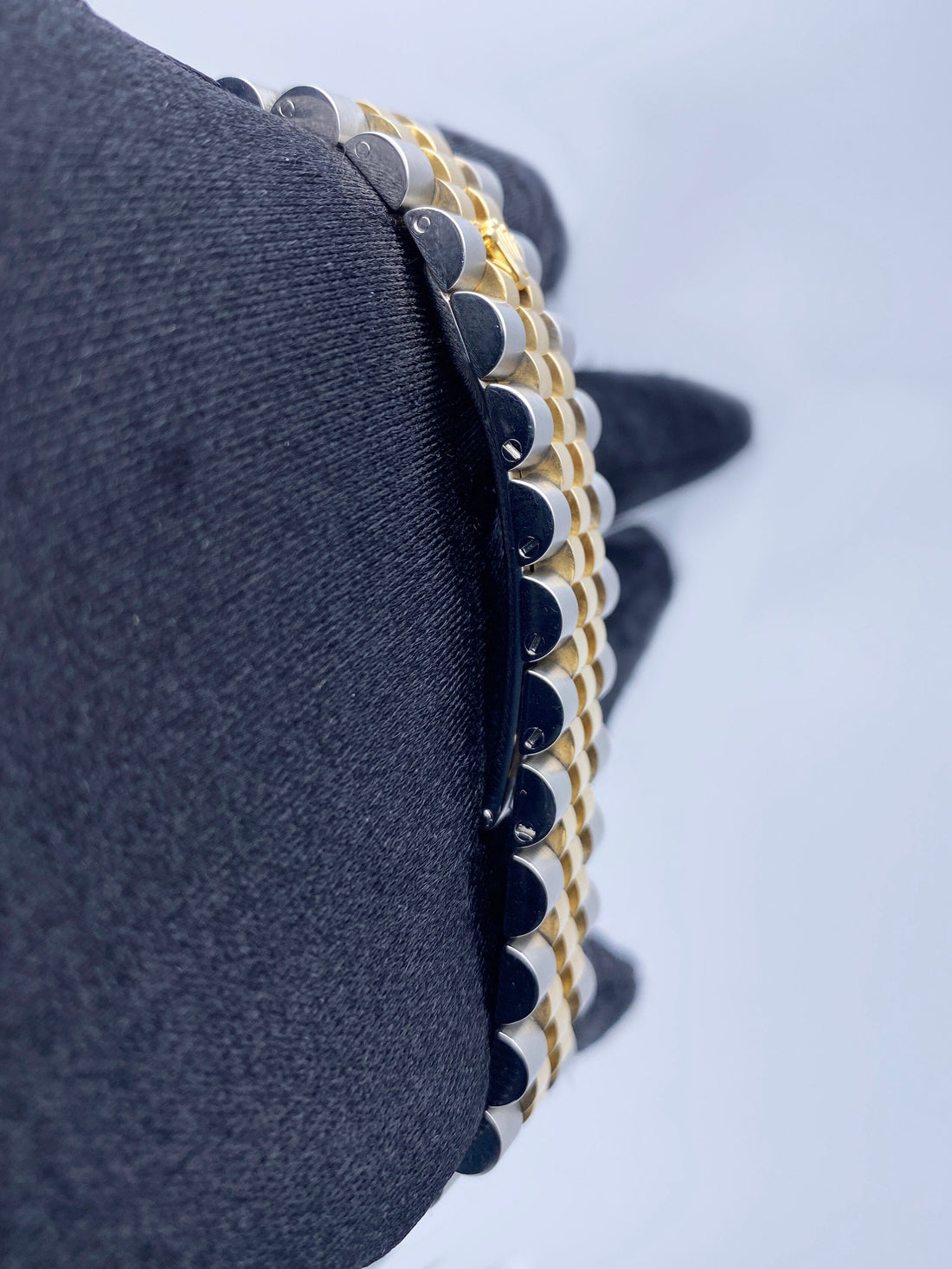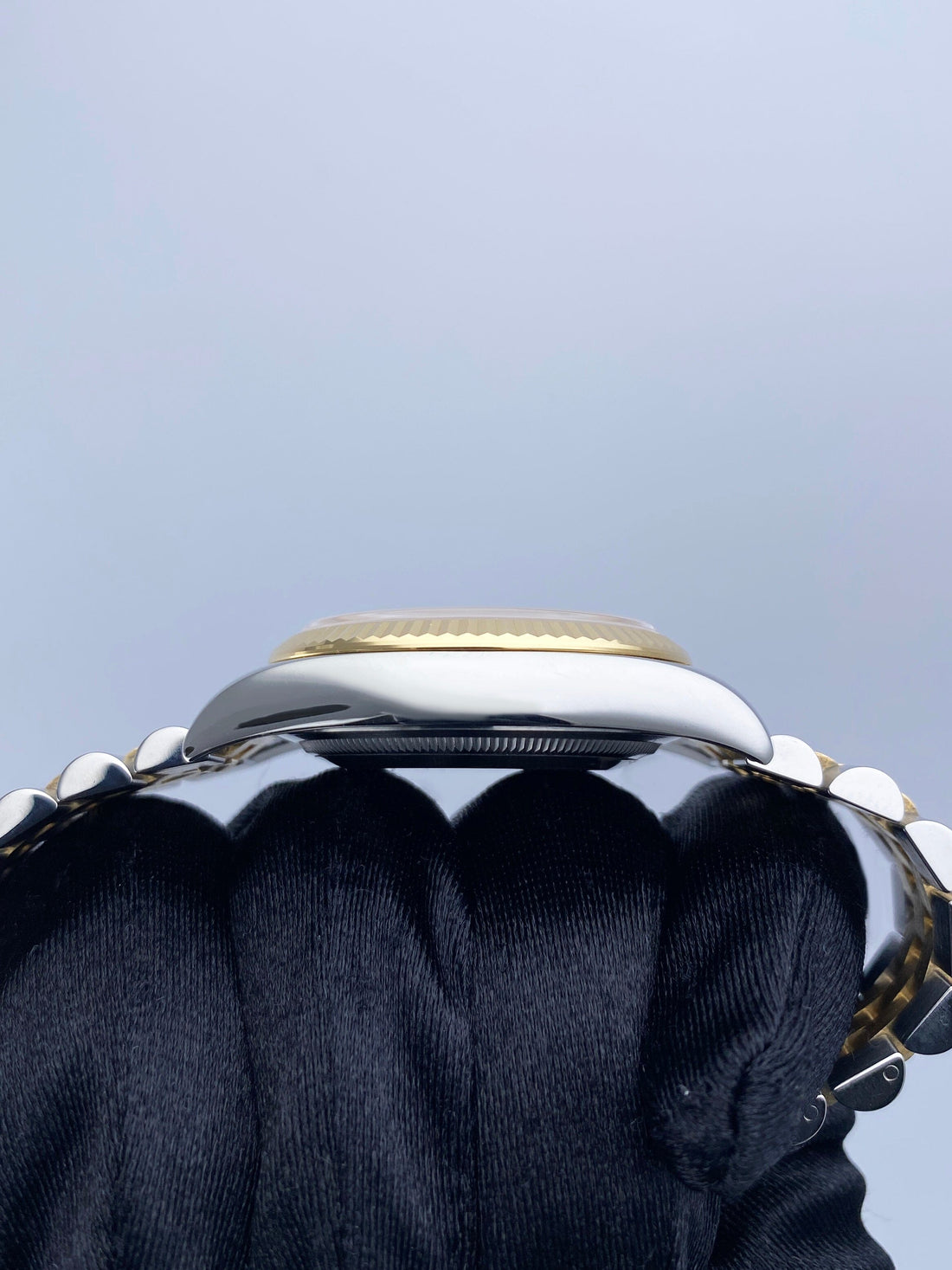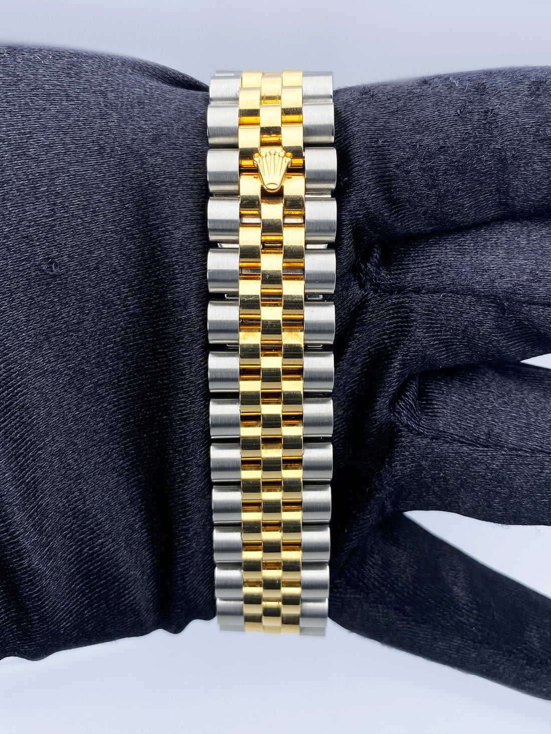 Rolex Datejust 116233 Mens Watch. 36mm stainless steel case. 18K yellow gold fluted bezel. Champagne dial with golden hands and golden Roman numeral hour marker. 18K yellow gold & stainless steel Jubilee bracelet with stainless steel hidden fold over clasp. Will fit up to 7-inch wrist. Sapphire crystal. Stainless steel case back. Automatic self winding movement. This watch comes with original Box and Papers.