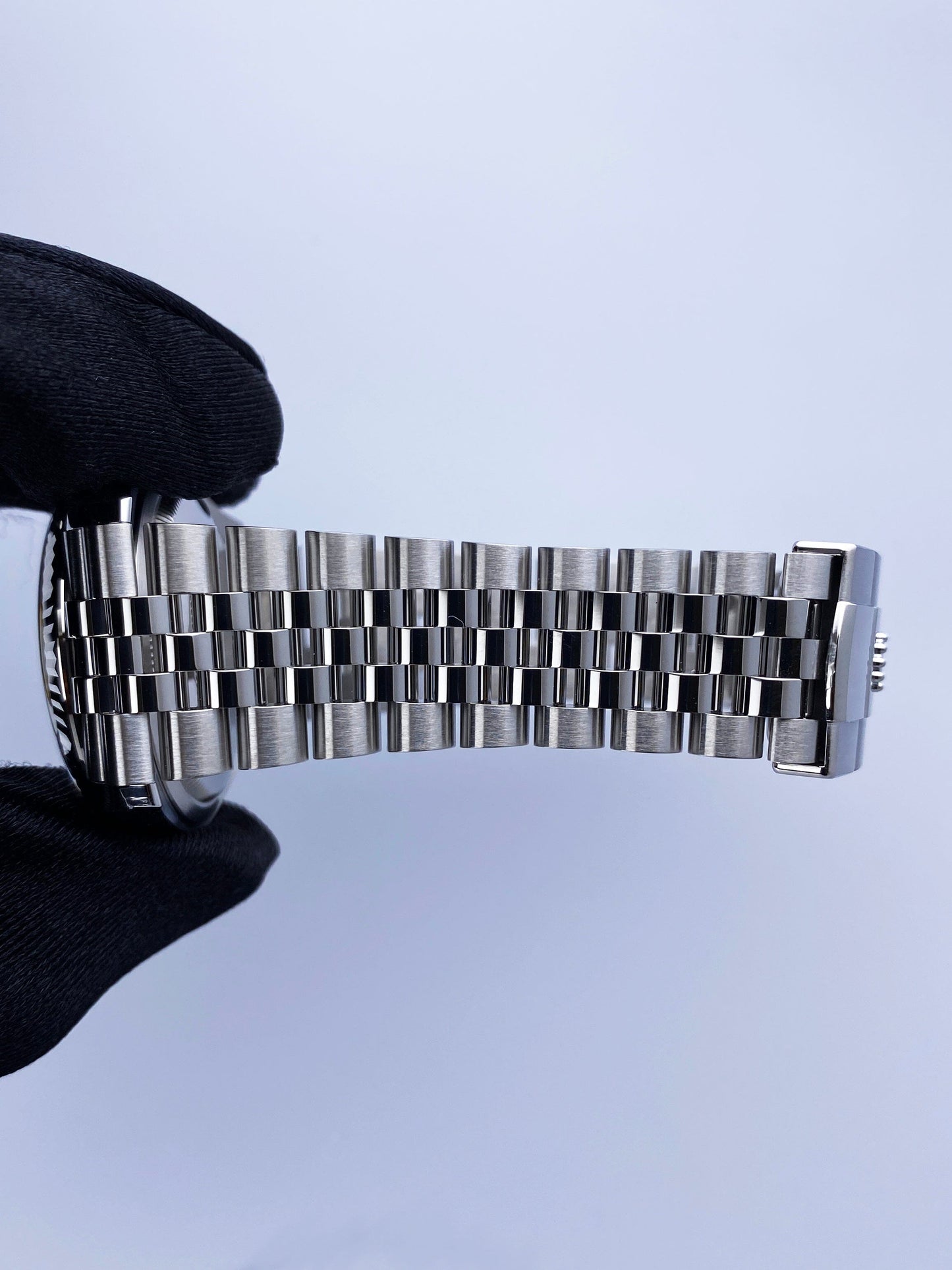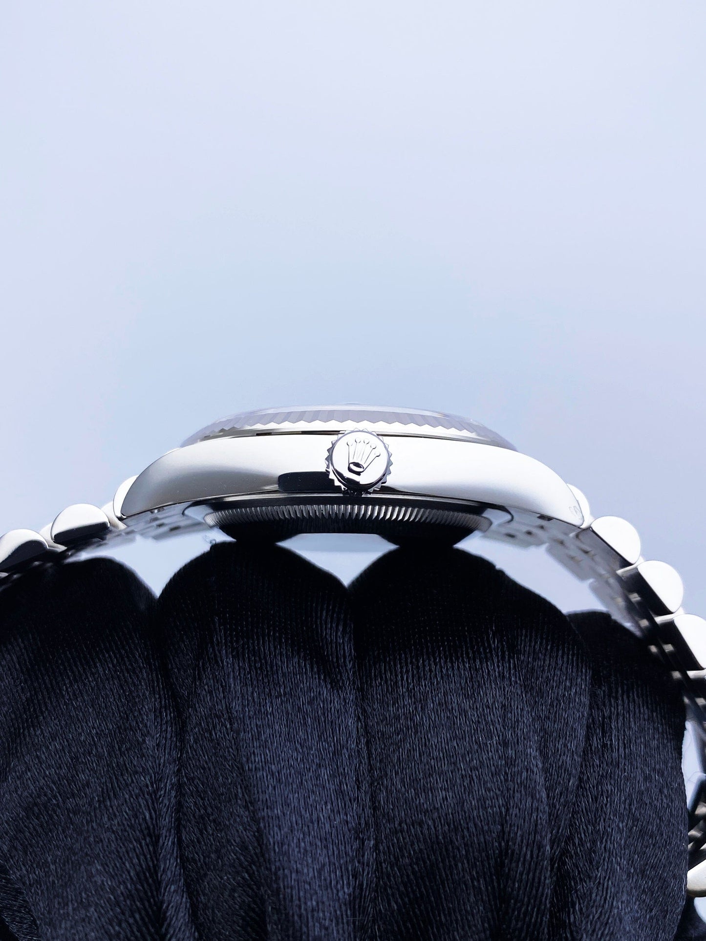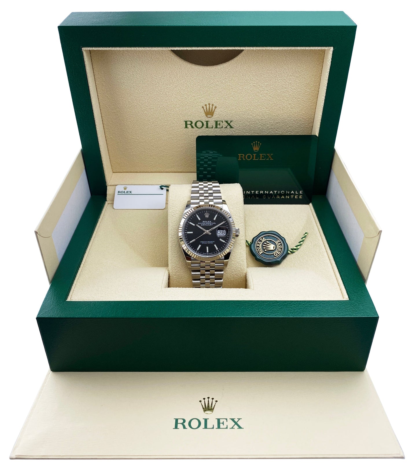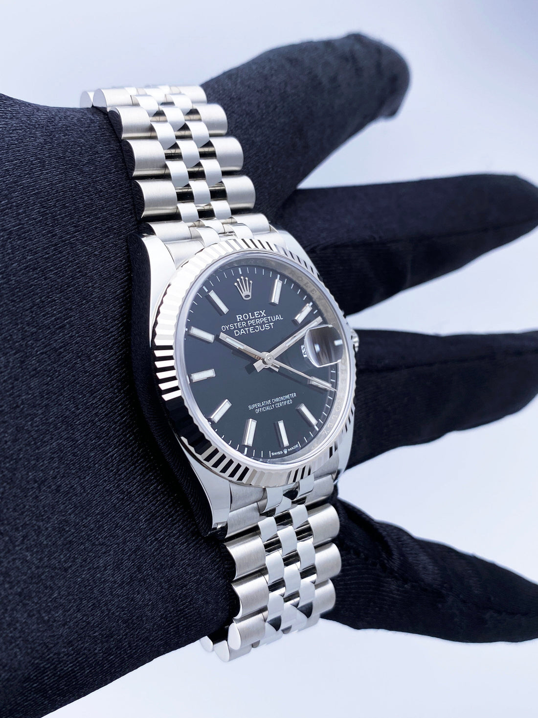 Rolex Datejust 126234 Mens Watch. 36mm stainless steel case with 18K white gold fluted bezel. Black dial with luminous silver hands and index hour marker. Date display at a 3 o'clock position. Stainless steel Jubilee bracelet with fold over clasp. Will fit up to a 7.5-Inch wrist. Sapphire crystal. Stainless steel case back. Automatic self-winding movement. This watch comes with original Box and Papers.