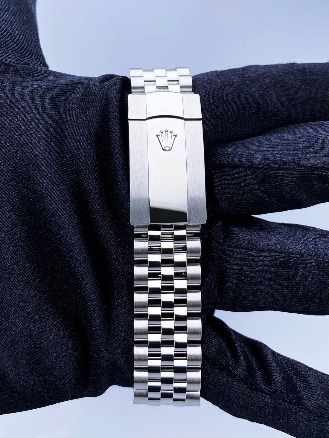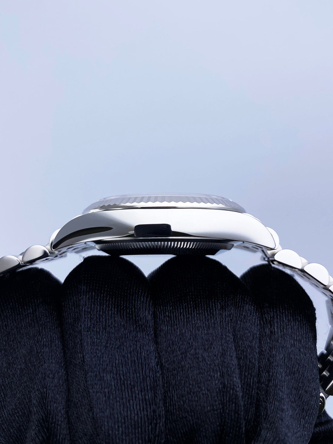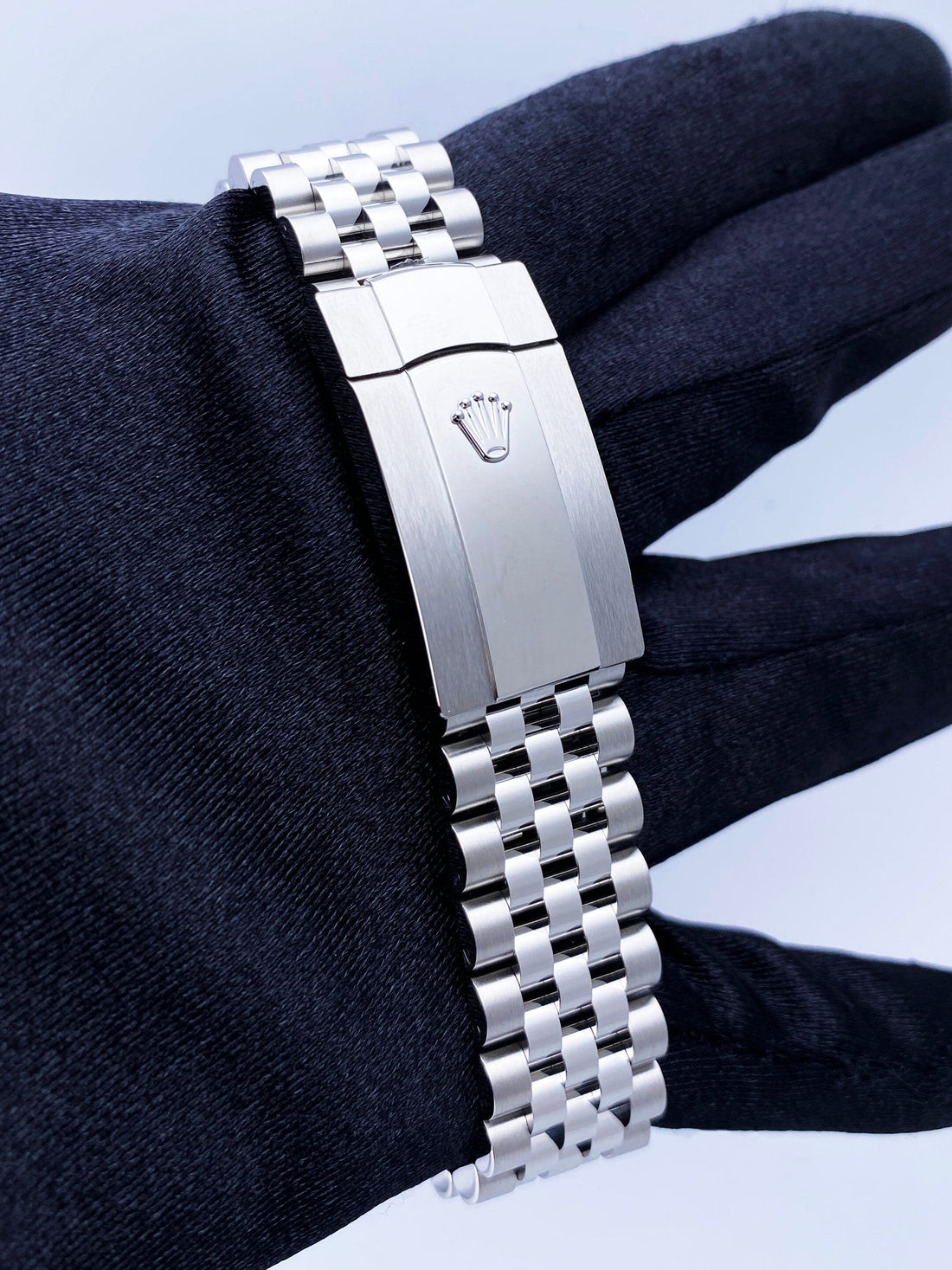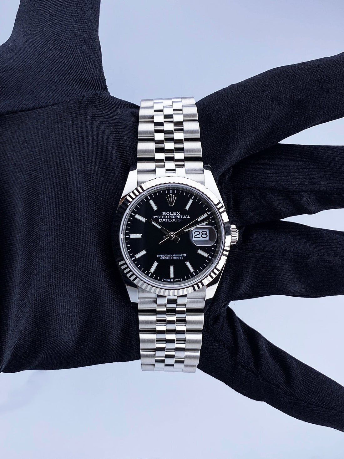 Rolex Datejust 126234 Mens Watch. 36mm stainless steel case with 18K white gold fluted bezel. Black dial with luminous silver hands and index hour marker. Date display at a 3 o'clock position. Stainless steel Jubilee bracelet with fold over clasp. Will fit up to a 7.5-Inch wrist. Sapphire crystal. Stainless steel case back. Automatic self-winding movement. This watch comes with original Box and Papers.