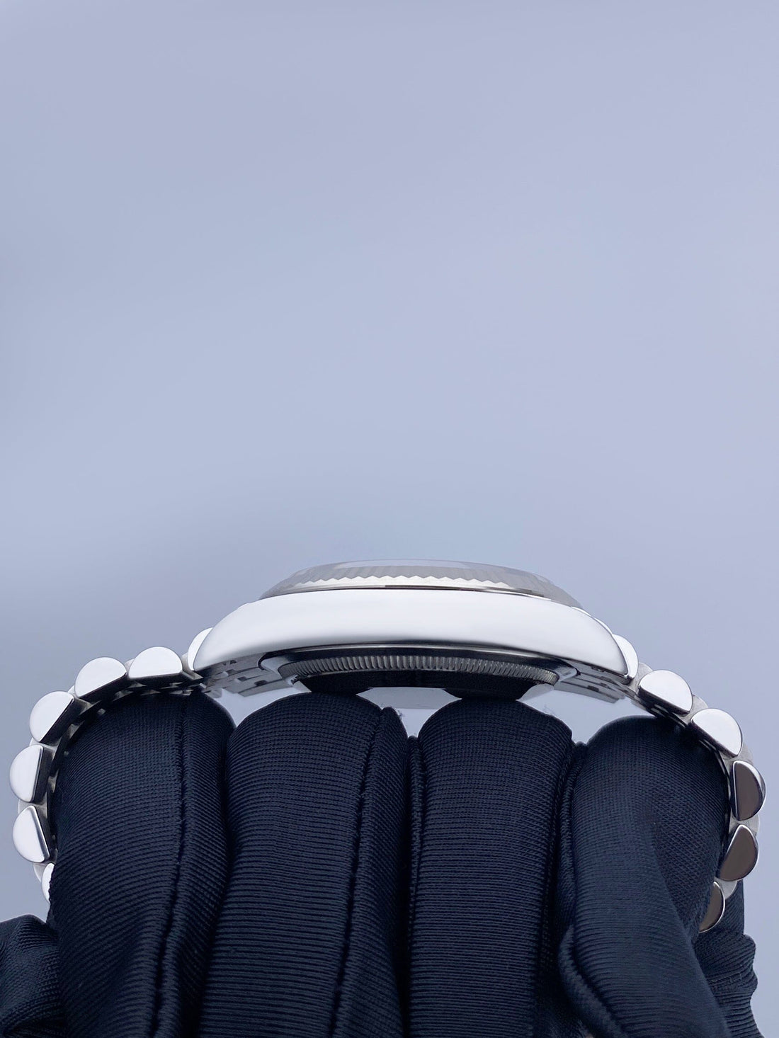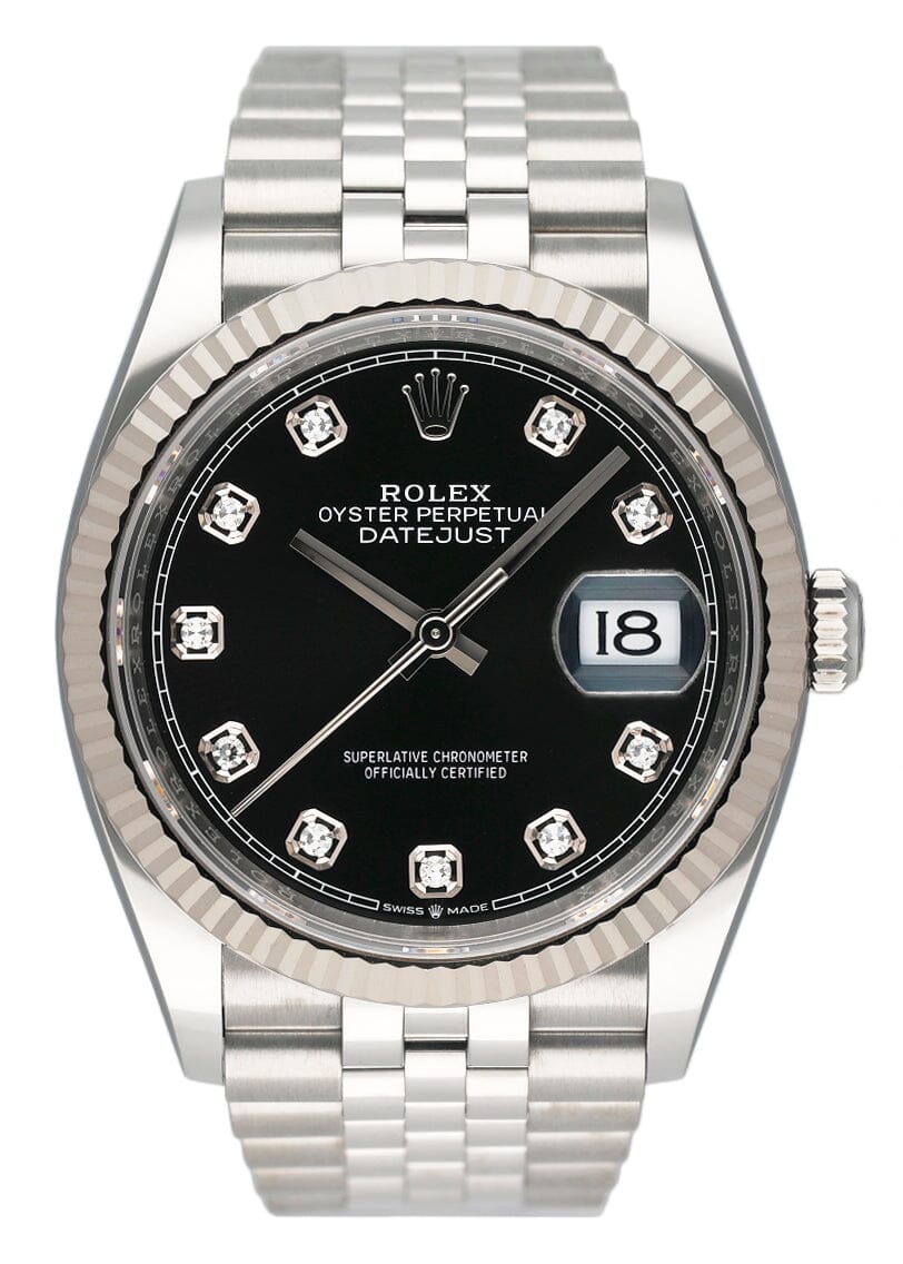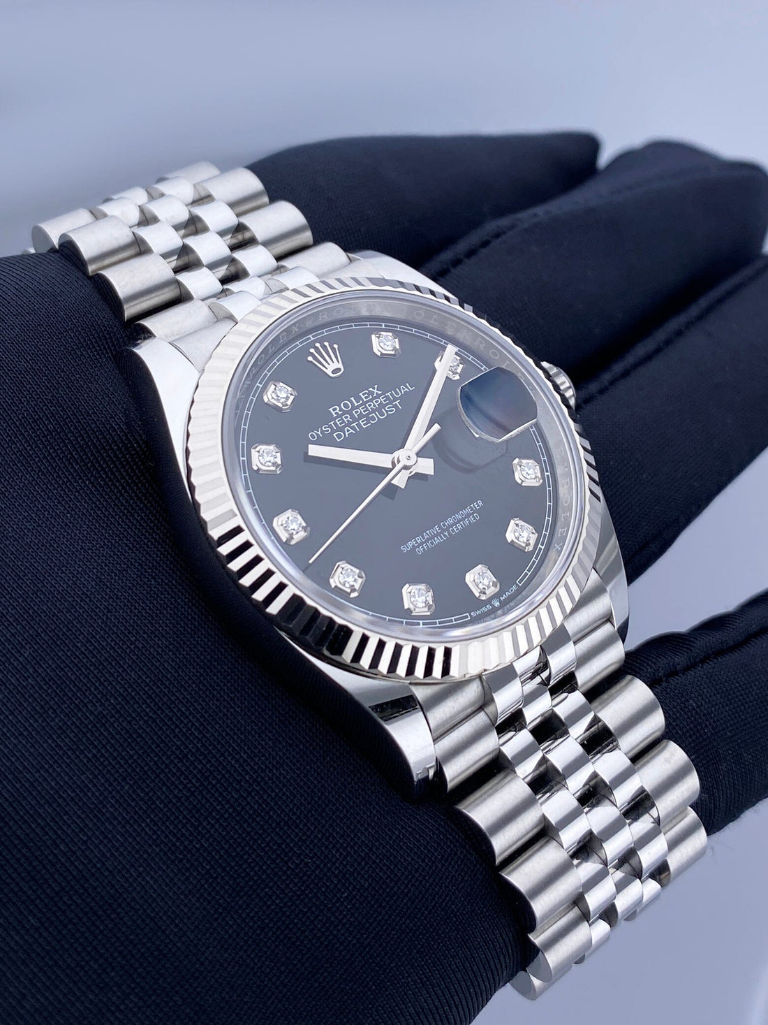 Rolex Datejust 126234 Mens Watch. 36mm stainless steel case with 18K white gold fluted bezel. Black dial with luminous silver hands and factory diamond hour marker. Date display at a 3 o'clock position. Stainless steel Jubilee bracelet with fold over clasp. Will fit up to a 7-Inch wrist. Sapphire crystal. Stainless steel case back. Automatic self-winding movement. This watch comes with original Box and Papers.