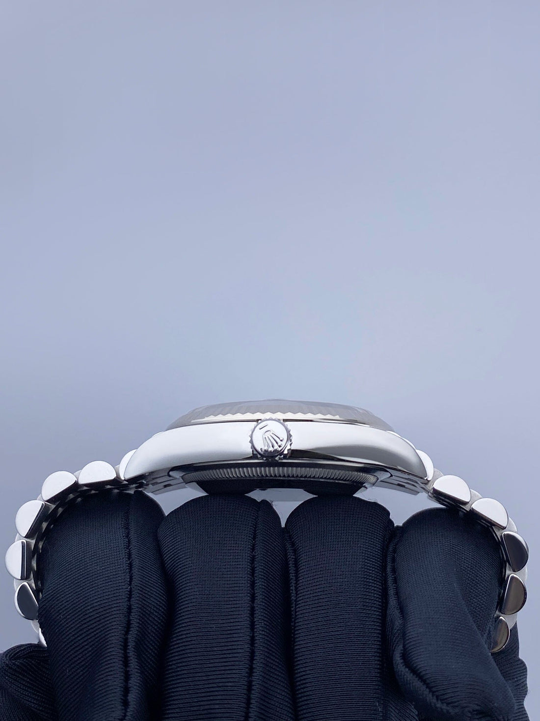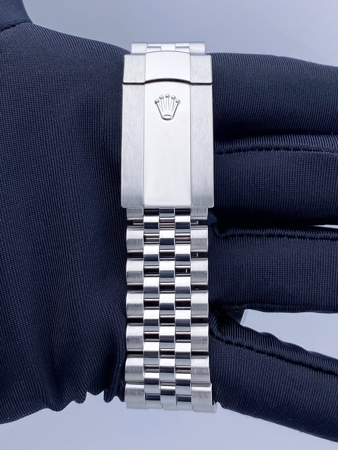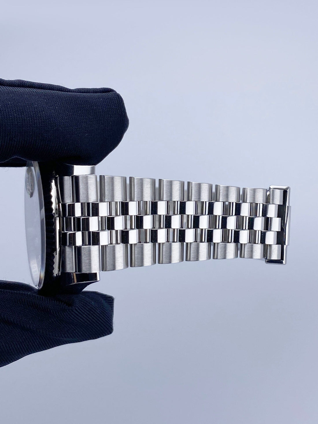 Rolex Datejust 126234 Mens Watch. 36mm stainless steel case with 18K white gold fluted bezel. Black dial with luminous silver hands and factory diamond hour marker. Date display at a 3 o'clock position. Stainless steel Jubilee bracelet with fold over clasp. Will fit up to a 7-Inch wrist. Sapphire crystal. Stainless steel case back. Automatic self-winding movement. This watch comes with original Box and Papers.