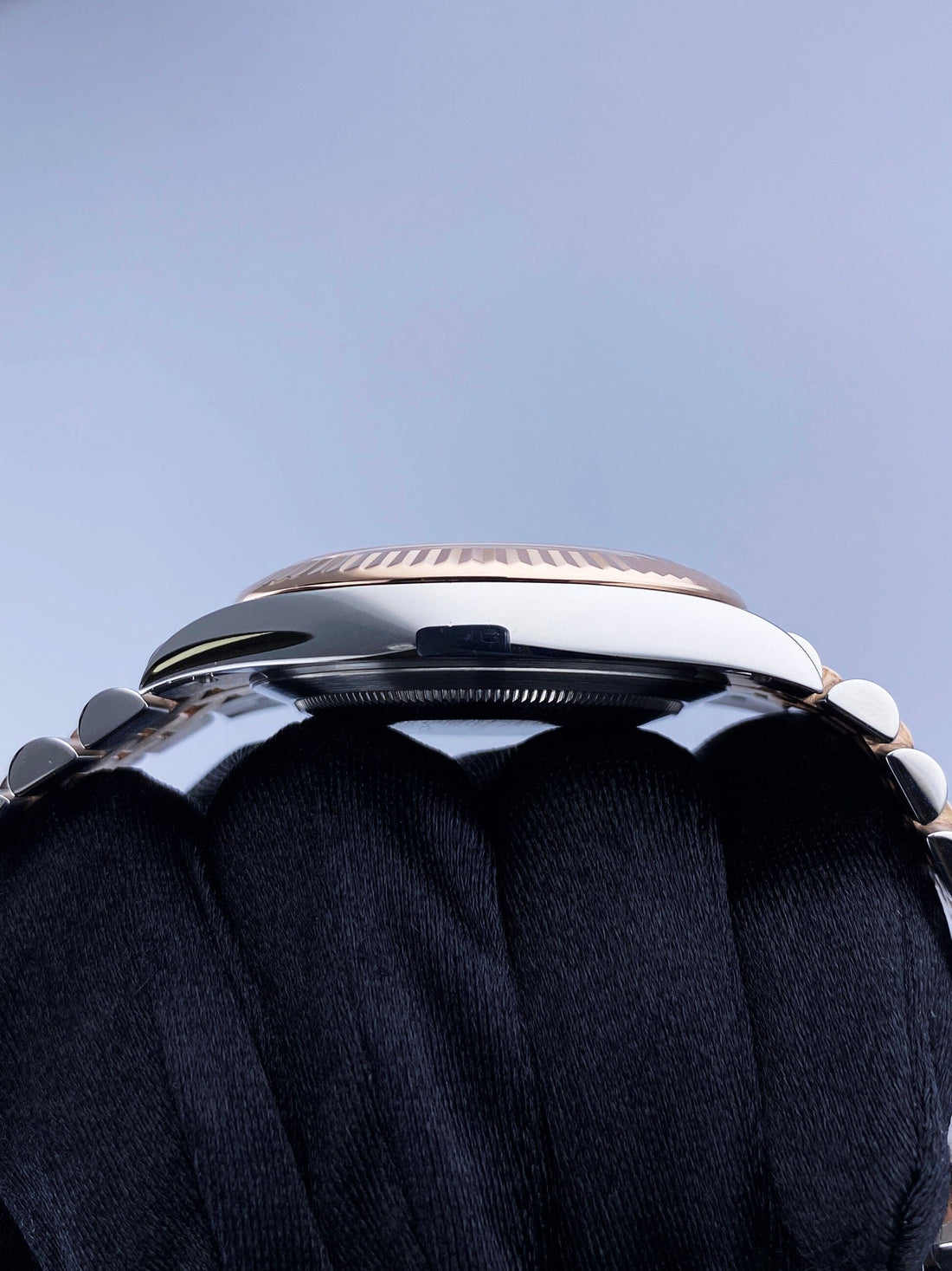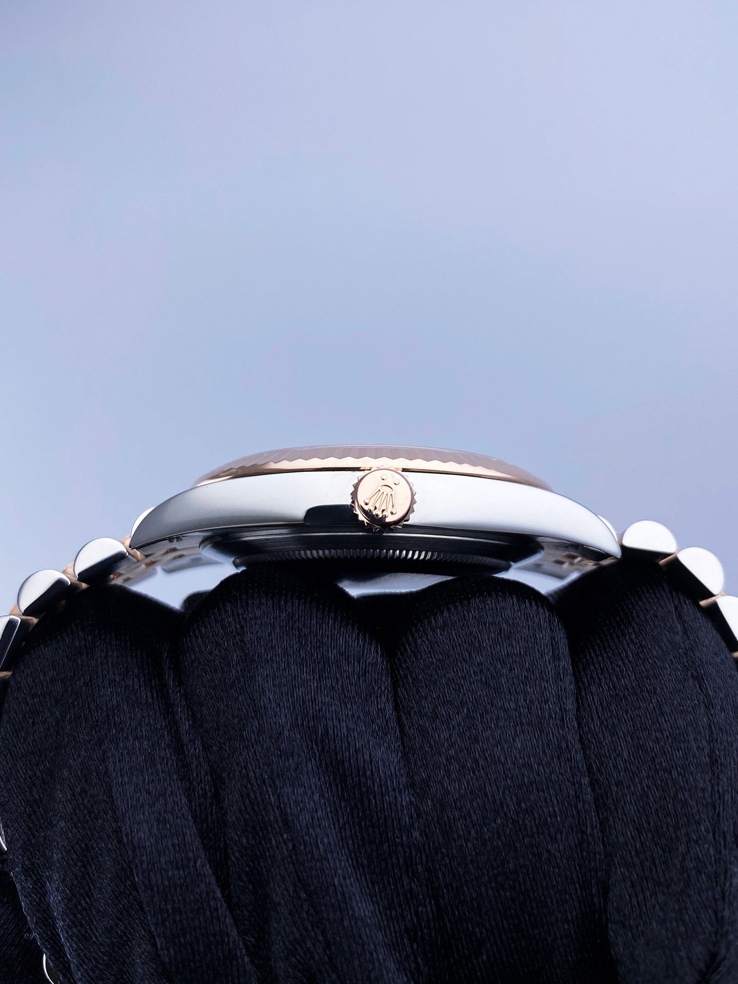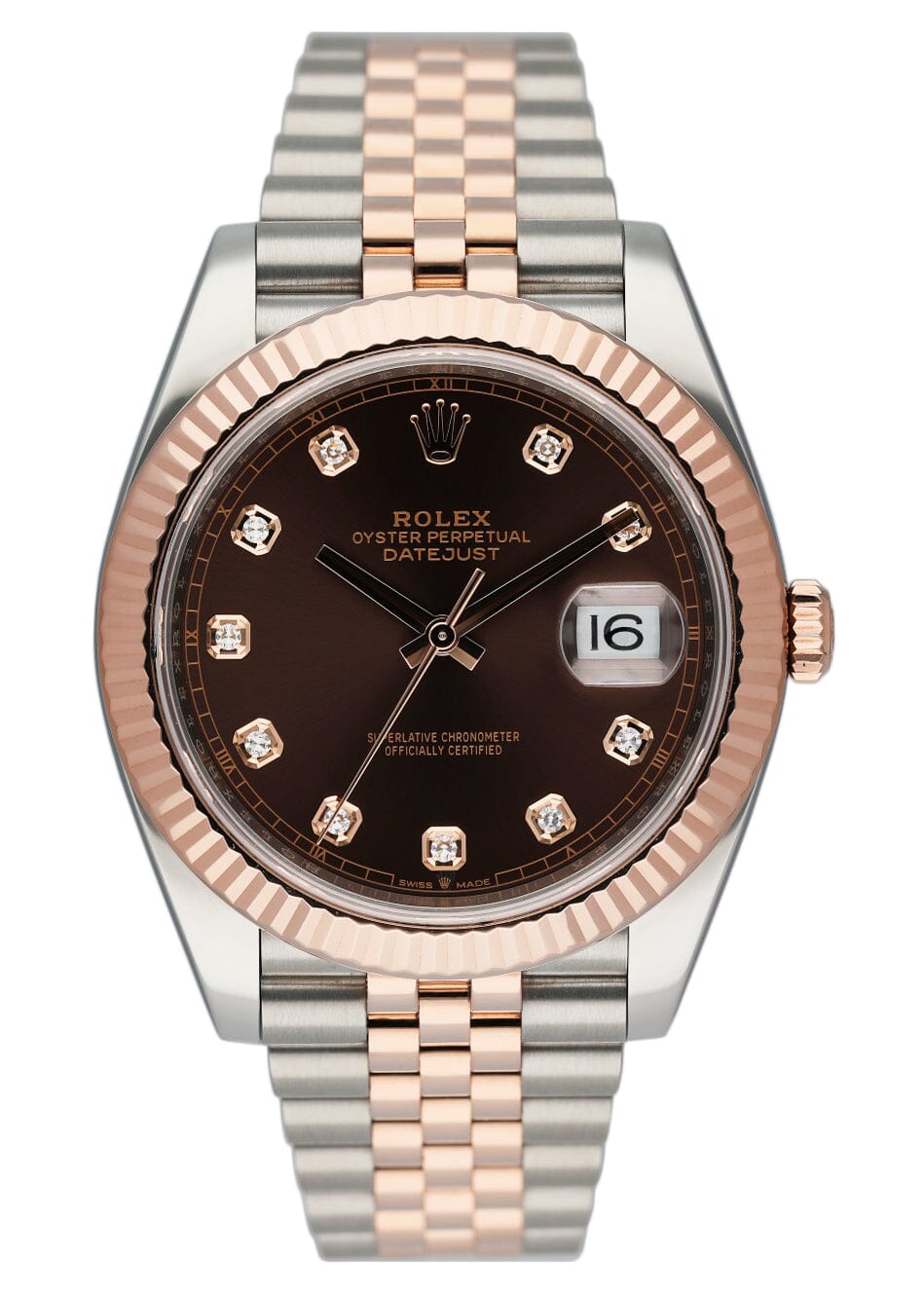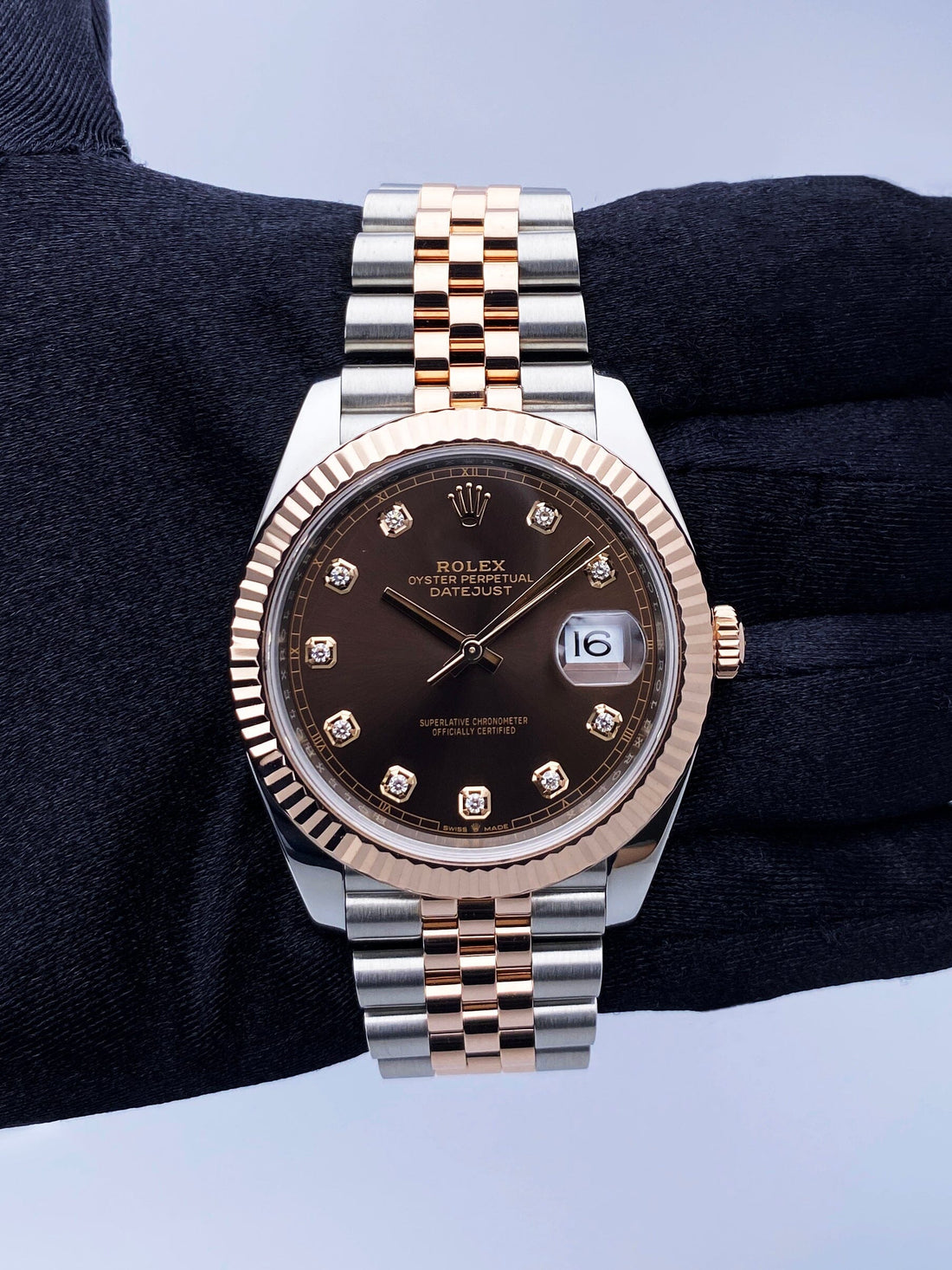 Rolex Oyster Perpetual Datejust 41 126331 Mens Watch. 41mm stainless steel case with 18K rose gold fluted bezel. Chocolate dial with luminous rose gold hands and original factory diamond set hour marker. Date display at the 3 o'clock position. Stainless steel & 18K rose gold Jubilee bracelet with fold-over clasp. Will fit up to 7-Inch wrist. Sapphire crystal. Stainless steel case back. Calibre 3235 automatic self-winding movement. This watch comes with original Box and Papers.