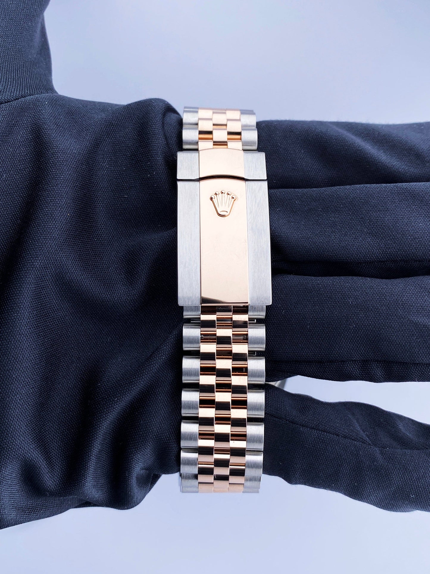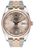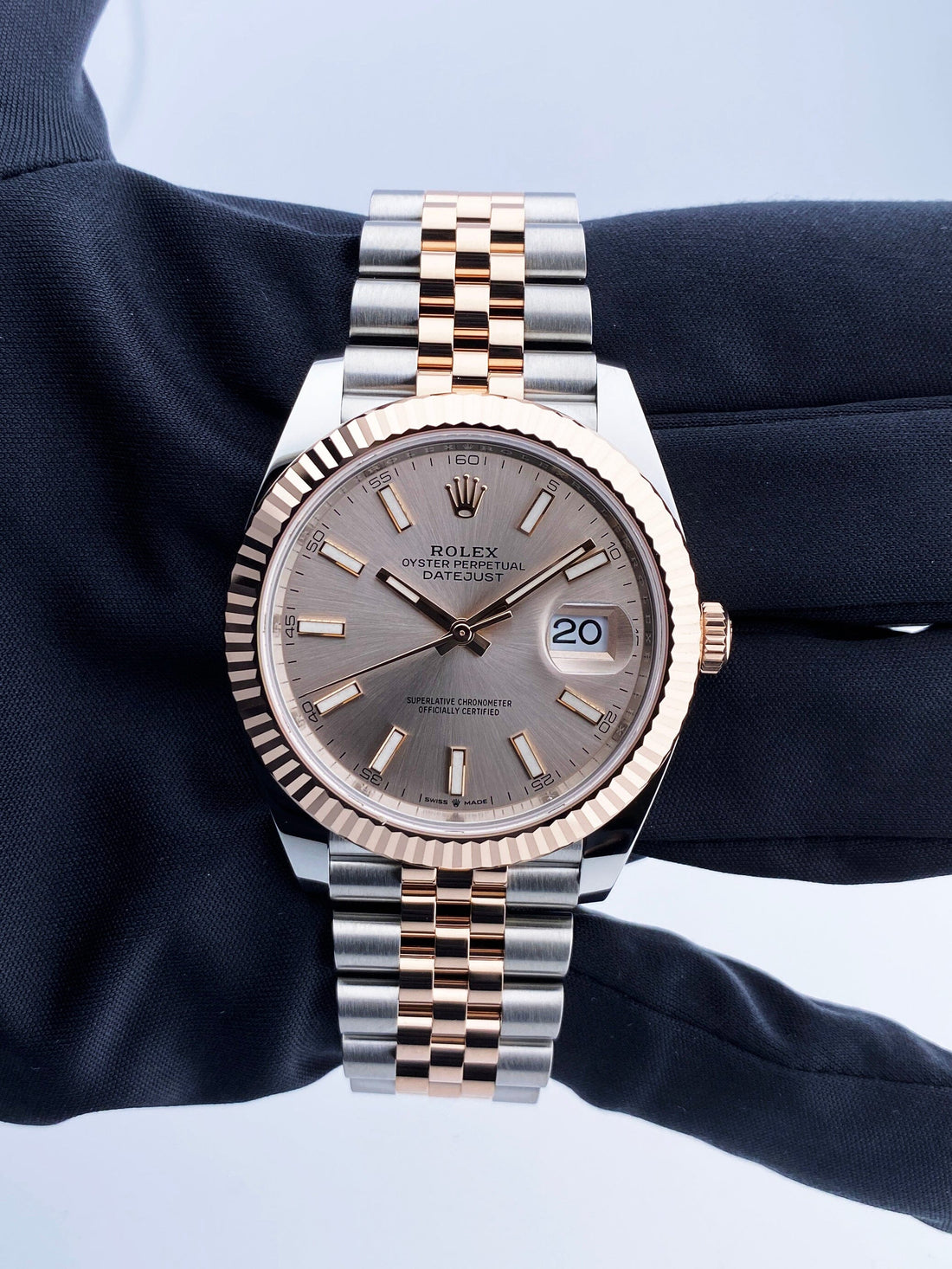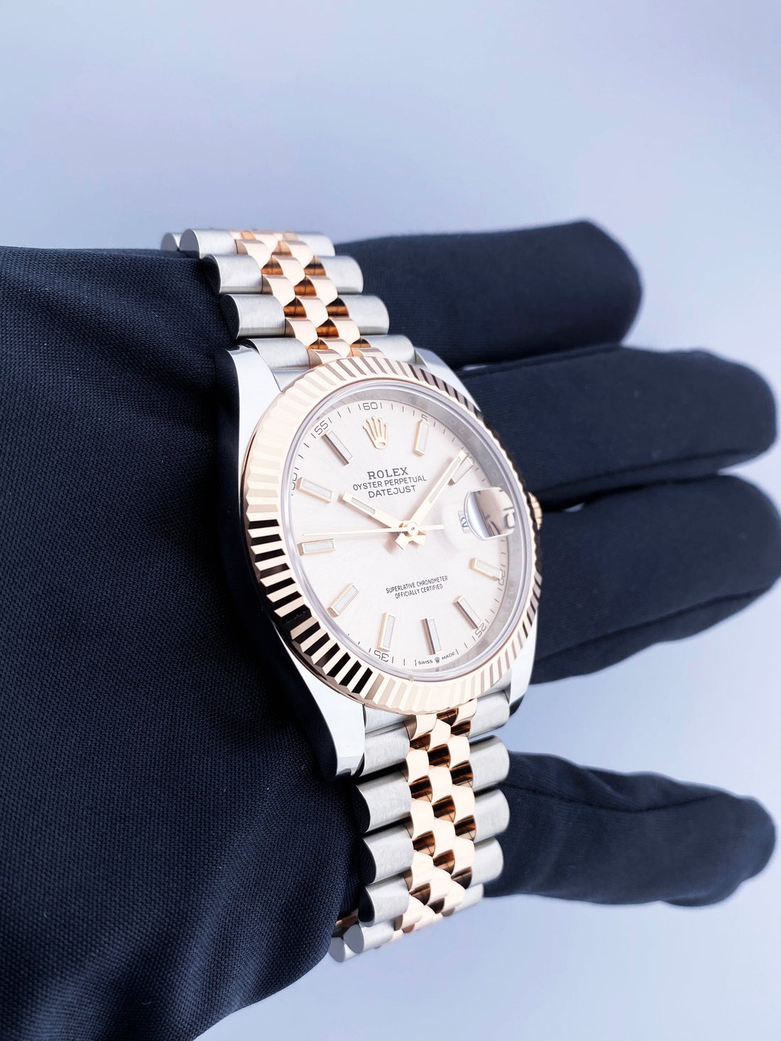 Rolex Oyster Perpetual Datejust 41 126331 Mens Watch. 41mm stainless steel case with 18K rose gold fluted bezel. Sundust dial with luminous rose gold hands and luminous index hour marker. Date display at the 3 o'clock position. Stainless steel & 18K rose gold Jubilee bracelet with fold-over clasp. Will fit up to 7.5-Inch wrist. Sapphire crystal. Stainless steel case back. Calibre 3235 automatic self-winding movement. This will come with Box and Papers.