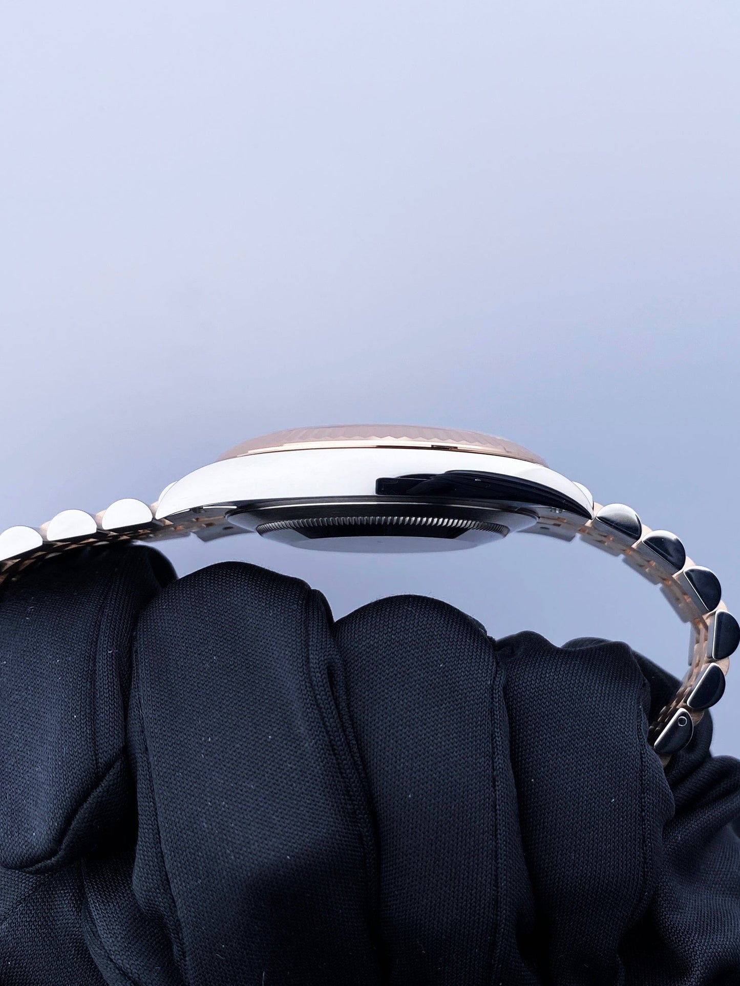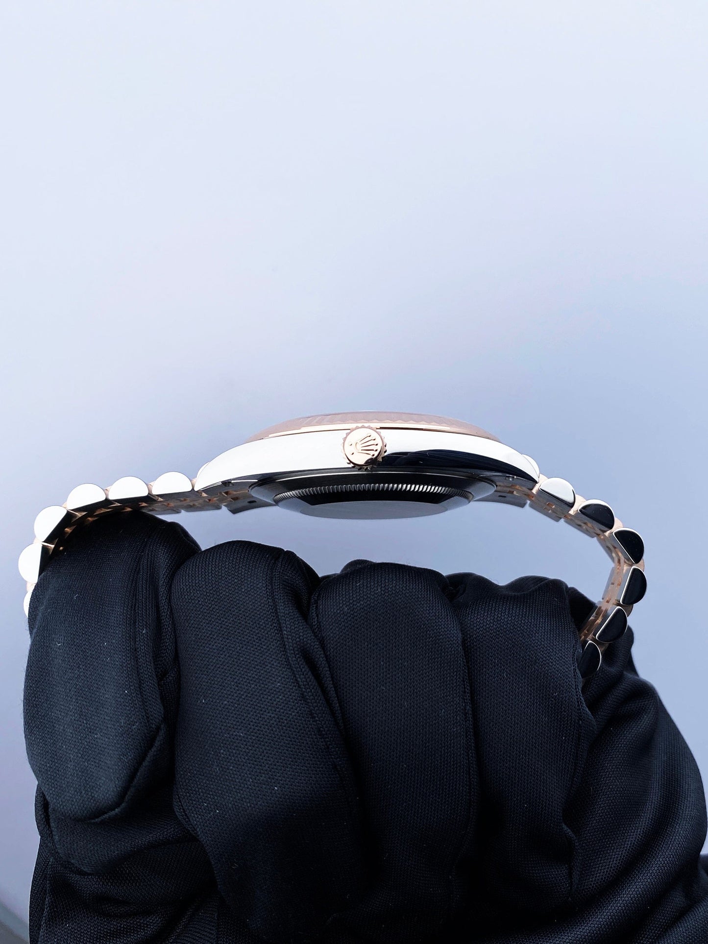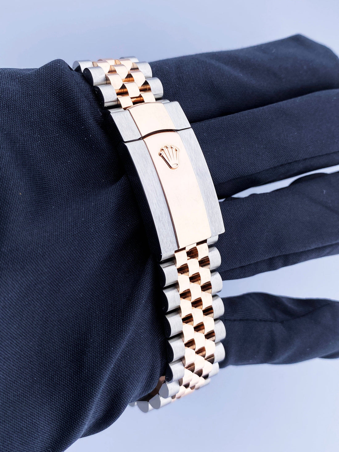 Rolex Oyster Perpetual Datejust 41 126331 Mens Watch. 41mm stainless steel case with 18K rose gold fluted bezel. Sundust dial with luminous rose gold hands and luminous index hour marker. Date display at the 3 o'clock position. Stainless steel & 18K rose gold Jubilee bracelet with fold-over clasp. Will fit up to 7.5-Inch wrist. Sapphire crystal. Stainless steel case back. Calibre 3235 automatic self-winding movement. This will come with Box and Papers.