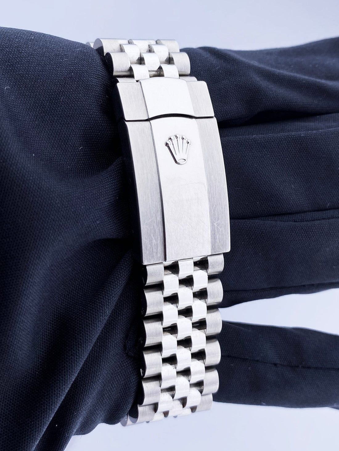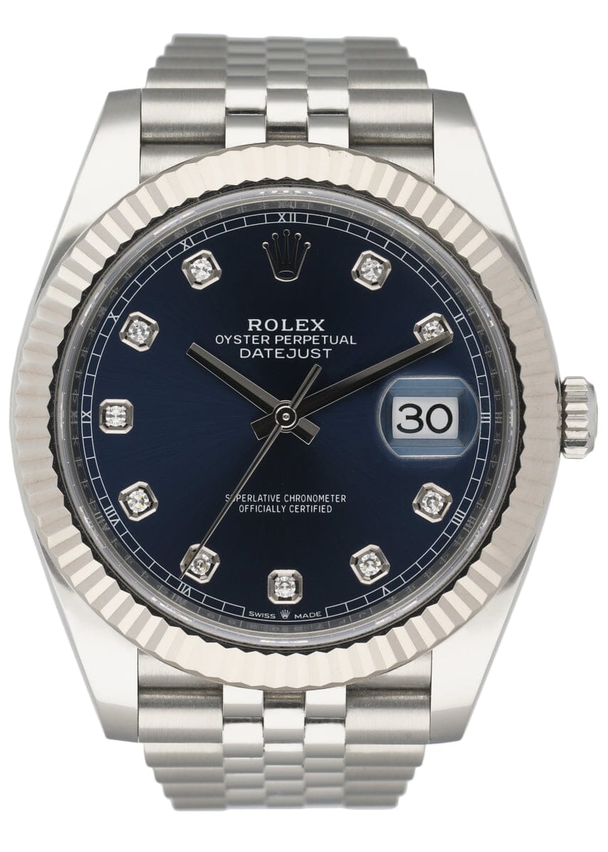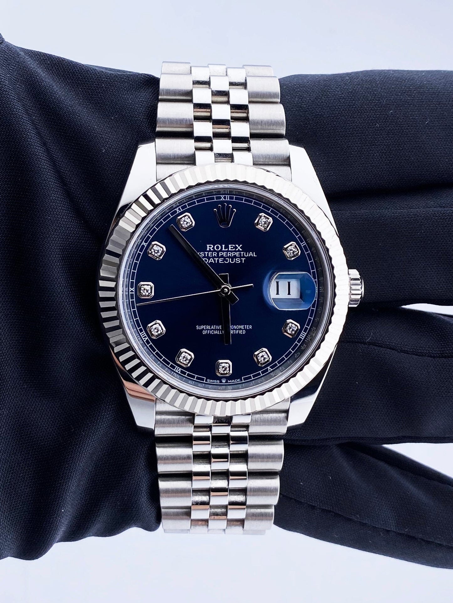 Rolex Datejust 41 126334 Mens Watch. 41mm stainless steel case. 18K White gold fluted bezel. Blue dial with white silver hands and factory diamond hour marker. Date display at a 3 o'clock position. Stainless steel jubilee bracelet with fold over clasp. Will fit up to a 7.5-Inch wrist. Sapphire crystal and stainless steel case back. Automatic-self winding movement. This watch comes with original Box and Papers.