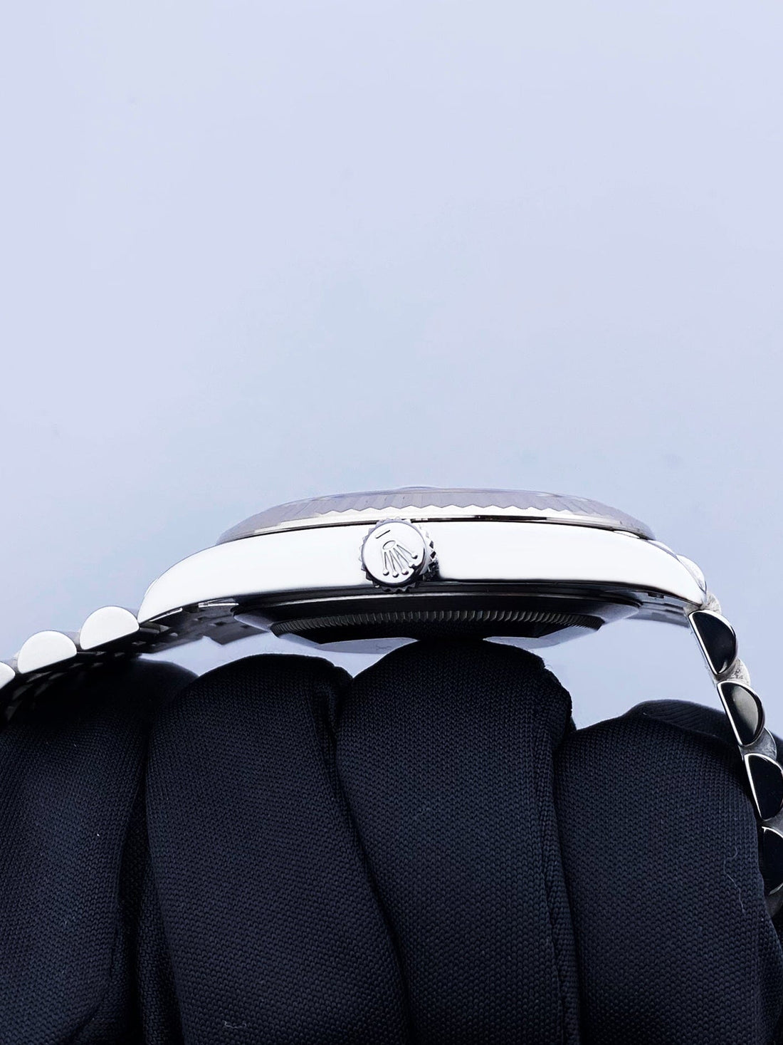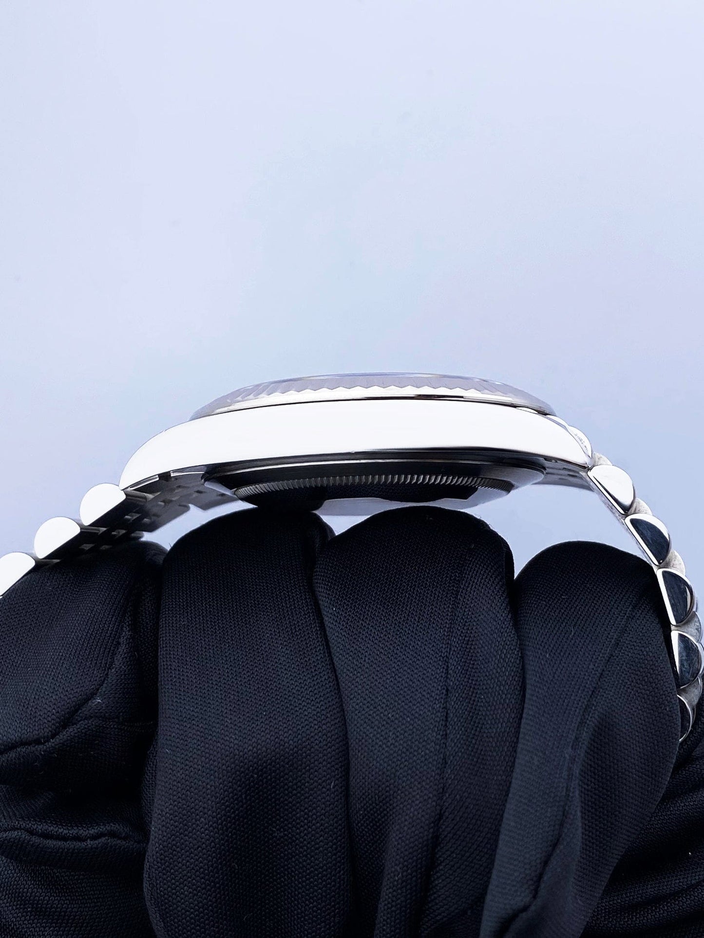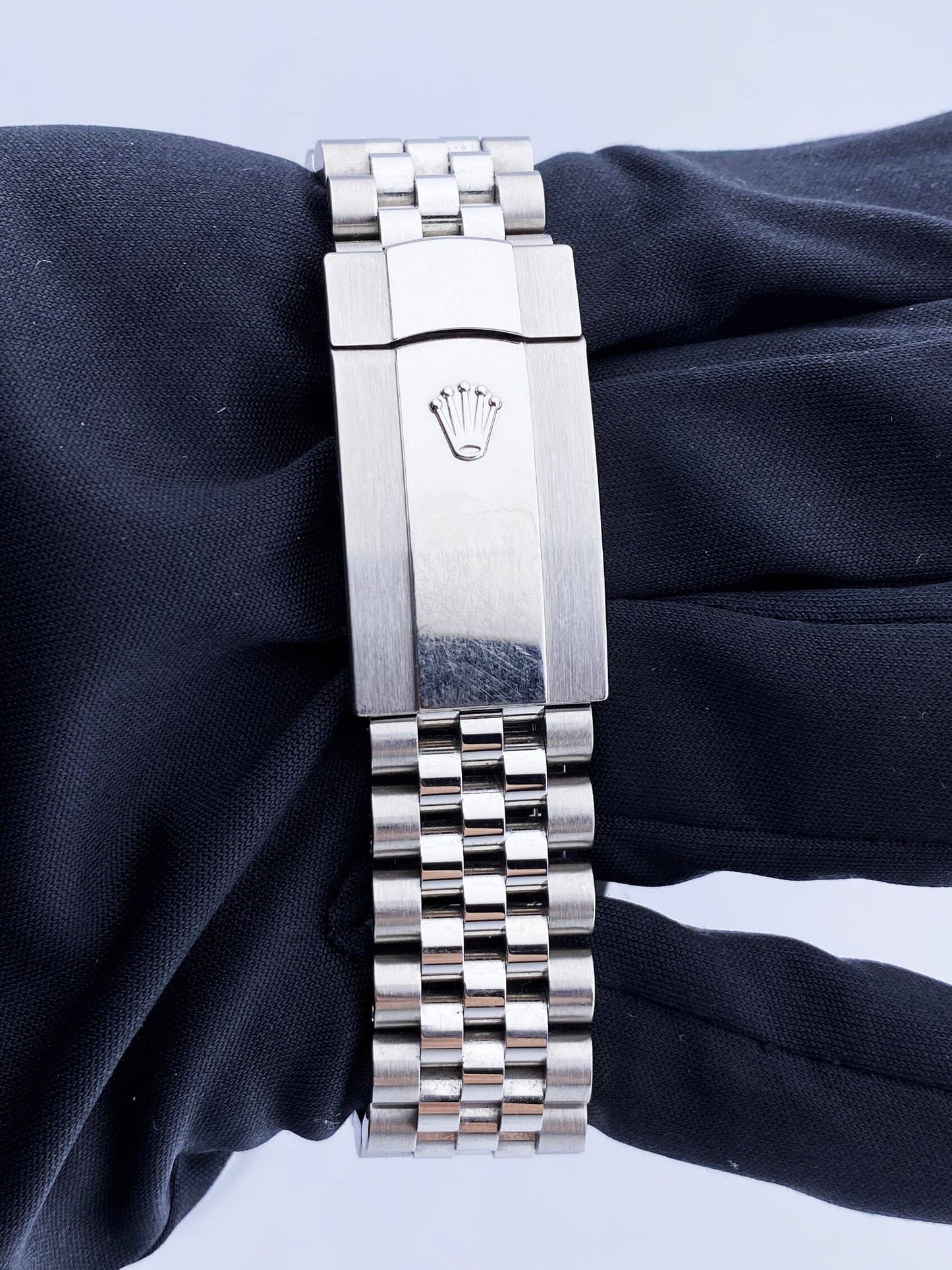 Rolex Datejust 41 126334 Mens Watch. 41mm stainless steel case. 18K White gold fluted bezel. Blue dial with white silver hands and factory diamond hour marker. Date display at a 3 o'clock position. Stainless steel jubilee bracelet with fold over clasp. Will fit up to a 7.5-Inch wrist. Sapphire crystal and stainless steel case back. Automatic-self winding movement. This watch comes with original Box and Papers.