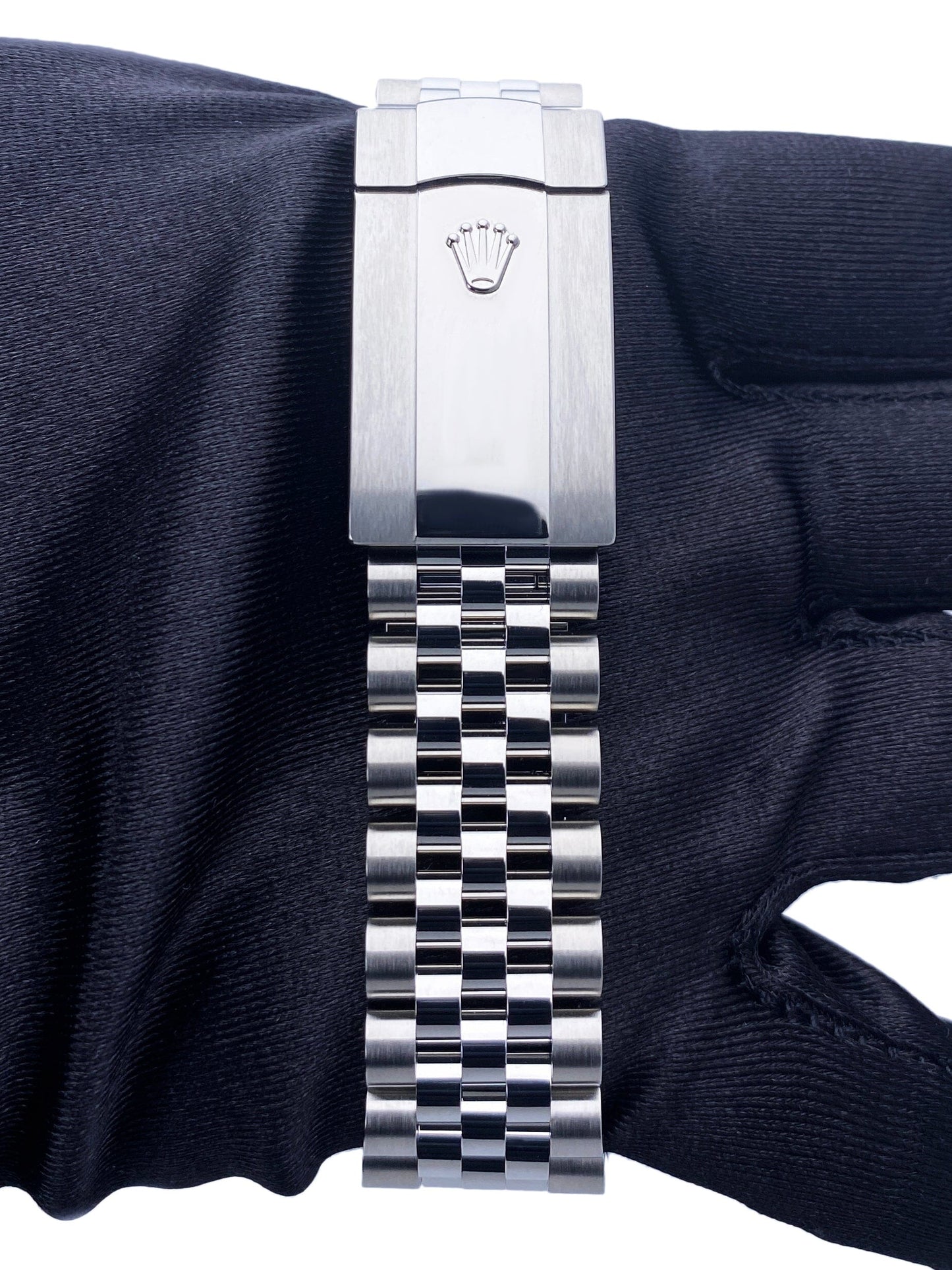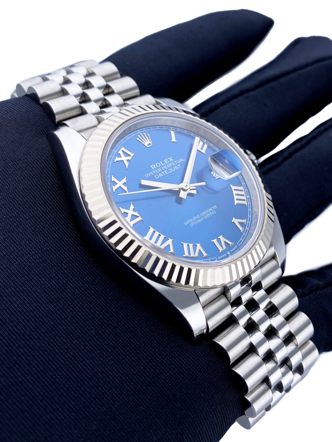 Rolex Datejust 126334 Mens Watch. 41mm stainless steel case with 18K white gold fluted bezel. Blue dial with luminous silver hands and Roman numeral hour marker. Date display at a 3 o'clock position. Stainless steel Jubilee bracelet with fold over clasp. Will fit up to a 7.5-Inch wrist. Sapphire crystal. Stainless steel case back. Automatic self-winding movement. This watch comes with original Box and Papers.