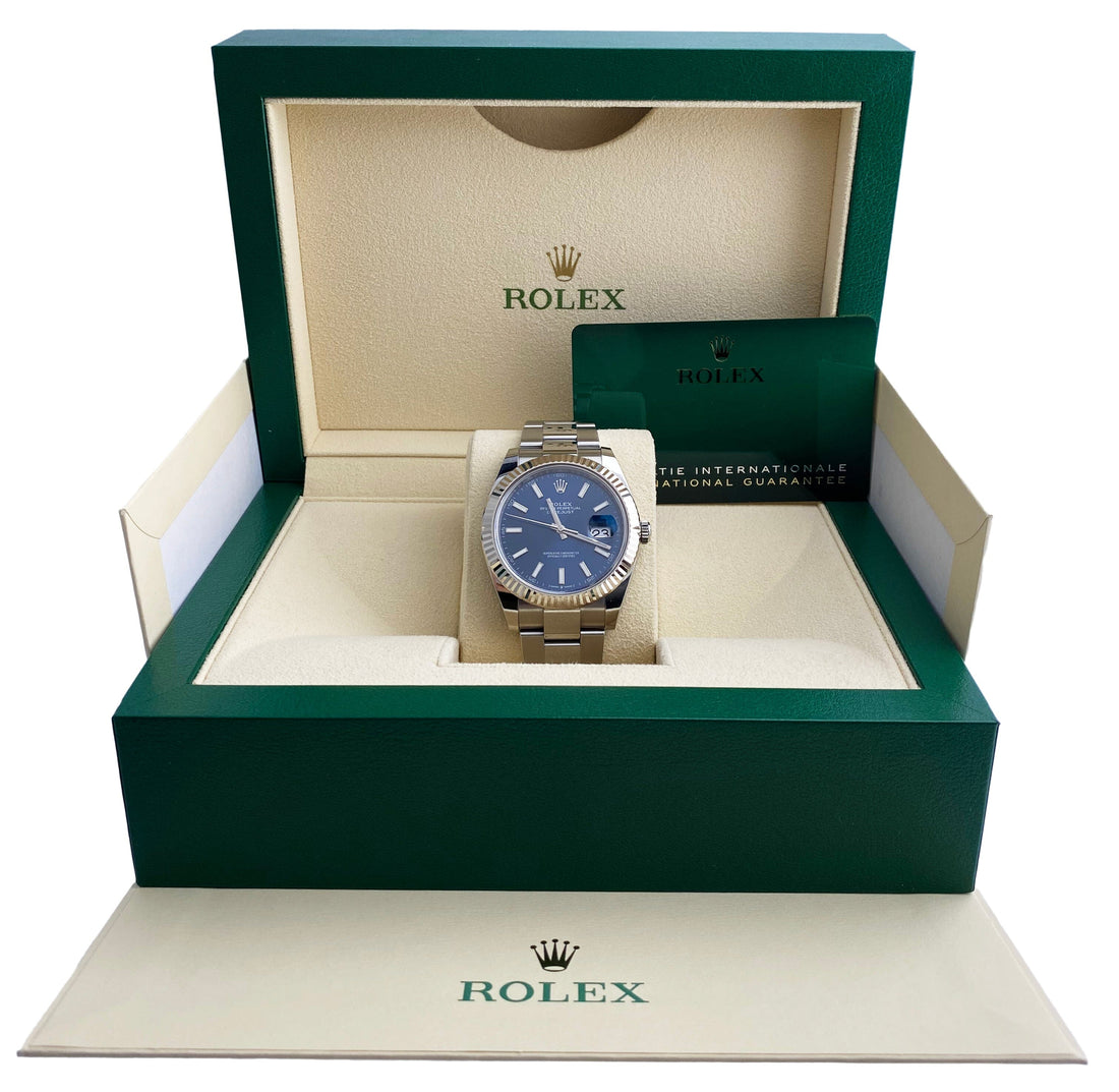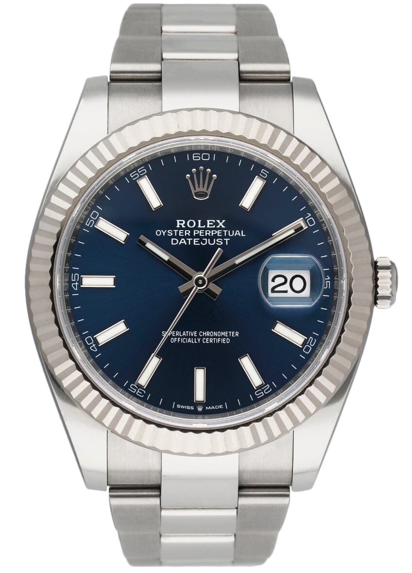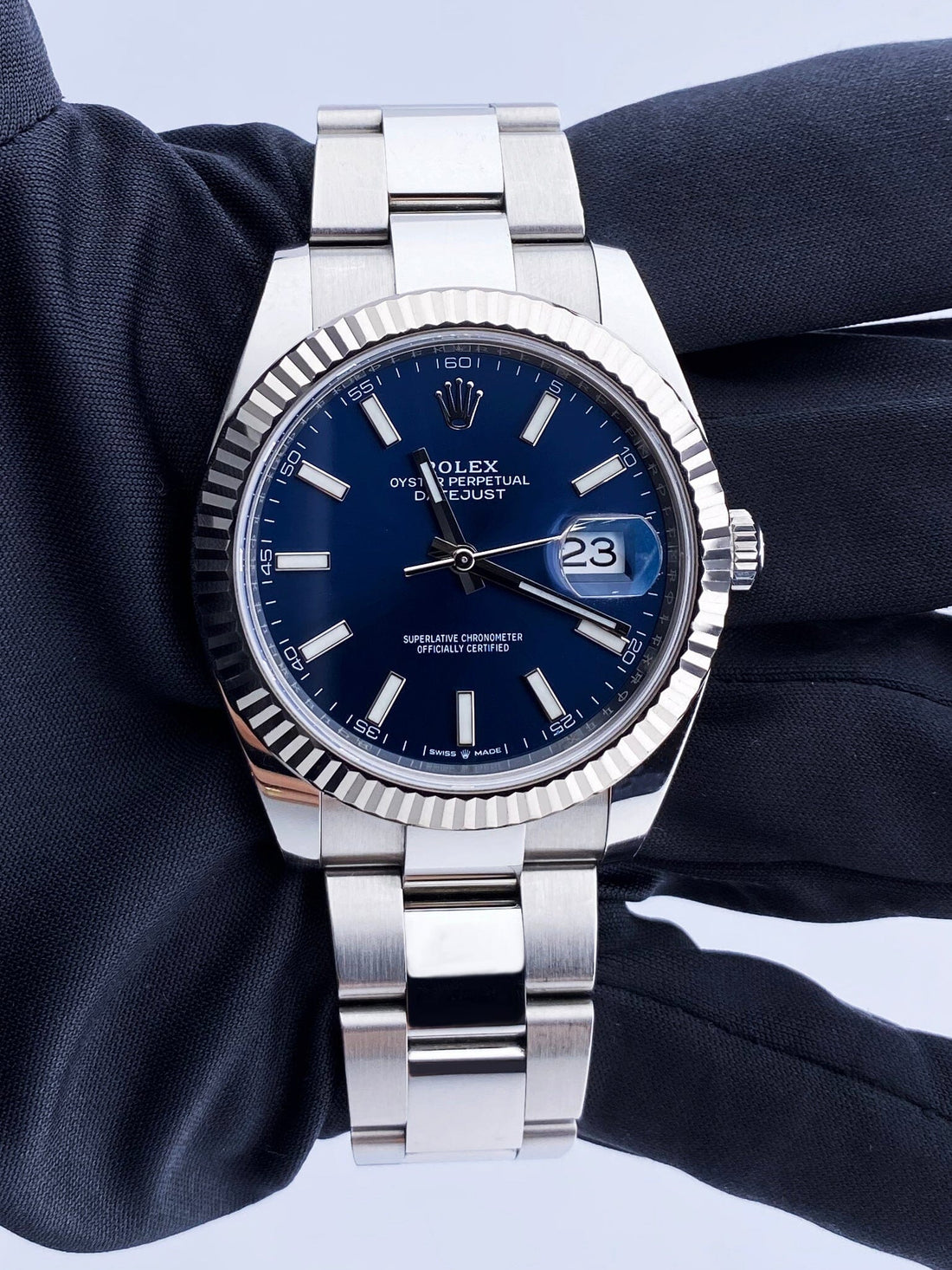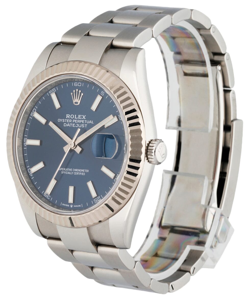 Rolex Datejust 41 126334 Mens Watch. 41mm stainless steel case with 18K White gold fluted bezel. Blue dial with silver hands and Index hour marker. Date display at a 3 o'clock position. Stainless steel Oyster bracelet with fold over clasp. Will fit up to a 7.5-Inch wrist. Sapphire crystal and stainless steel case back. Automatic-self winding movement. This watch comes with original Box and Papers.