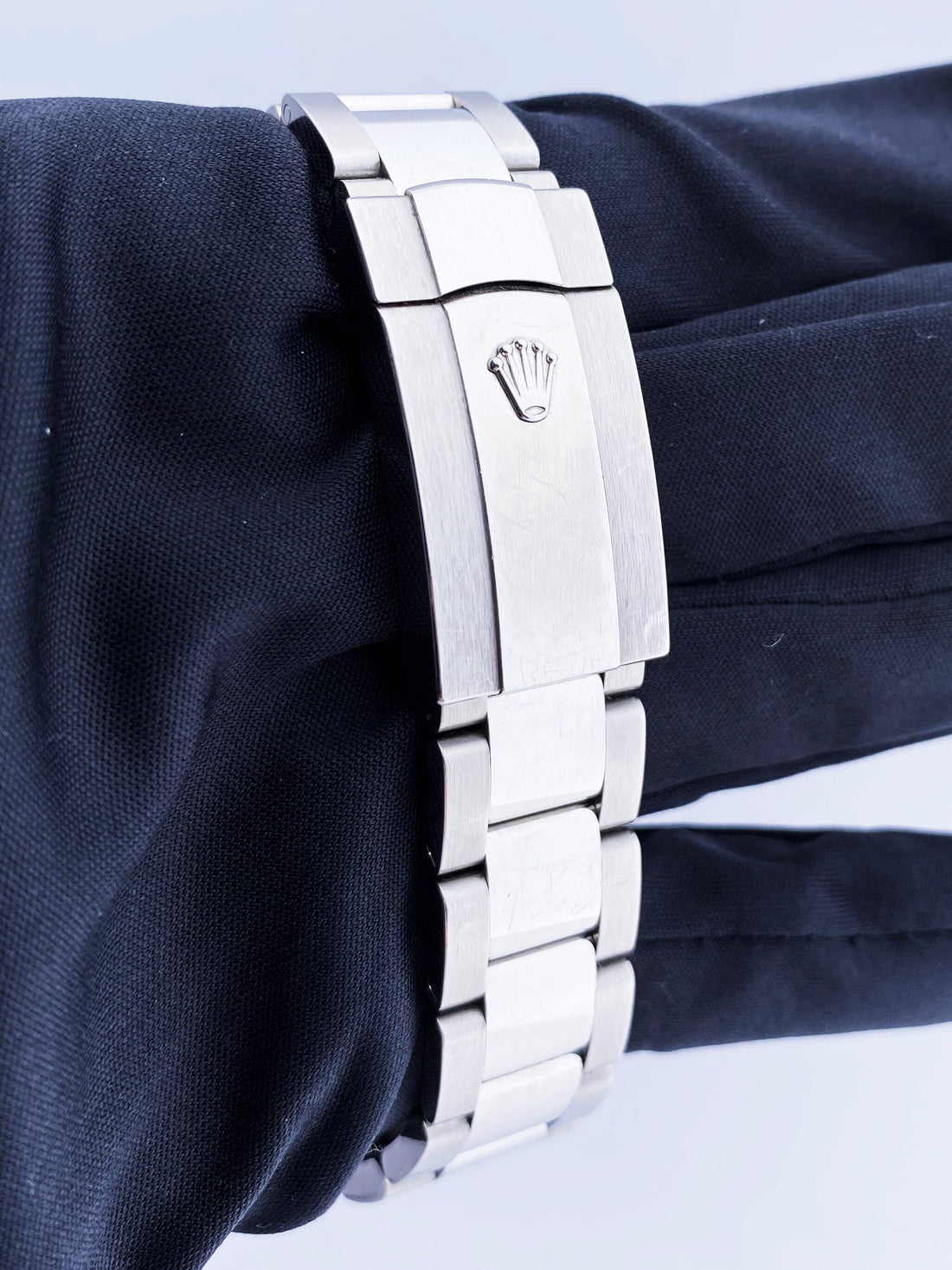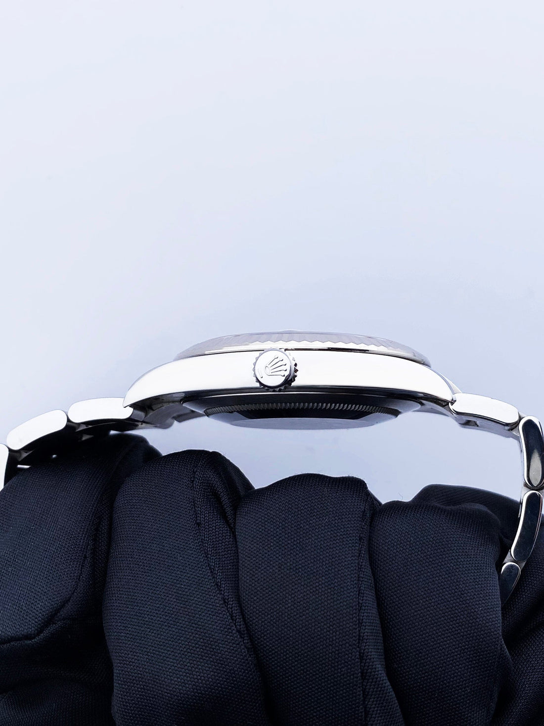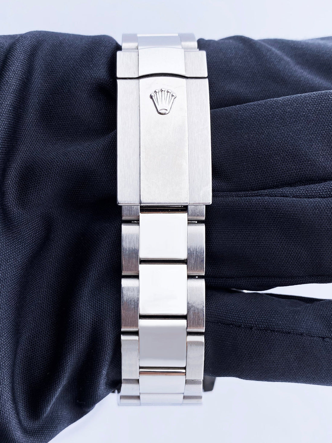 Rolex Datejust 41 126334 Mens Watch. 41mm stainless steel case with 18K White gold fluted bezel. Blue dial with silver hands and Index hour marker. Date display at a 3 o'clock position. Stainless steel Oyster bracelet with fold over clasp. Will fit up to a 7.5-Inch wrist. Sapphire crystal and stainless steel case back. Automatic-self winding movement. This watch comes with original Box and Papers.