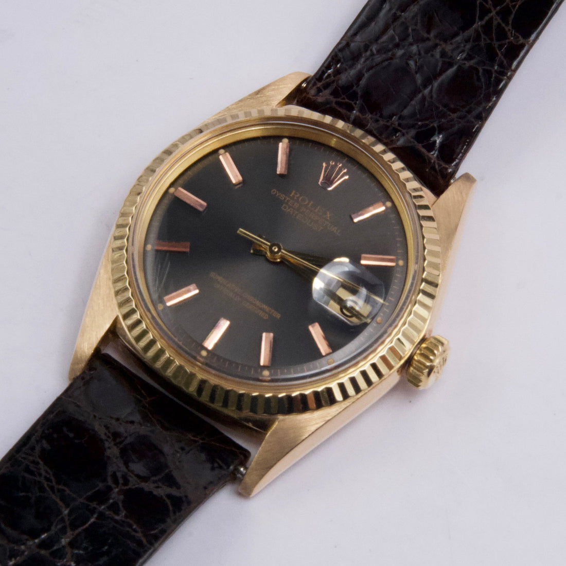 Rolex Datejust 1601 Mens Watch. 36mm 18K yellow gold case. 18k yellow gold fluted bezel. Grey dial with gold hands and Rose gold index hour markers. Minute markers on the outer dial. Date display at the 3 o'clock position. Brown Rolex leather strap with buckle. Will fit up to a 7.5-inch wrist. Acrylic Crystal. Stainless steel case back. Automatic self-winding chronometer movement.