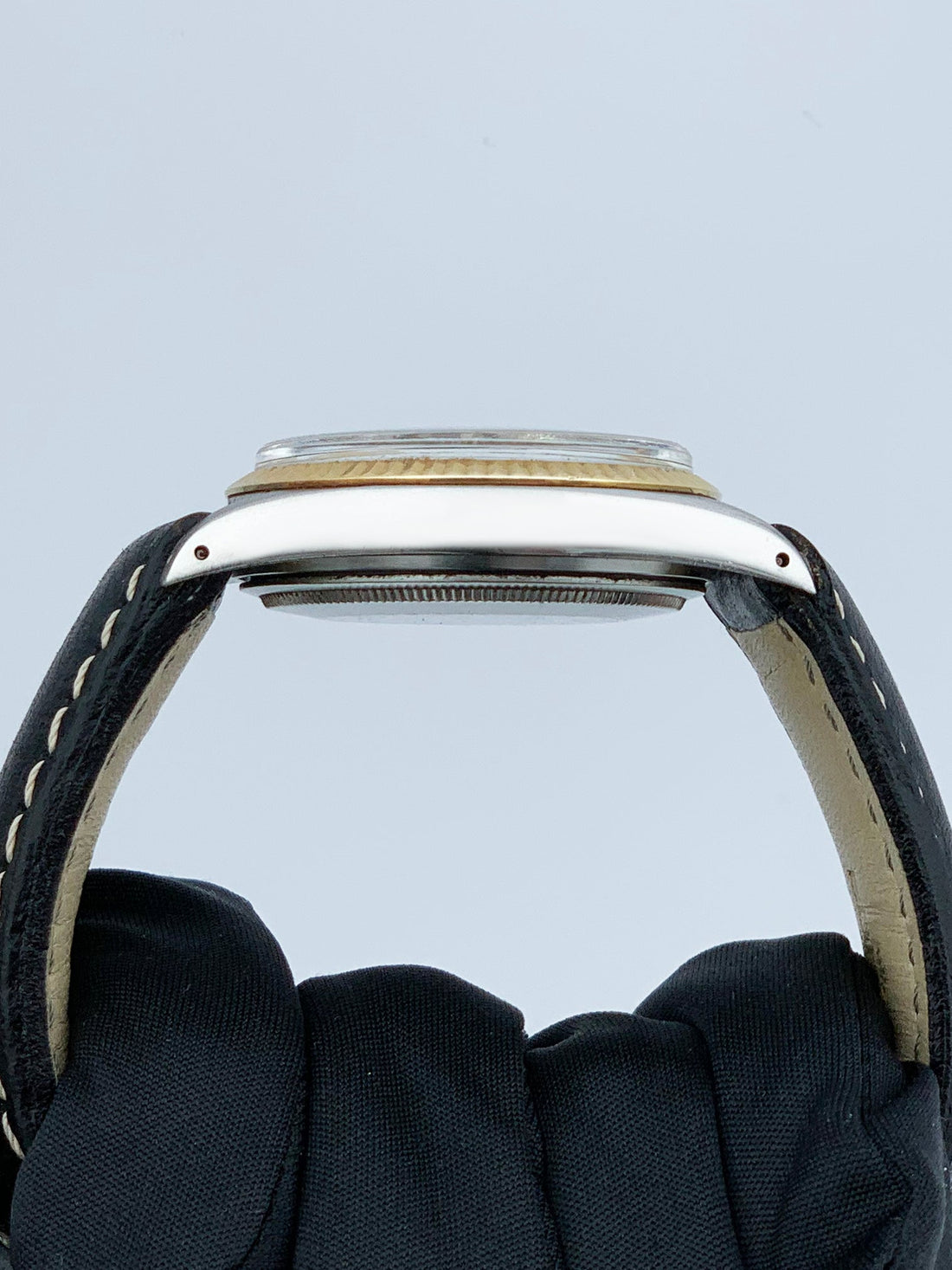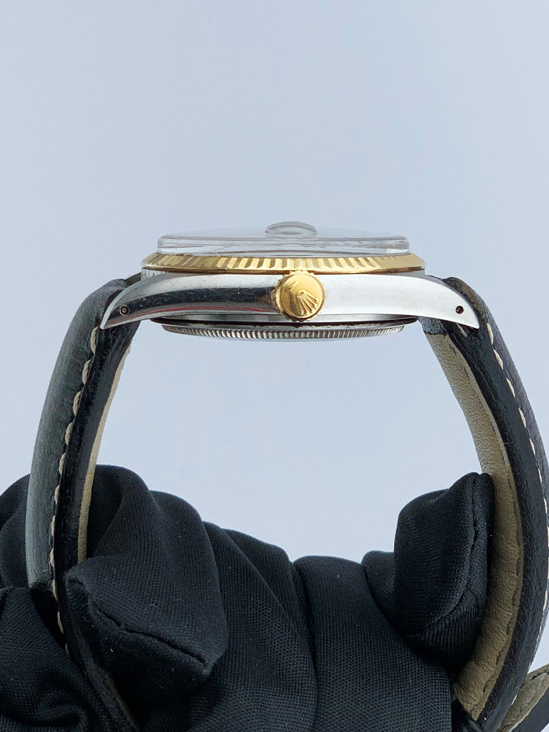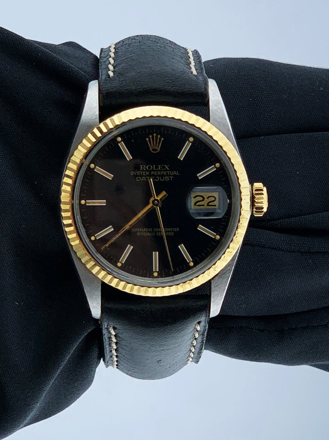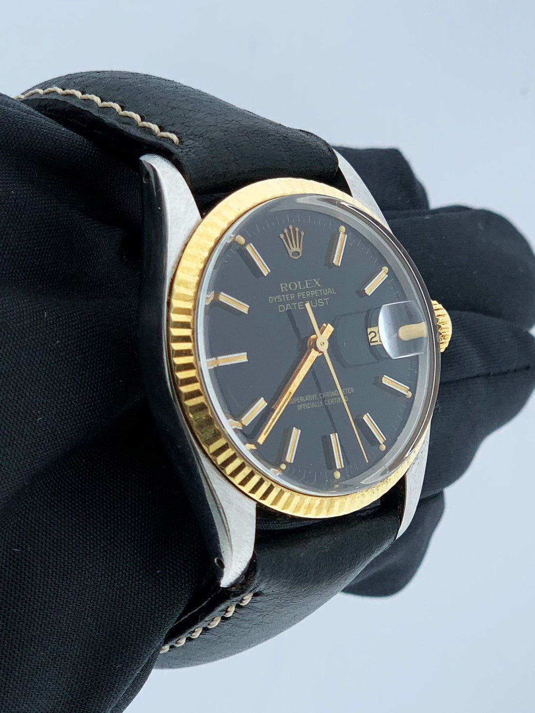 Rolex Datejust 16013 Mens Watch. 36mm Stainless Steel case. 18k Yellow Gold fluted bezel. Black dial with gold hands and index hour markers. Minute markers on the outer dial. Date display at the 3 o'clock position. Black aftermarket leather strap with gold tone buckle. Will fit up to a 7-inch wrist. Acrylic Crystal. Stainless steel case back. Automatic self-winding chronometer movement. Circa: 1976.