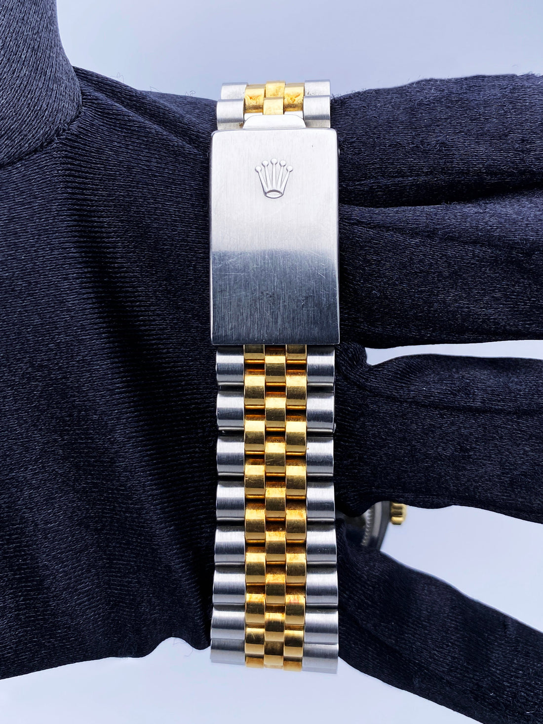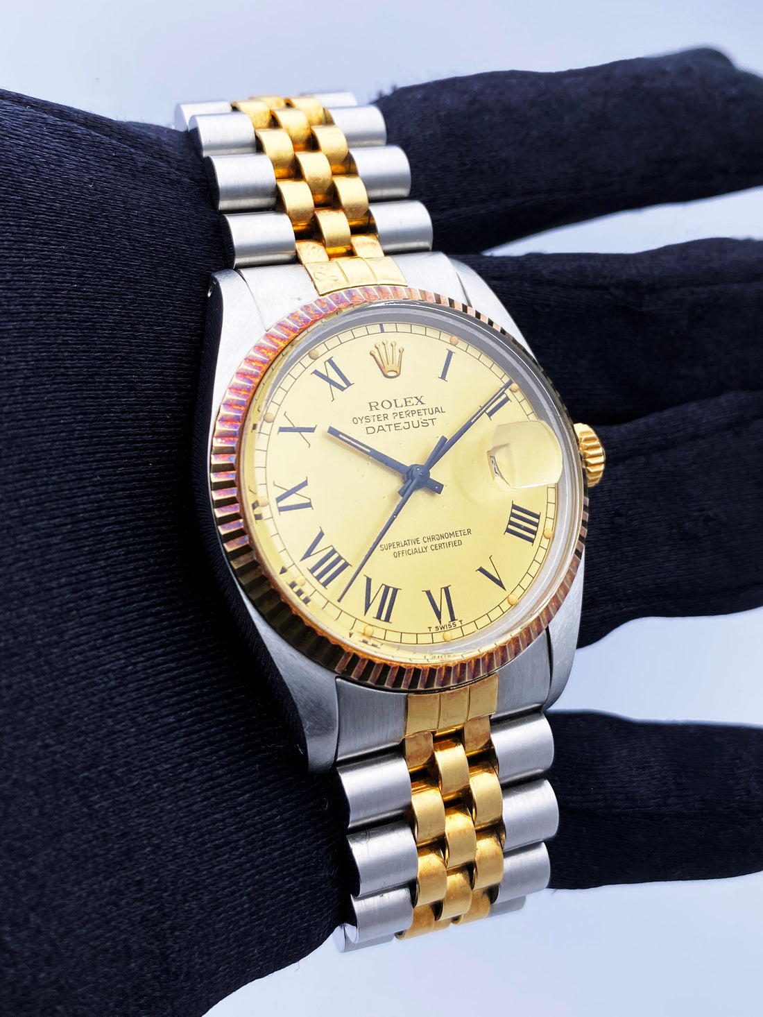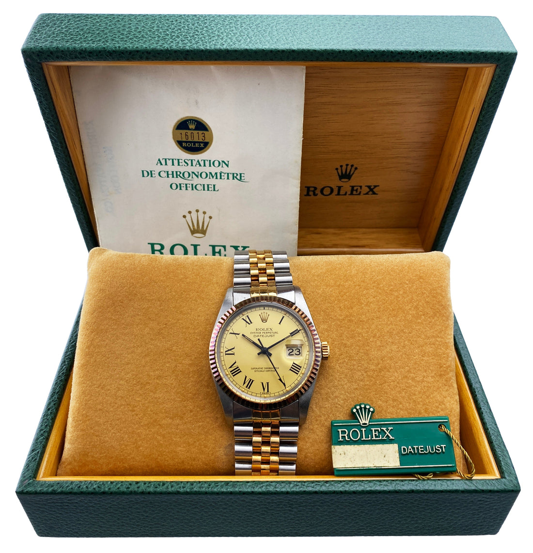 Rolex Datejust 16013 Mens Watch. 36mm stainless steel case. 18K yellow gold fluted bezel. Champagne Buckley dial with gold hands and Roman numeral hour markers. Minute markers on the outer dial. Date display at the 3 o'clock position. Stainless steel & 18K yellow gold Jubilee bracelet with fold over clasp. Will fit up to a 7-inch wrist. Acrylic crystal. Stainless steel case back. Automatic self-winding chronometer movement. This watch comes with original Box and Papers.