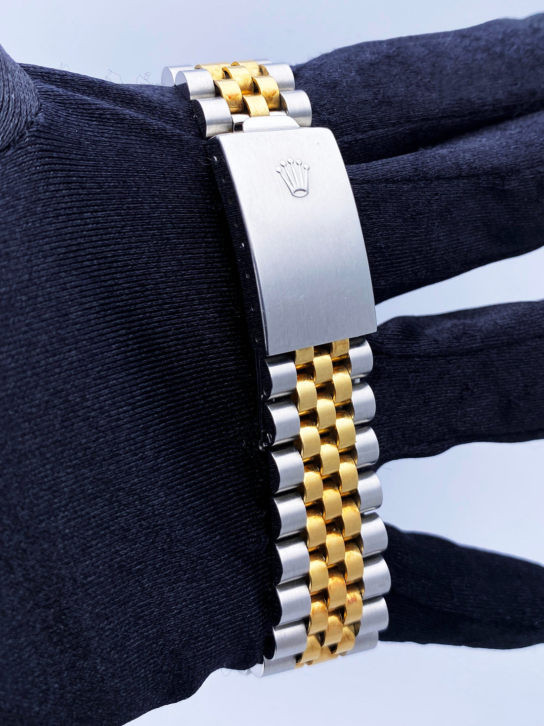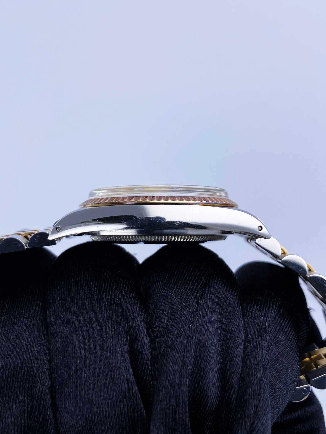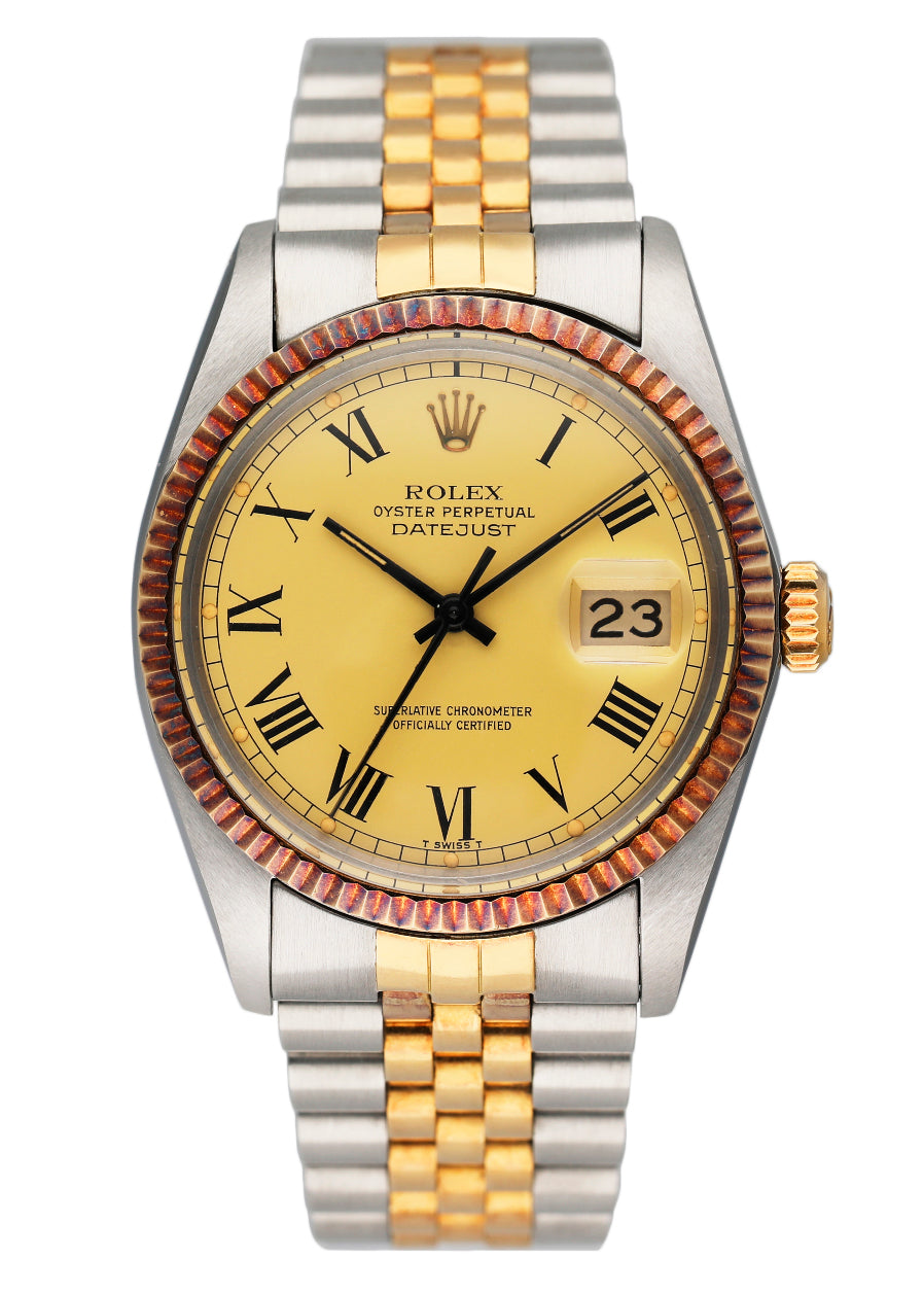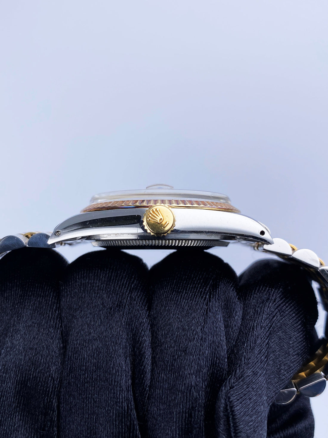 Rolex Datejust 16013 Mens Watch. 36mm stainless steel case. 18K yellow gold fluted bezel. Champagne Buckley dial with gold hands and Roman numeral hour markers. Minute markers on the outer dial. Date display at the 3 o'clock position. Stainless steel & 18K yellow gold Jubilee bracelet with fold over clasp. Will fit up to a 7-inch wrist. Acrylic crystal. Stainless steel case back. Automatic self-winding chronometer movement. This watch comes with original Box and Papers.