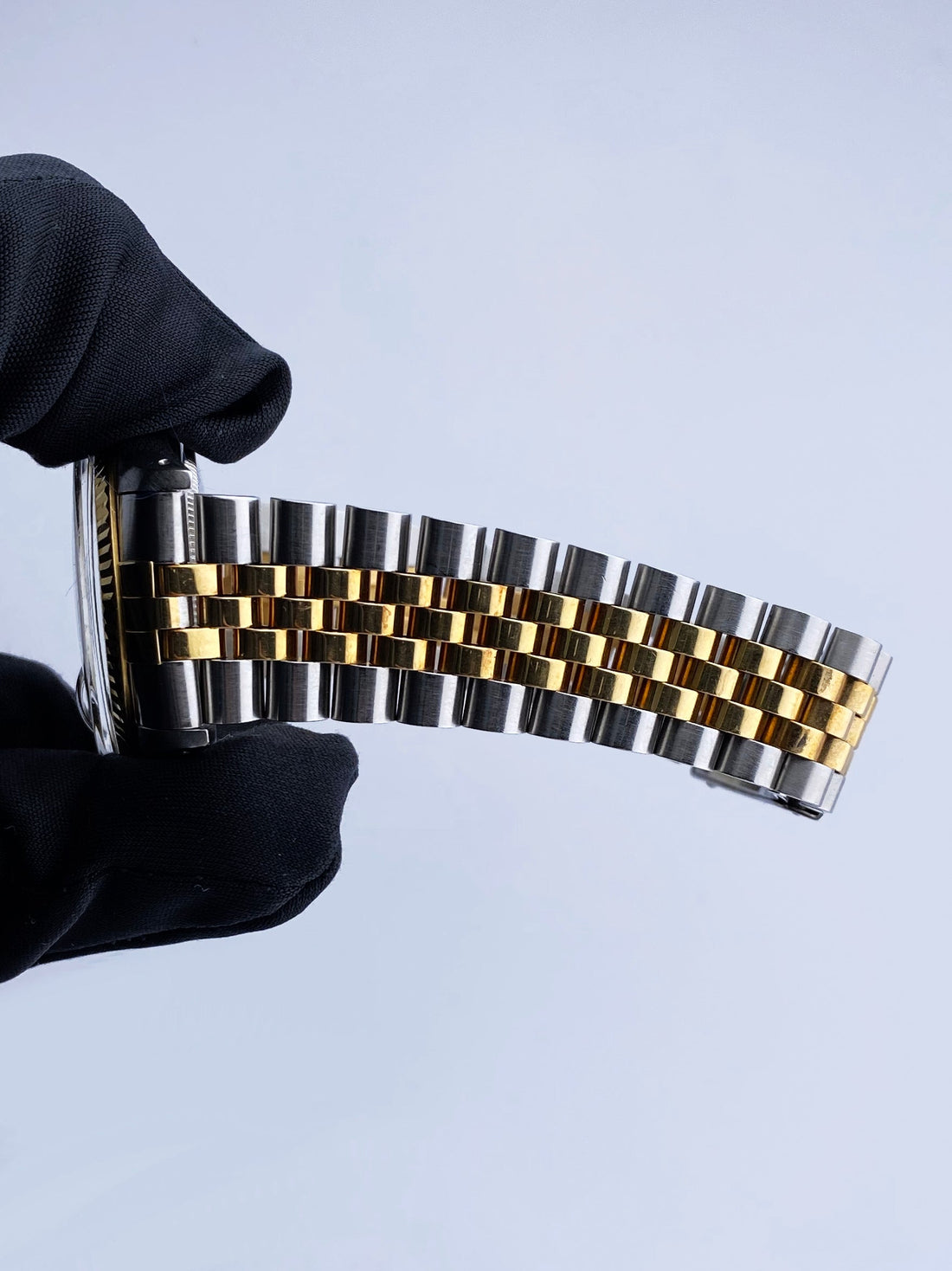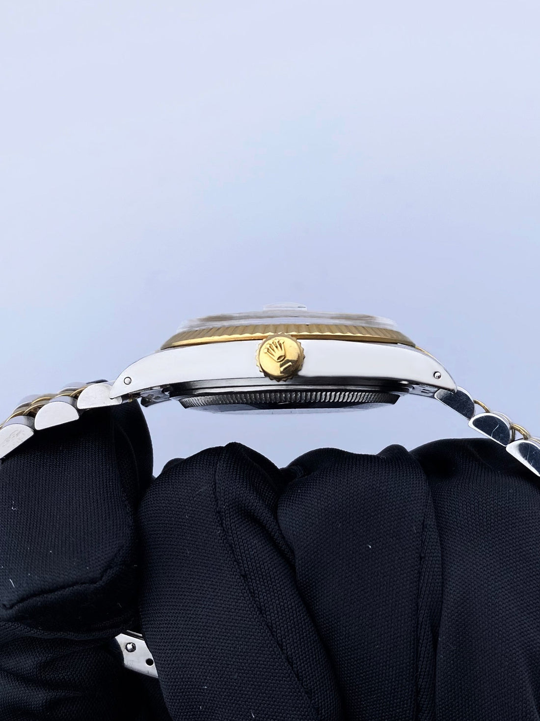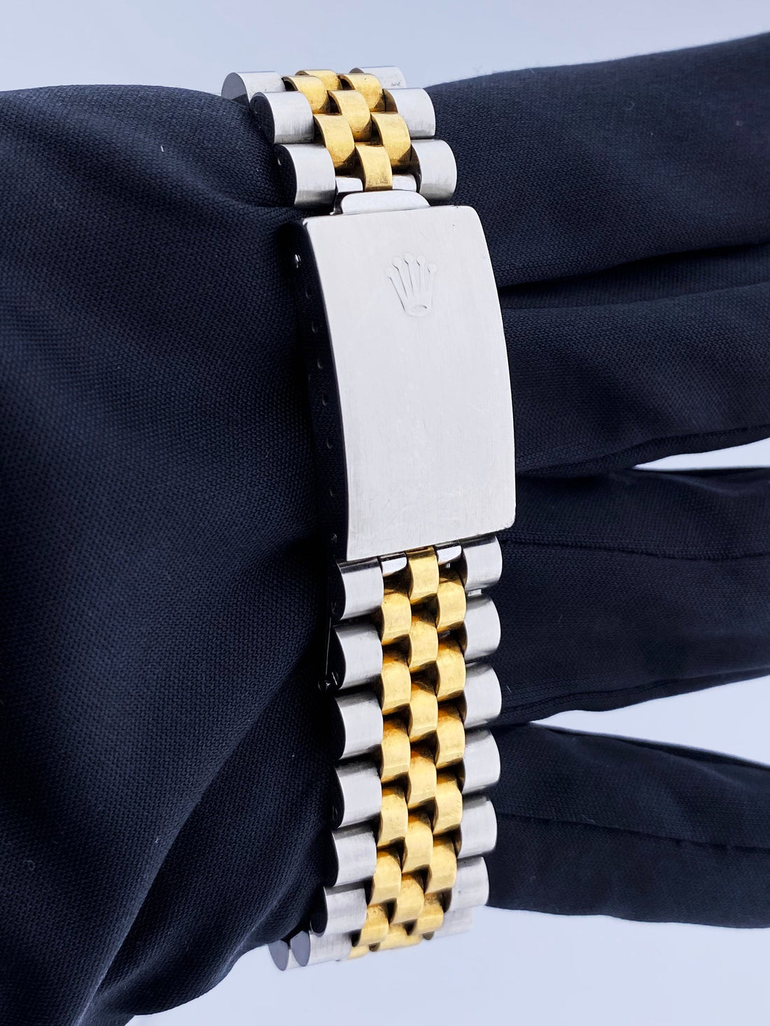 Rolex Datejust 16013 Mens Watch. 36mm stainless steel case. 18K yellow gold fluted bezel. Champagne dial with gold hands and original factory diamond set hour markers. Minute markers on the outer dial. Date display at the 3 o'clock position. Stainless steel & 18K yellow gold jubilee bracelet with fold over clasp. Will fit up to a 6.75-inch wrist. Acrylic Crystal. Stainless steel case back. Automatic self-winding chronometer movement.