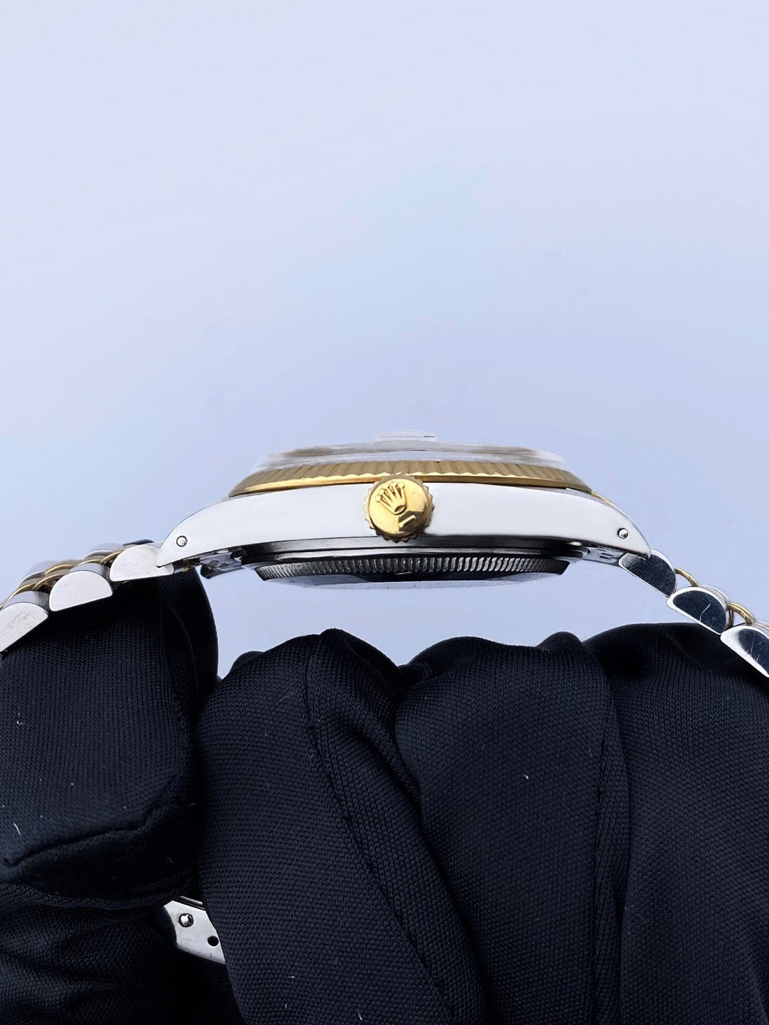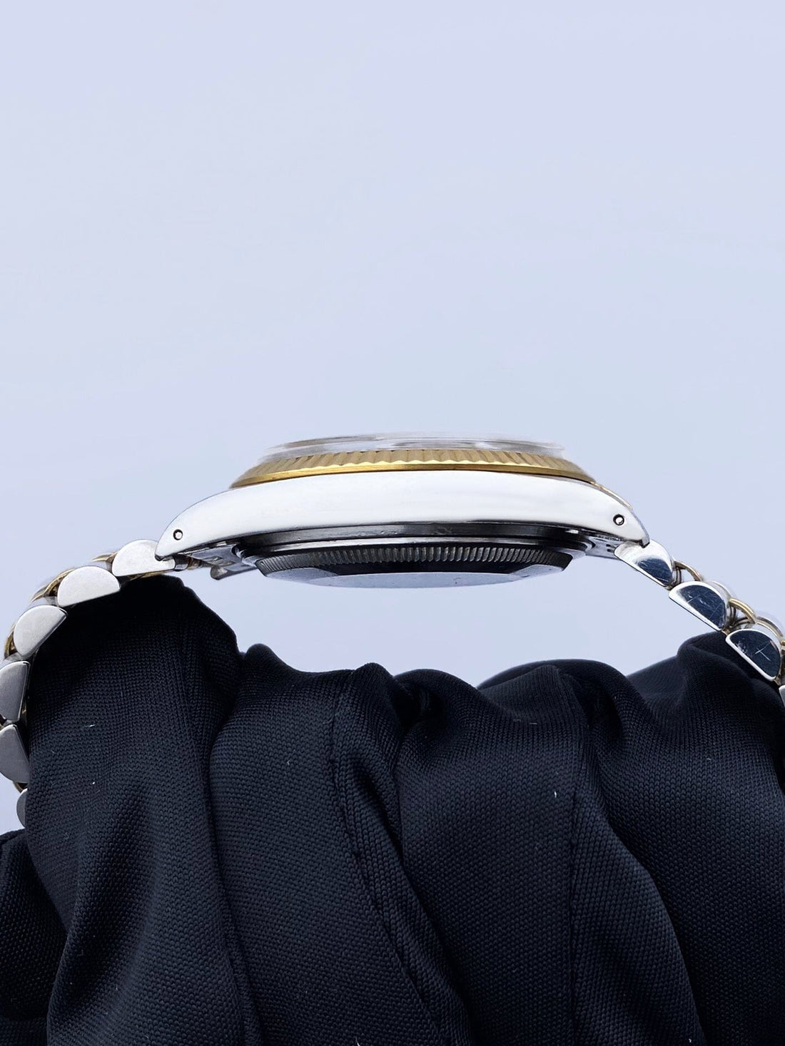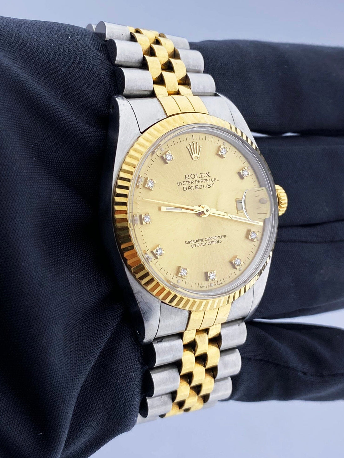 Rolex Datejust 16013 Mens Watch. 36mm stainless steel case. 18K yellow gold fluted bezel. Champagne dial with gold hands and original factory diamond set hour markers. Minute markers on the outer dial. Date display at the 3 o'clock position. Stainless steel & 18K yellow gold jubilee bracelet with fold over clasp. Will fit up to a 6.75-inch wrist. Acrylic Crystal. Stainless steel case back. Automatic self-winding chronometer movement. This watch comes with original Box and Papers.