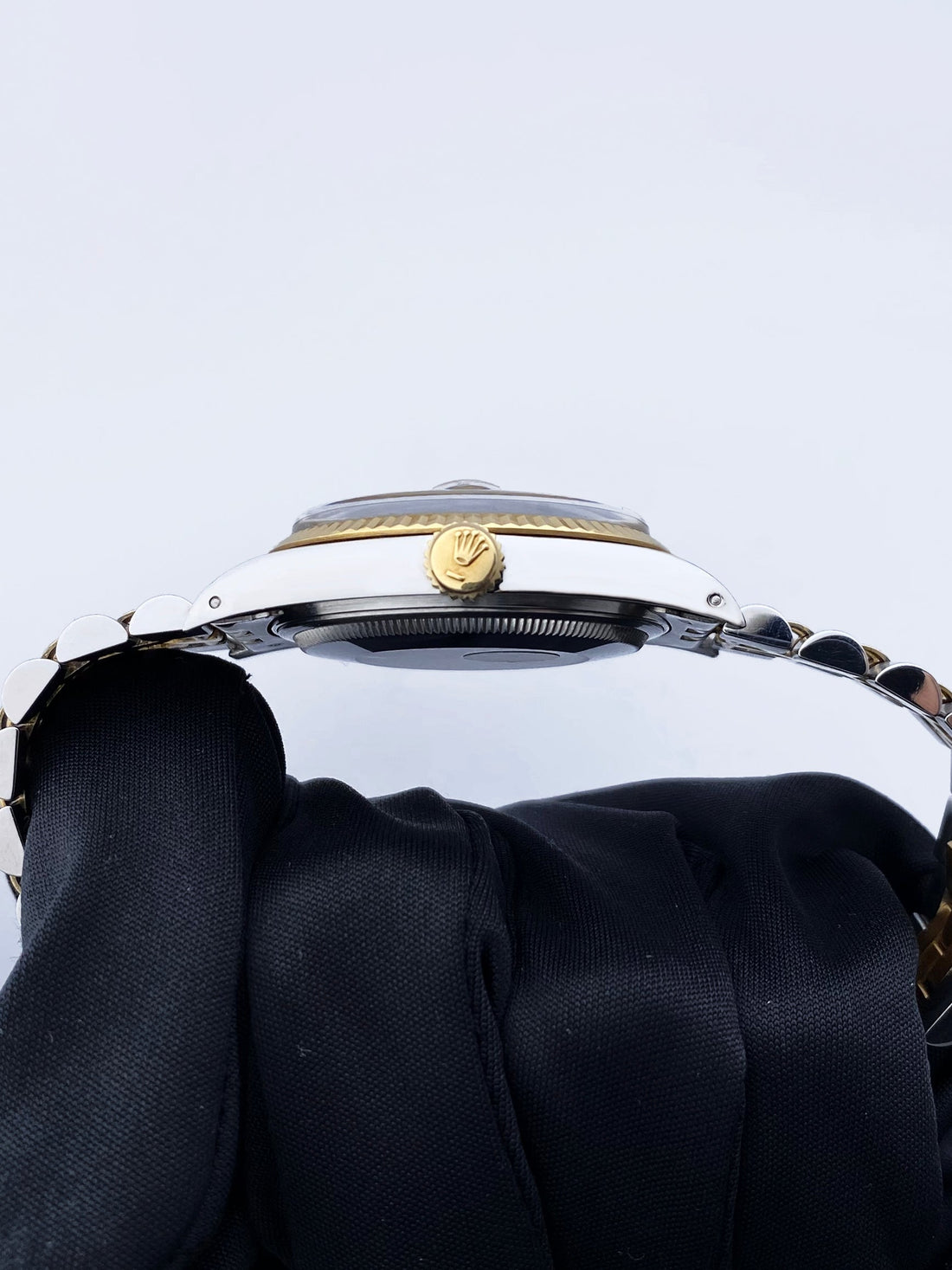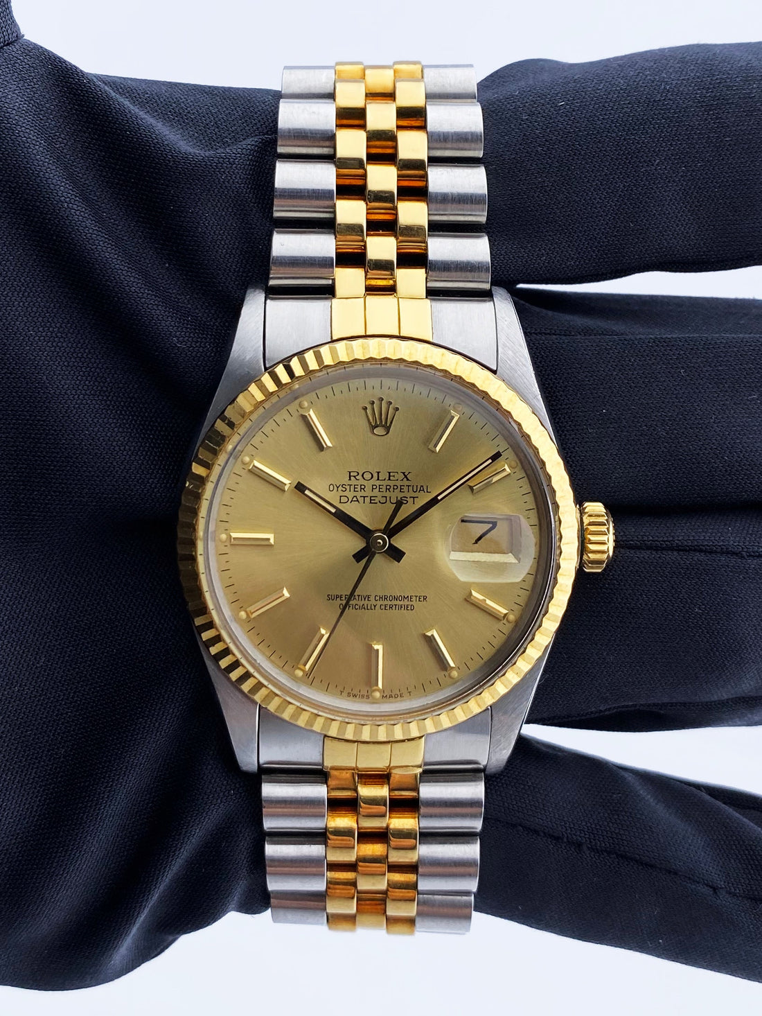 Rolex Datejust 16013 Mens Watch. 36mm Stainless Steel case. 18k Yellow Gold fluted bezel. Champagne dial with gold hands and index hour markers. Minute markers on the outer dial. Date display at the 3 o'clock position. Stainless Steel & 18k yellow gold jubilee bracelet with Fold Over Clasp. Will fit up to a 7.5-inch wrist. Acrylic Crystal, Stainless steel case back. Automatic self-winding chronometer movement.