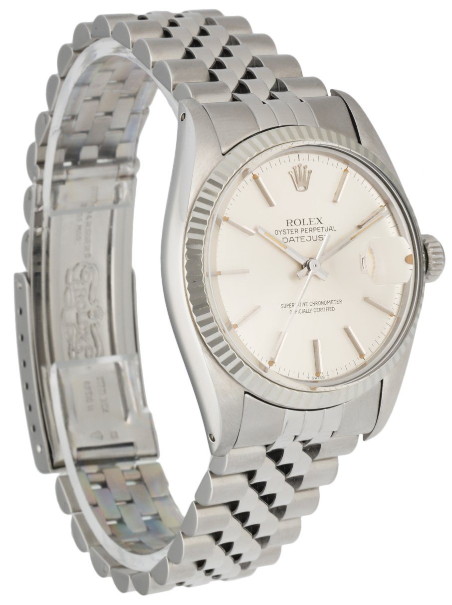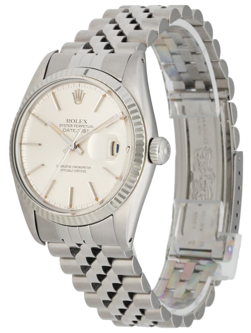 18K White Gold fluted bezel. Silver dial with Steel hands and index hour markers.