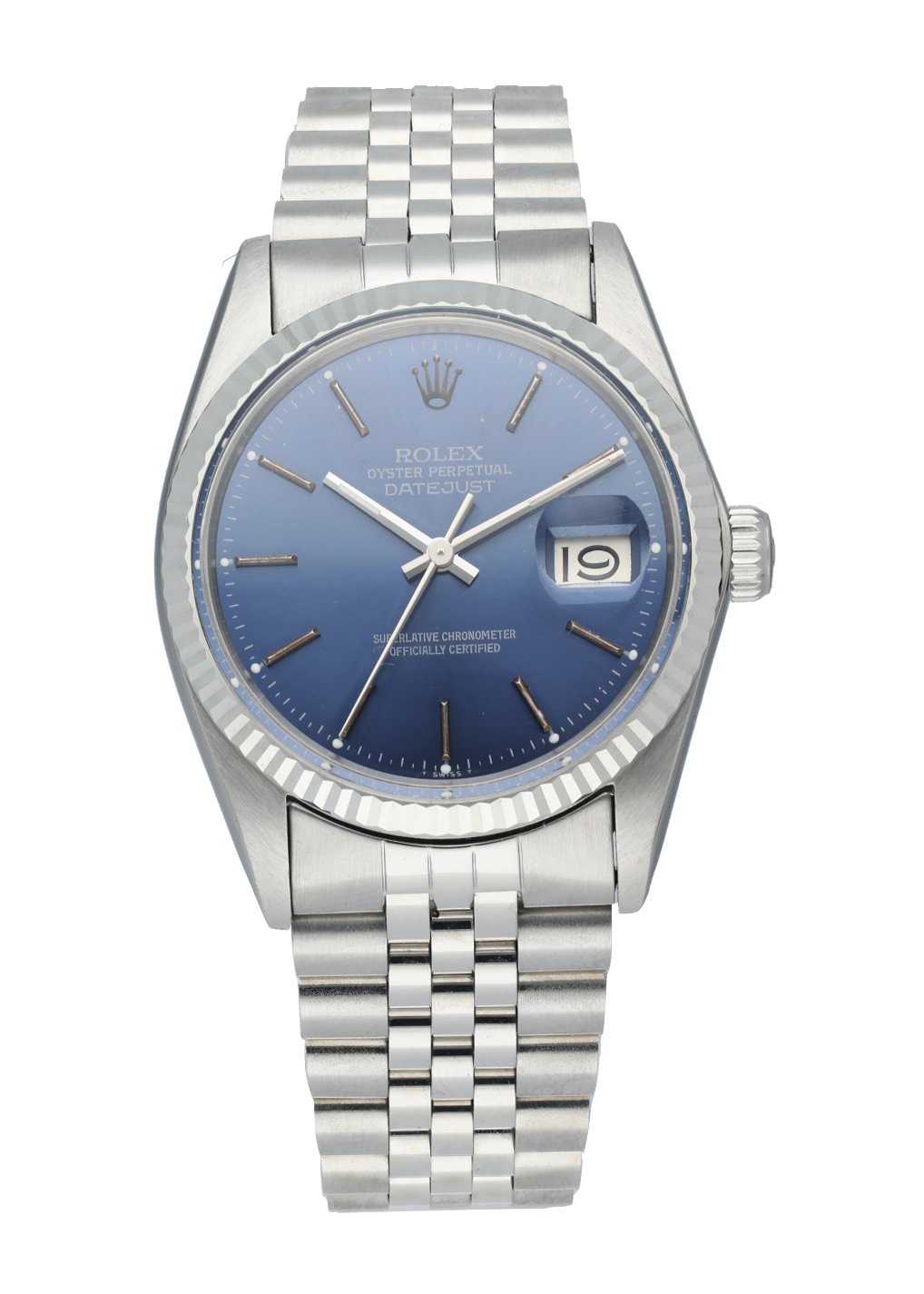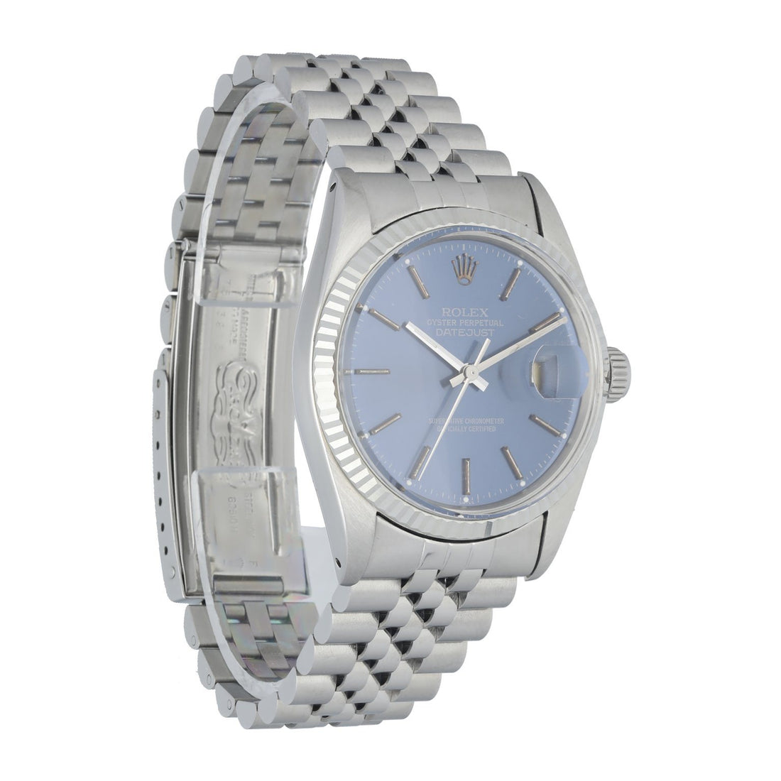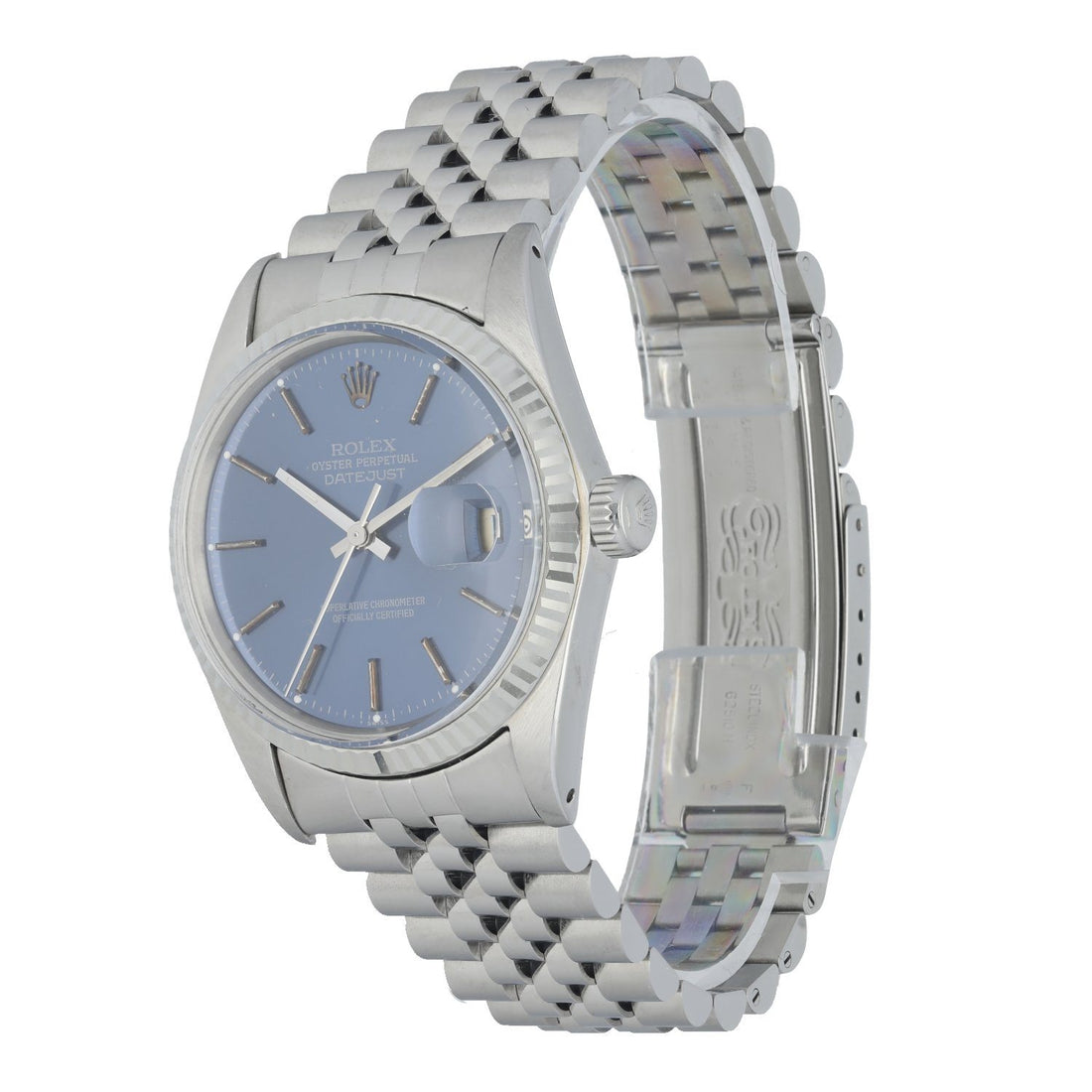 Rolex Oyster Perpetual Datejust 16014 Men's Watch. Stainless steel 36mm case with an 18k white gold fluted bezel. Blue dial with steel hands and index markers. Date display at the 3 o'clock position with quickset function. Stainless steel jubilee bracelet with fold over clasp. Will fit up to a 7-inch wrist. Automatic self-wind movement with a 42-hour power reserve. Acrylic crystal glass.