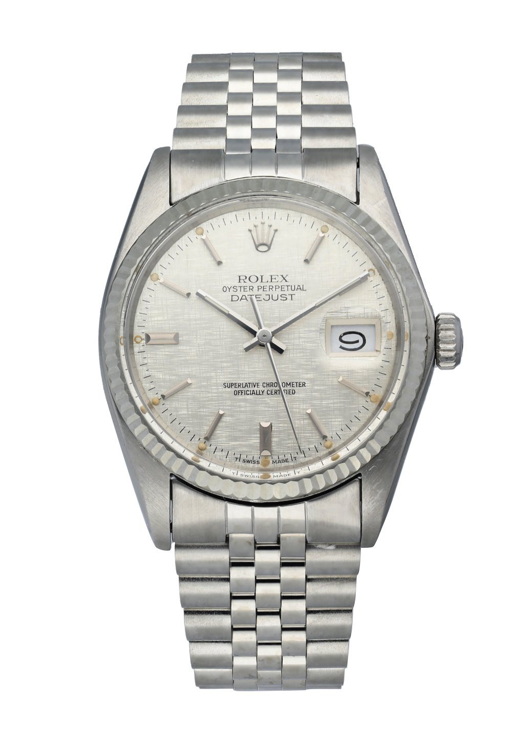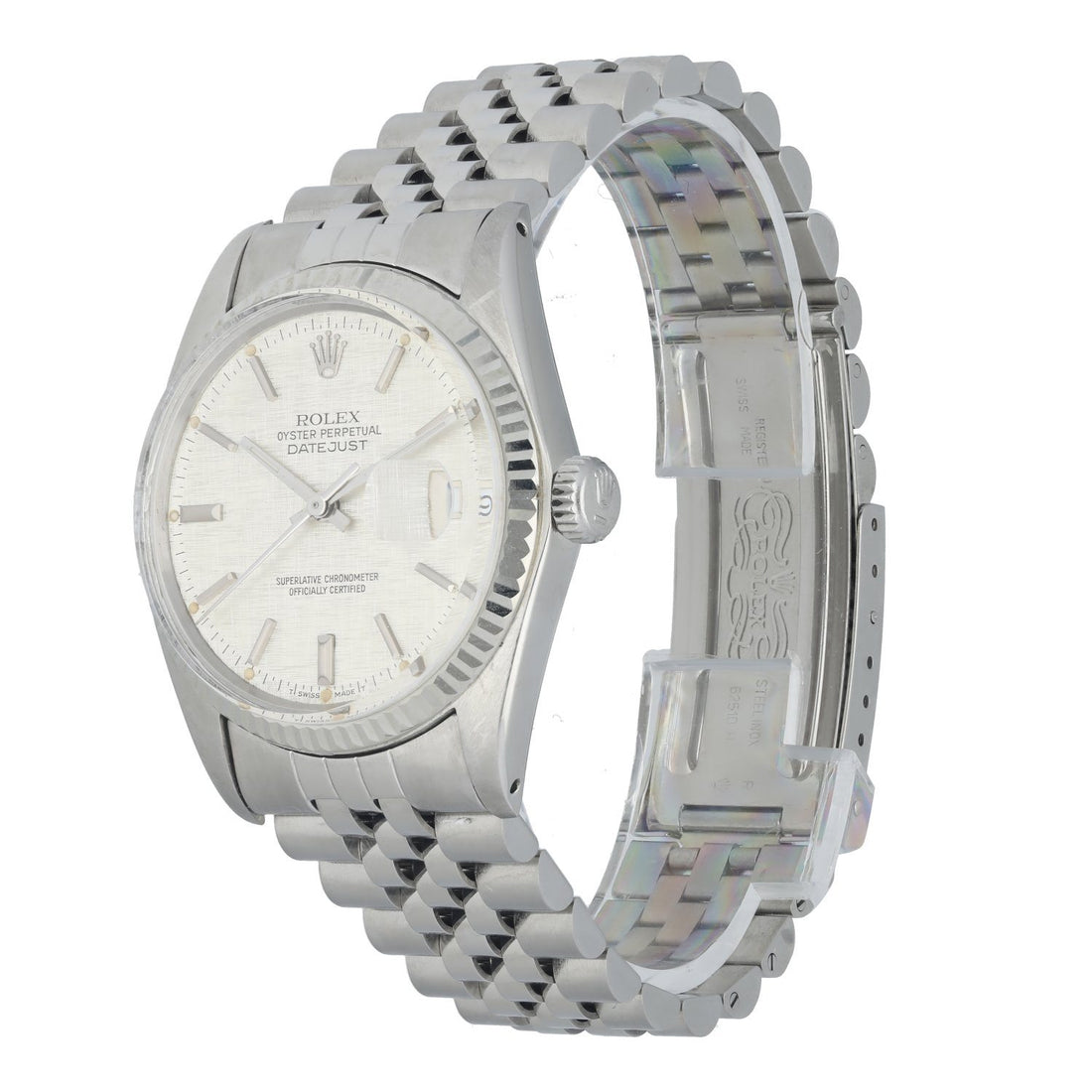 Rolex Datejust Professional 16014 Men Watch. 36mm Stainless Steel case. White Gold Stationary bezel. Linen dial with Steel hands and index hour markers. Minute markers on the outer dial. Date display at the 3 o'clock position. Stainless Steel jubilee bracelet with Fold Over Clasp; will fit up to a 7-inch wrist. Acrylic Crystal, Stainless steel case back. Automatic self-winding movement with a 42-hour power reserve.