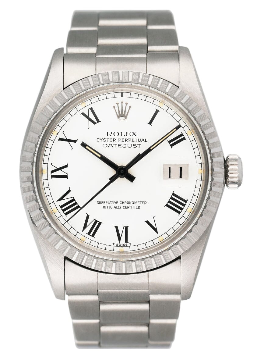 Rolex Datejust 16030 Mens Watch. 36mm stainless steel case. Stainless steel fluted bezel. White buckley dial with black hands and Roman numeral hour markers. Minute markers on the outer dial. Date display at the 3 o'clock position. Stainless steel Oyster Bracelet with fold over clasp. Will fit up to a 6.5-inch wrist. Acrylic crystal. Stainless steel case back. Automatic self-winding.