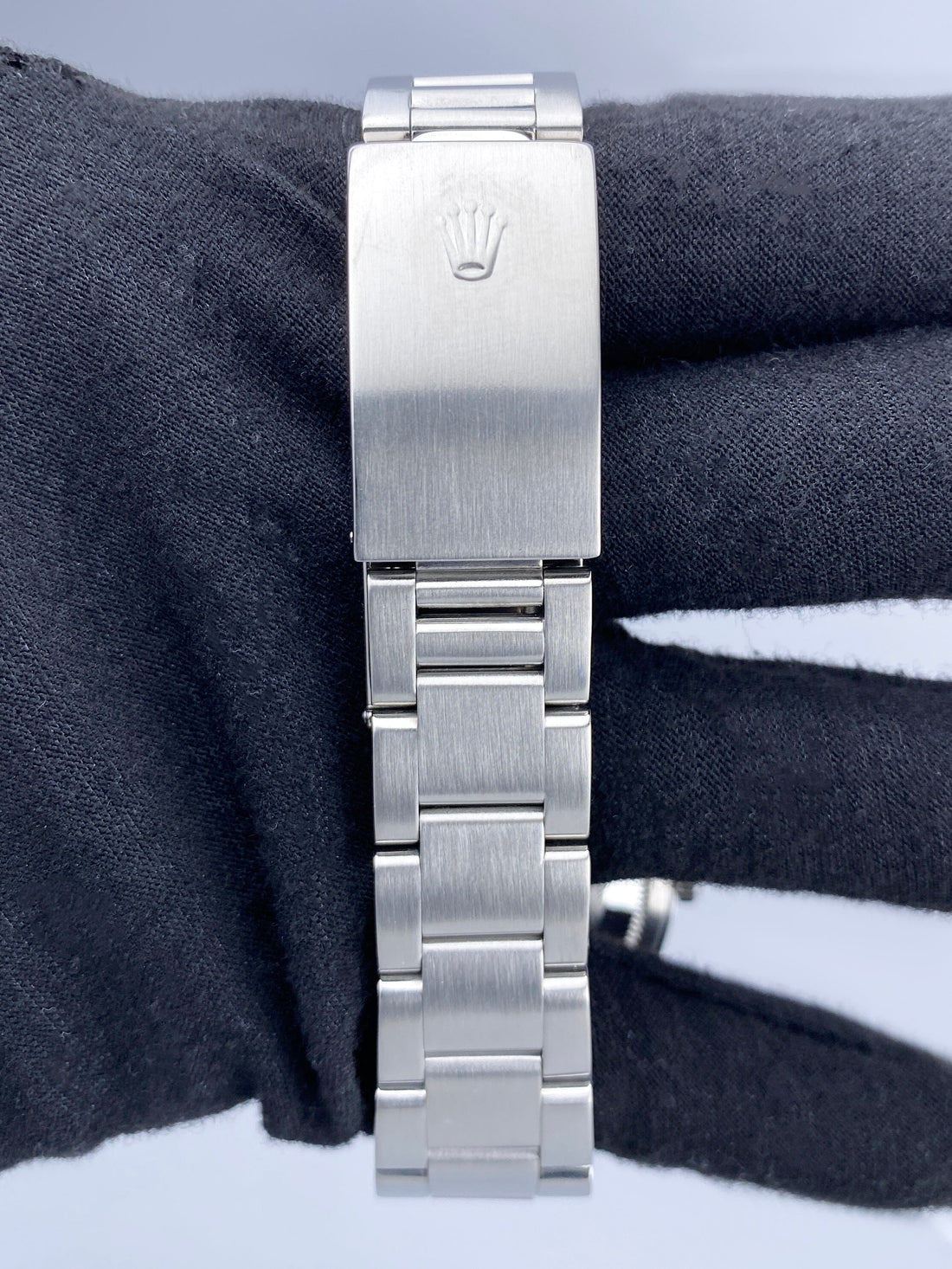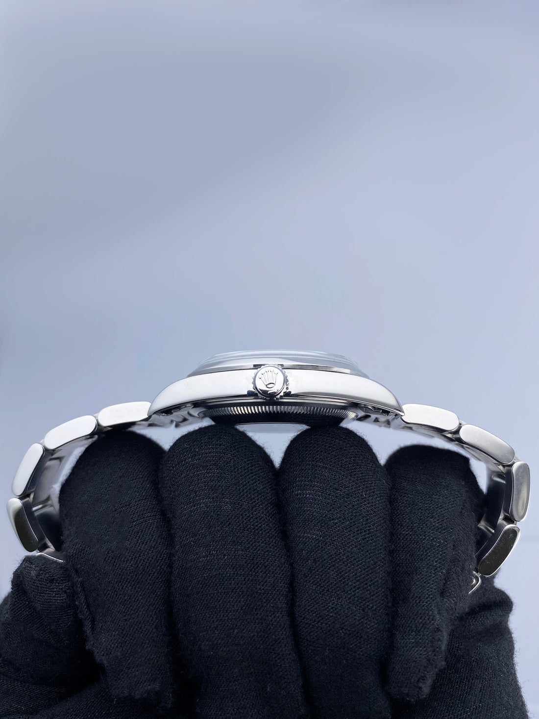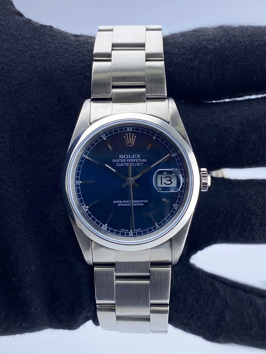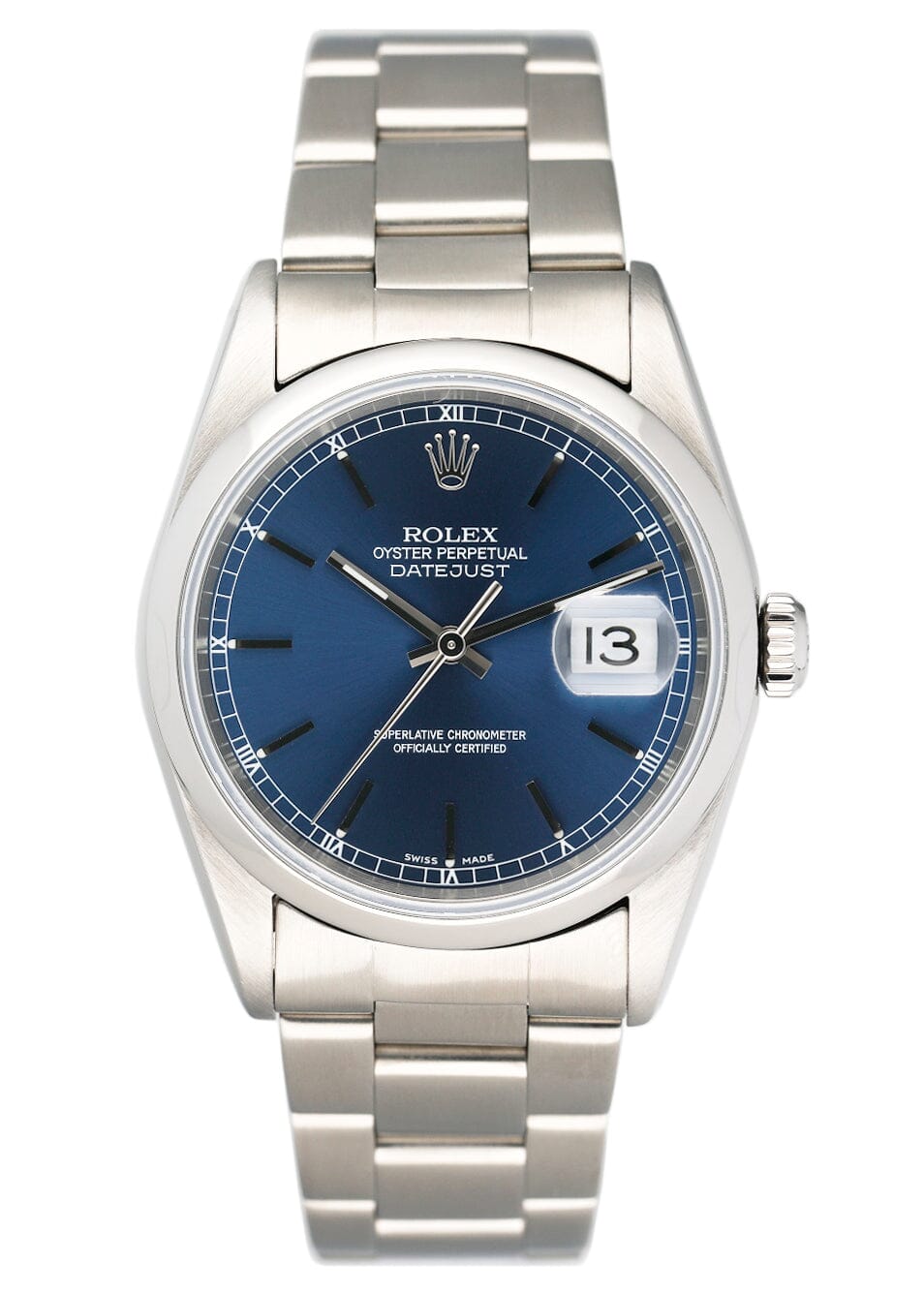 Rolex Datejust 16200 Mens Watch. 36mm stainless steel case. Stainless steel smooth bezel. Blue dial with luminous steel hands and index hour markers. Minute markers around the outer dial. Date display at the 3 o'clock position. Stainless steel Oyster bracelet with a fold-over clasp. Will fit up to a 7.5-inch wrist. Sapphire crystal. Stainless steel case back. Automatic self-winding movement.