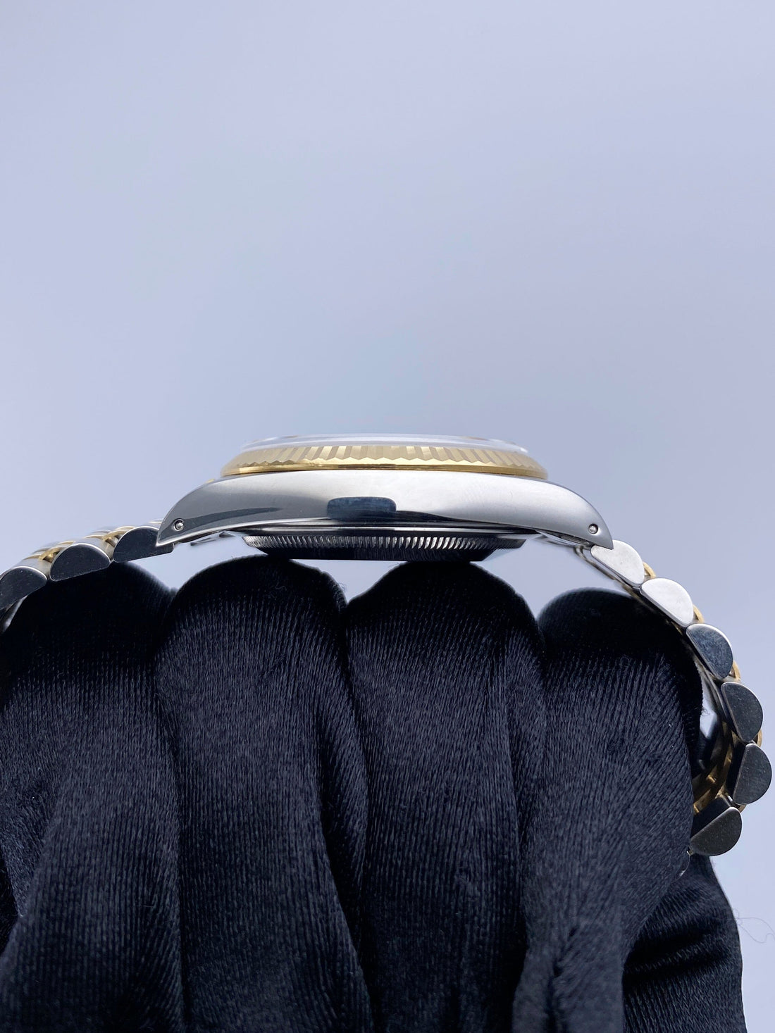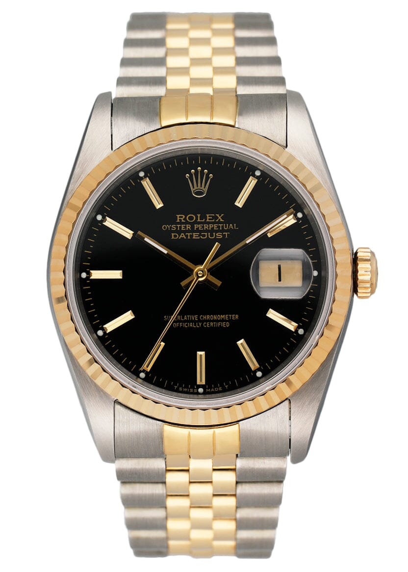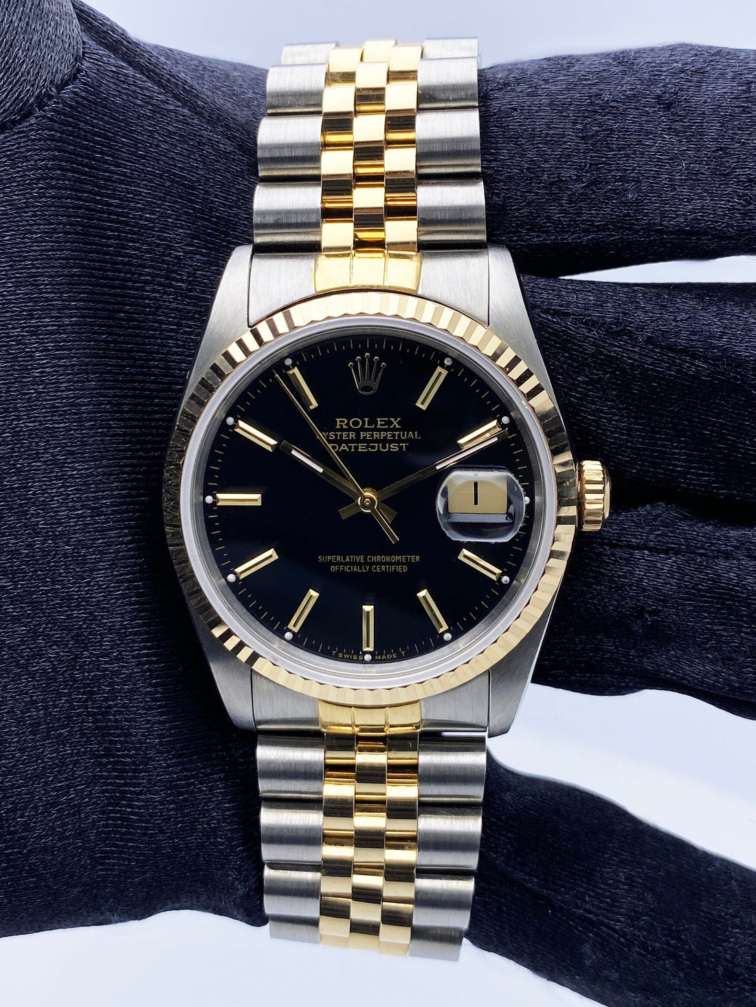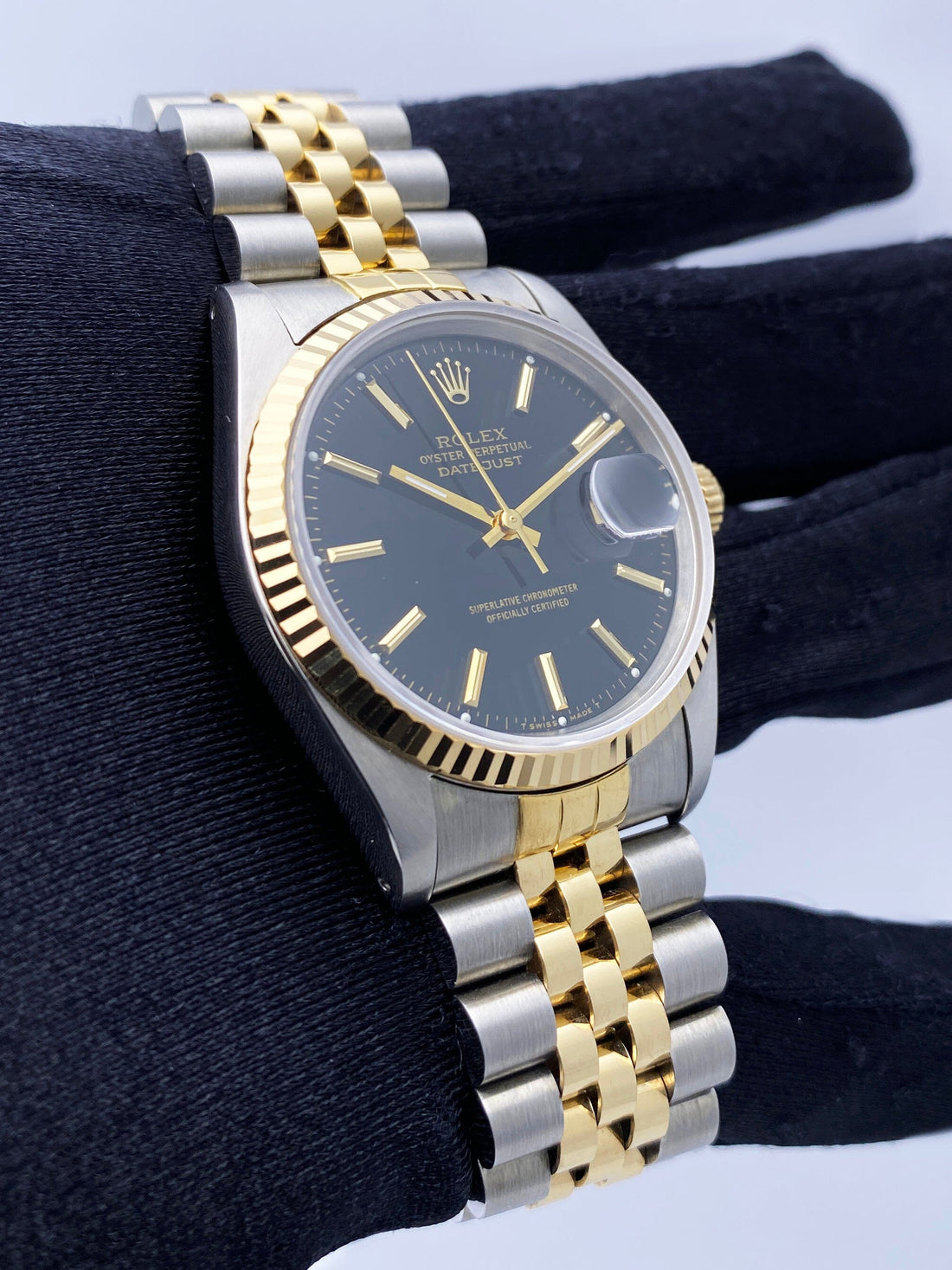 Rolex Datejust 16233 Mens Watch. 36mm Stainless Steel case. 18K Yellow Gold fluted bezel. Black dial with gold hands and gold index hour markers. Date display at the 3 o'clock position. Stainless Steel & 18K yellow gold jubilee bracelet with stainless steel Fold Over Clasp. Will fit up to a 7-inch wrist. Sapphire Crystal, Stainless steel case back. Automatic with a 42-hour power reserve.