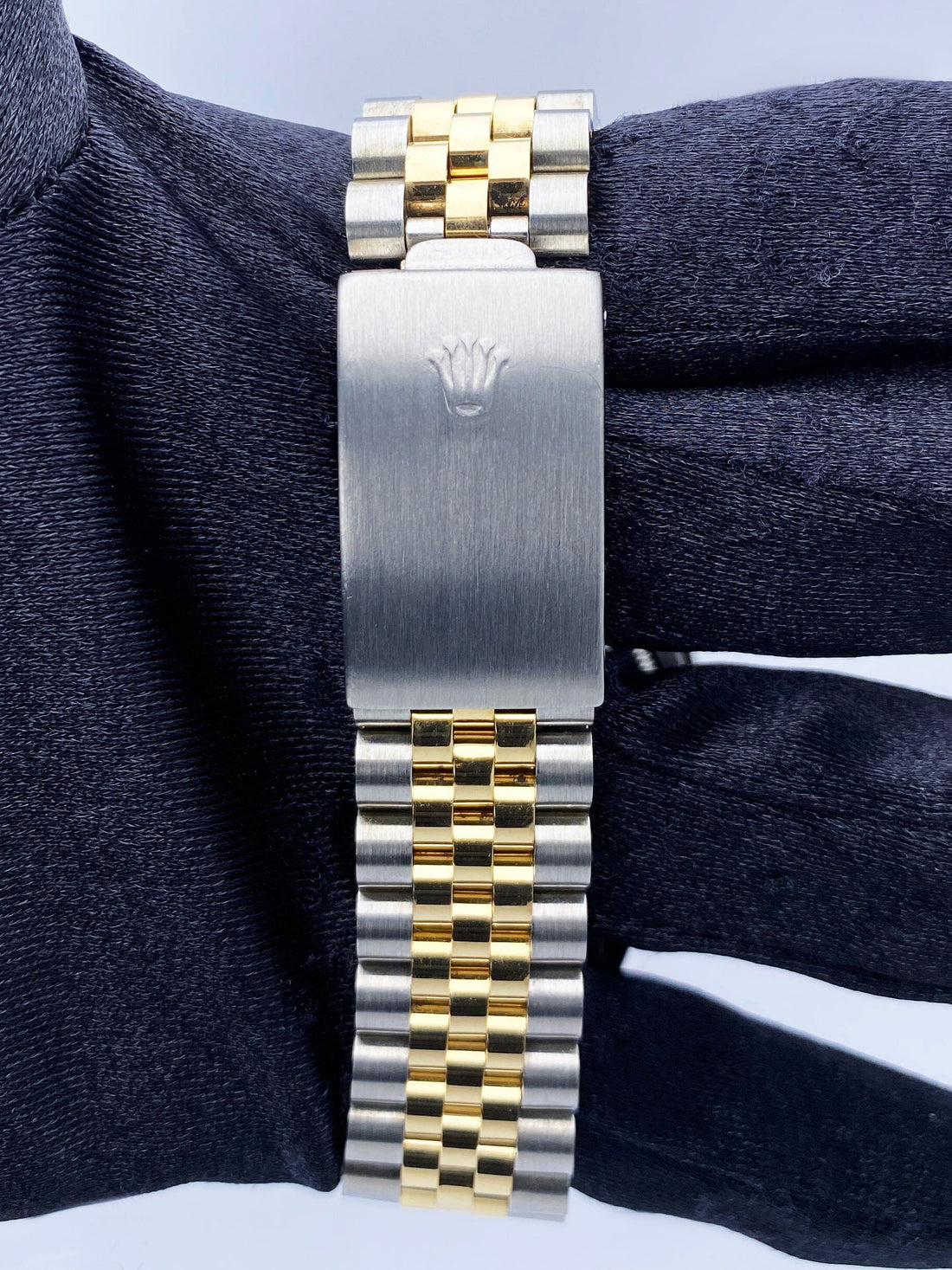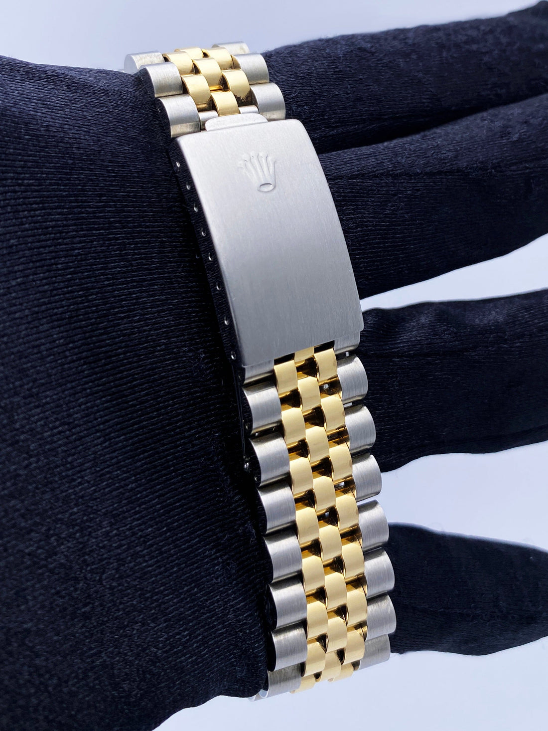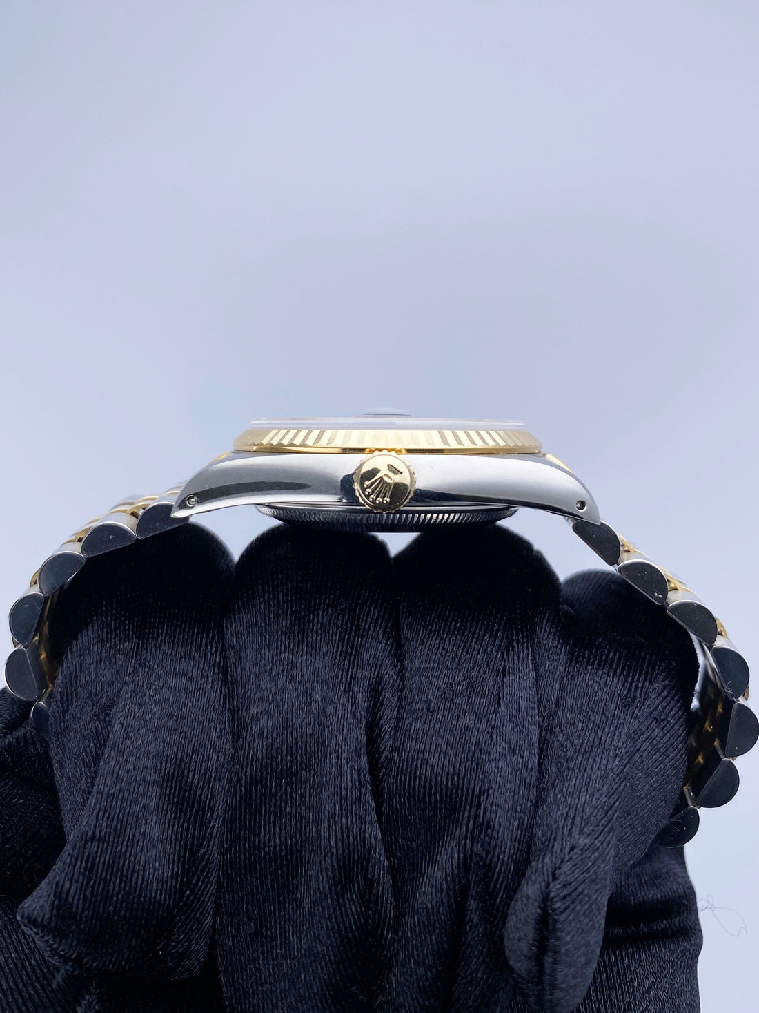 Rolex Datejust 16233 Mens Watch. 36mm Stainless Steel case. 18K Yellow Gold fluted bezel. Black dial with gold hands and gold index hour markers. Date display at the 3 o'clock position. Stainless Steel & 18K yellow gold jubilee bracelet with stainless steel Fold Over Clasp. Will fit up to a 7-inch wrist. Sapphire Crystal, Stainless steel case back. Automatic with a 42-hour power reserve.
