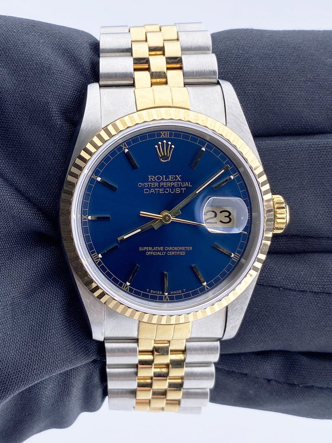 Rolex Datejust 16233 Men Watch. 36mm Stainless Steel case. 18K yellow gold fluted bezel. Blue dial with gold hands and index hour markers. Minute markers on the outer dial. Date display at the 3 o'clock position. Stainless steel & 18K yellow gold Bracelet with stainless steel fold over clasp. Will fit up to a 7-inch wrist. Sapphire Crystal, Stainless steel case back. Calibre 3135 Automatic with a 42-hour power reserve.