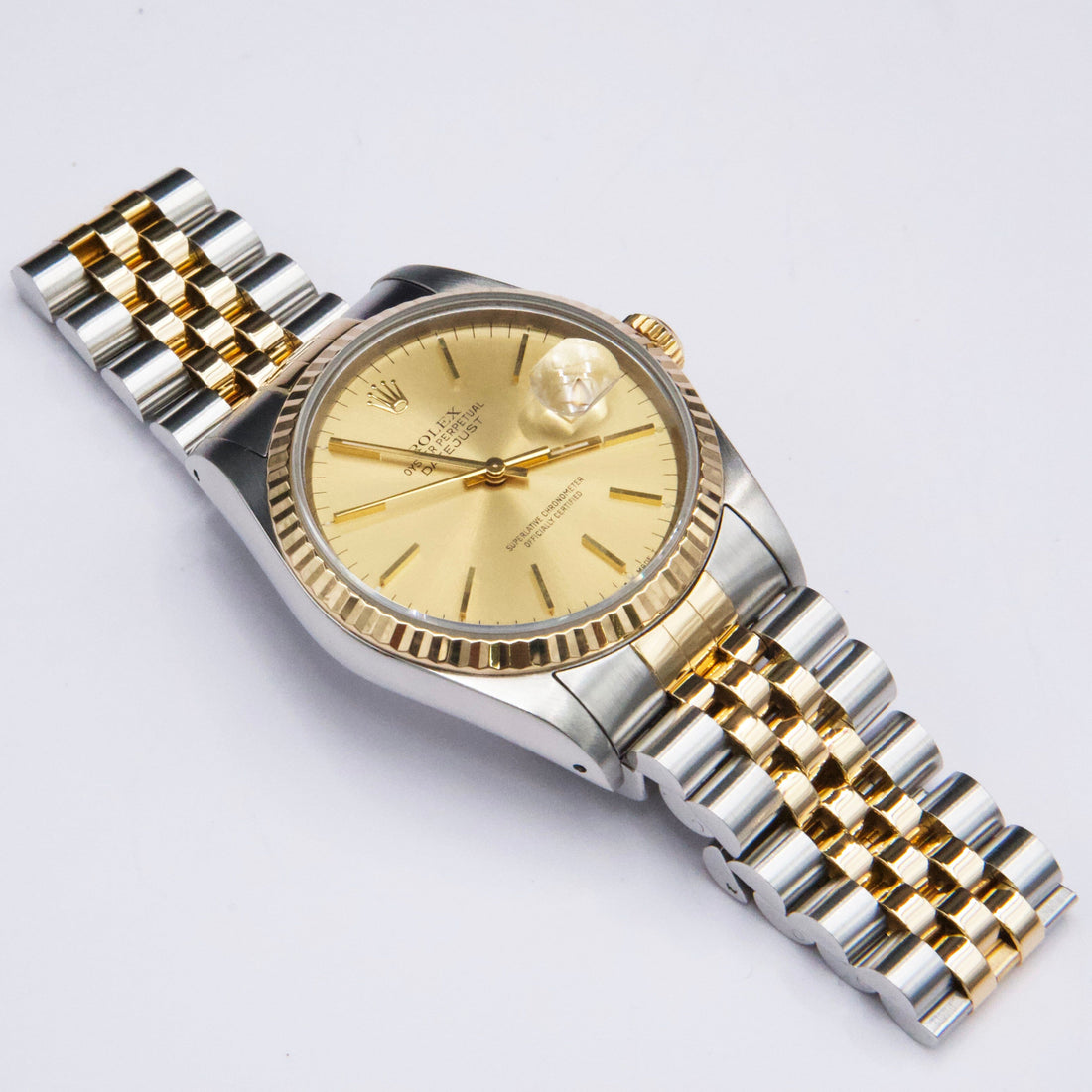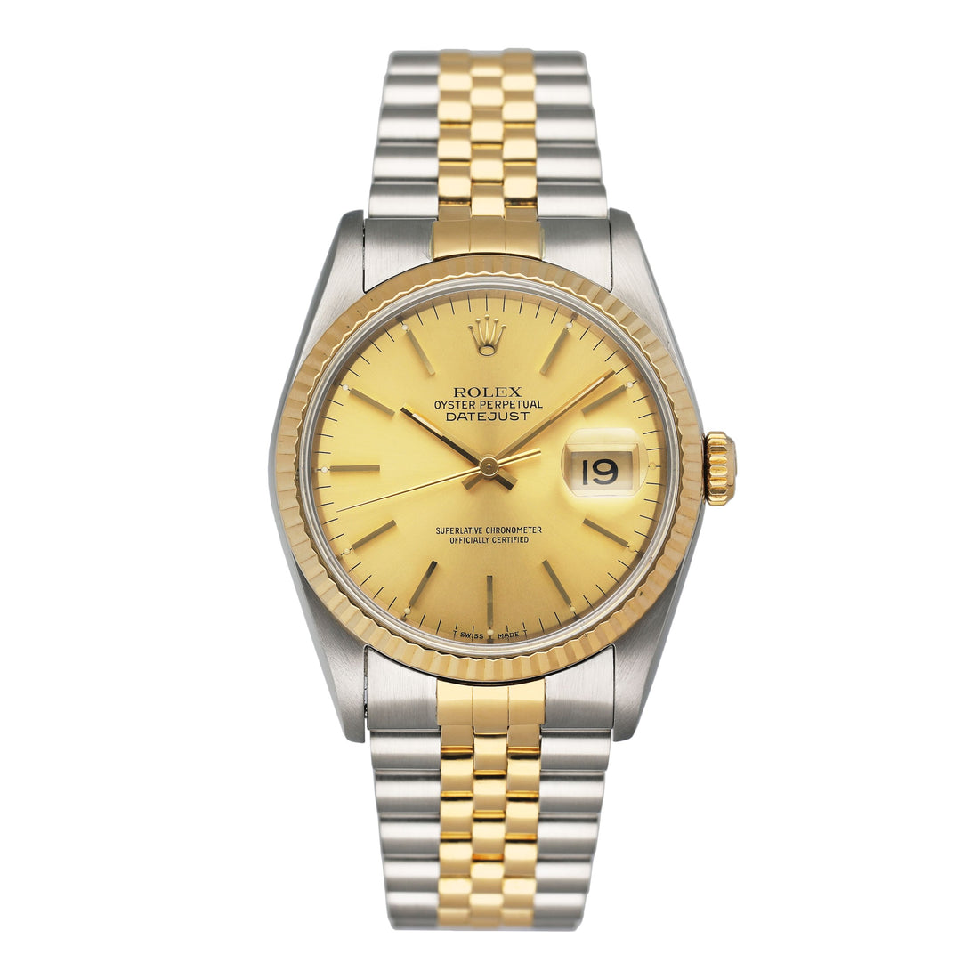 Rolex Datejust 16233 Mens Watch. 36mm stainless steel case. 18K yellow gold fluted bezel. Champagne dial with gold hands and gold index hour markers. Minute markers on the outer dial. Date display at the 3 o'clock position. Stainless steel & 18k yellow gold Jubilee bracelet with fold over clasp. Will fit up to a 7-inch wrist. Sapphire crystal. Stainless steel case back. Automatic self-winding chronometer movement. This watch comes with original Box and Papers.