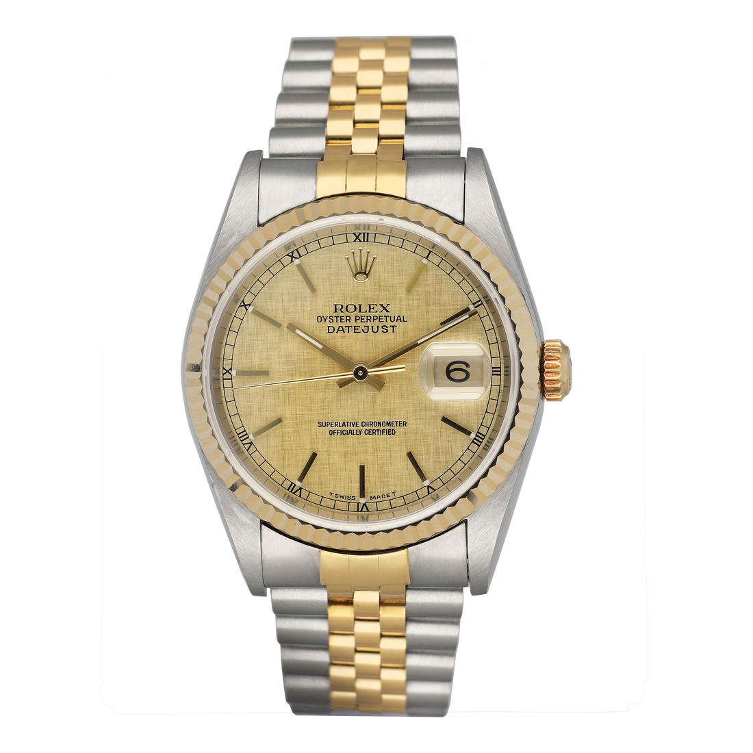 Rolex Datejust 16233 Mens Watch. 36mm stainless steel case. 18K yellow gold fluted bezel. Champagne Satin dial with gold luminous hands and gold index hour markers. Minute markers on the outer dial. Date display at the 3 o'clock position. Stainless steel & 18K yellow gold Jubilee bracelet with stainless steel fold over clasp. Will fit up to a 6.5-inch wrist. Sapphire crystal. Stainless steel case back. Automatic self-winding chronometer movement.