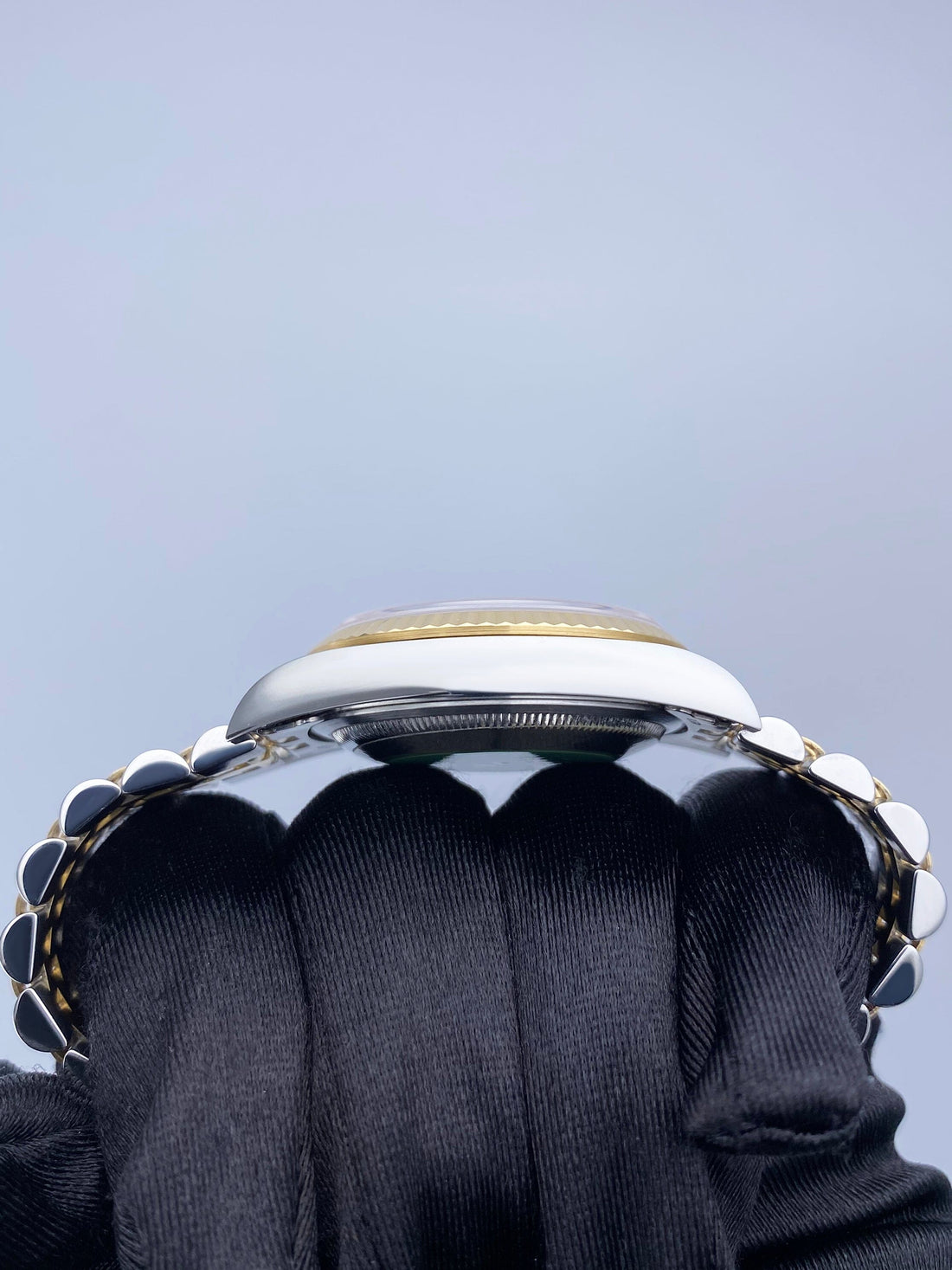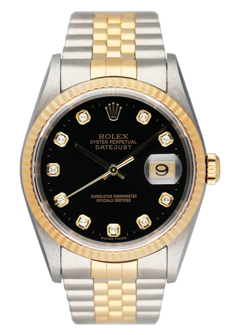 Rolex Datejust 16233 Mens Watch. 36mm stainless steel case. 18K yellow gold fluted bezel. Black dial with gold hands and original factory diamond set hour markers. Minute markers on the outer dial. Date display at the 3 o'clock position. Stainless steel & 18k yellow gold Jubilee bracelet with fold over clasp. Will fit up to a 7-inch wrist. Sapphire crystal. Stainless steel case back. Automatic self-winding chronometer movement. This watch comes with original Box and Papers.