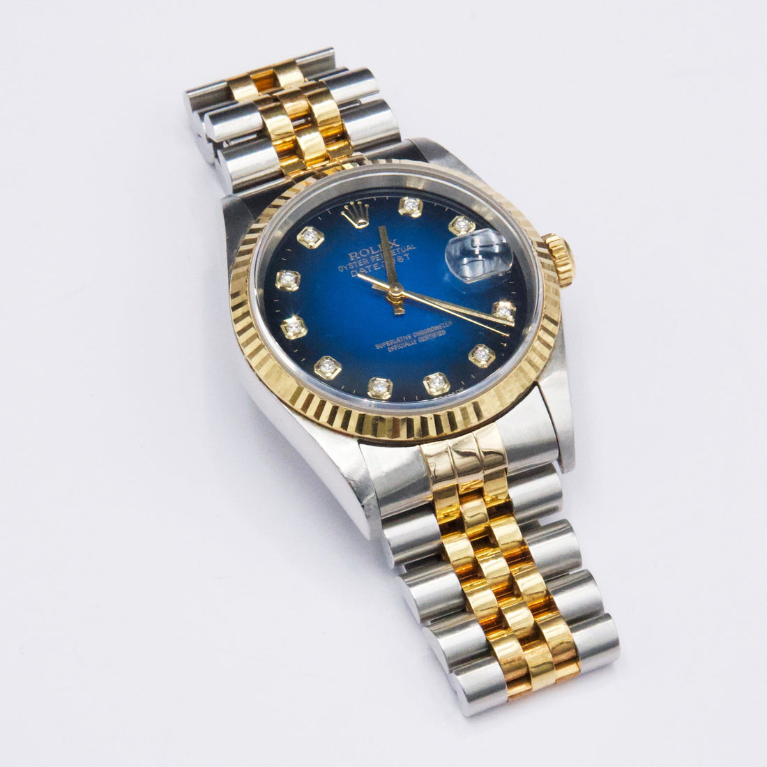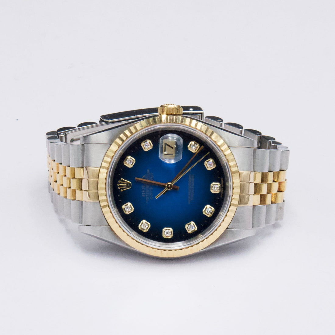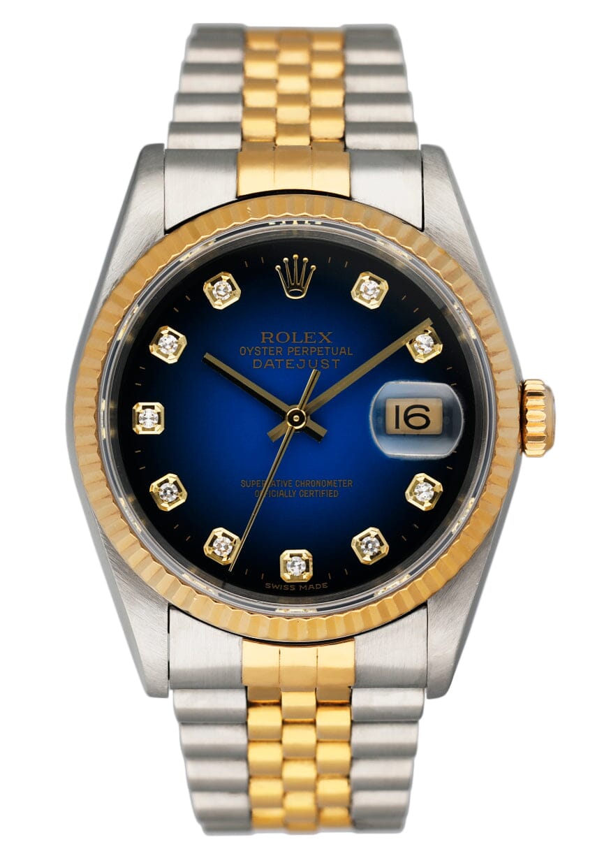 Rolex Datejust 16233 Mens Watch. 36mm stainless steel case. 18K yellow gold fluted bezel. Blue vignette dial with gold luminous hands. Original factory diamond set hour markers. Minute markers on the outer dial. Date display at the 3 o'clock position. Stainless steel & 18K yellow gold Jubilee bracelet with fold over clasp. Will fit up to a 7-inch wrist. Sapphire crystal. Stainless steel case back. Automatic self-winding chronometer movement. This watch comes with original Box and Papers.