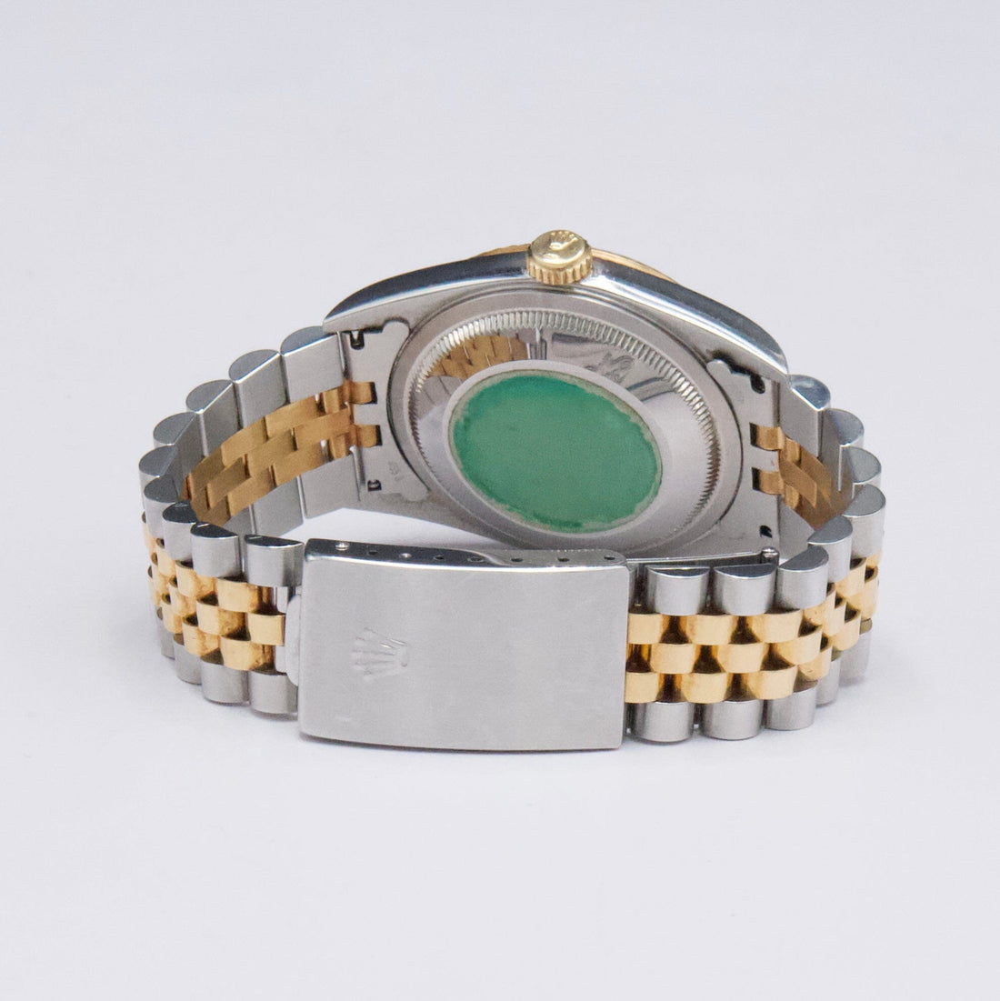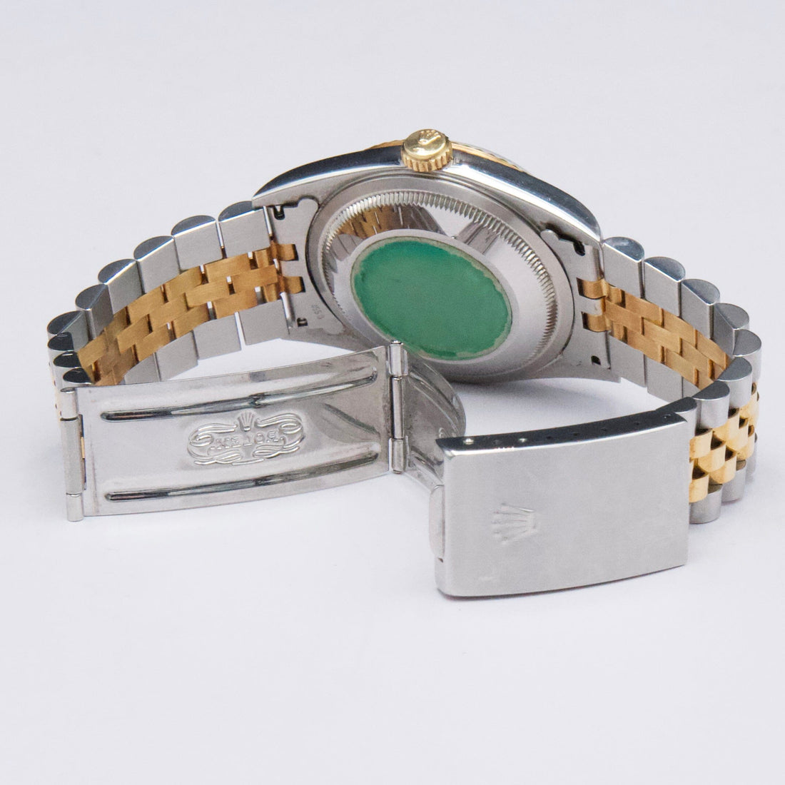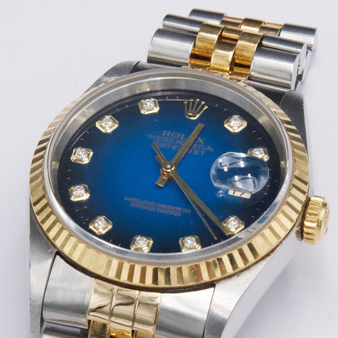 Rolex Datejust 16233 Mens Watch. 36mm stainless steel case. 18K yellow gold fluted bezel. Blue vignette dial with gold luminous hands. Original factory diamond set hour markers. Minute markers on the outer dial. Date display at the 3 o'clock position. Stainless steel & 18K yellow gold Jubilee bracelet with fold over clasp. Will fit up to a 7-inch wrist. Sapphire crystal. Stainless steel case back. Automatic self-winding chronometer movement. This watch comes with original Box and Papers.