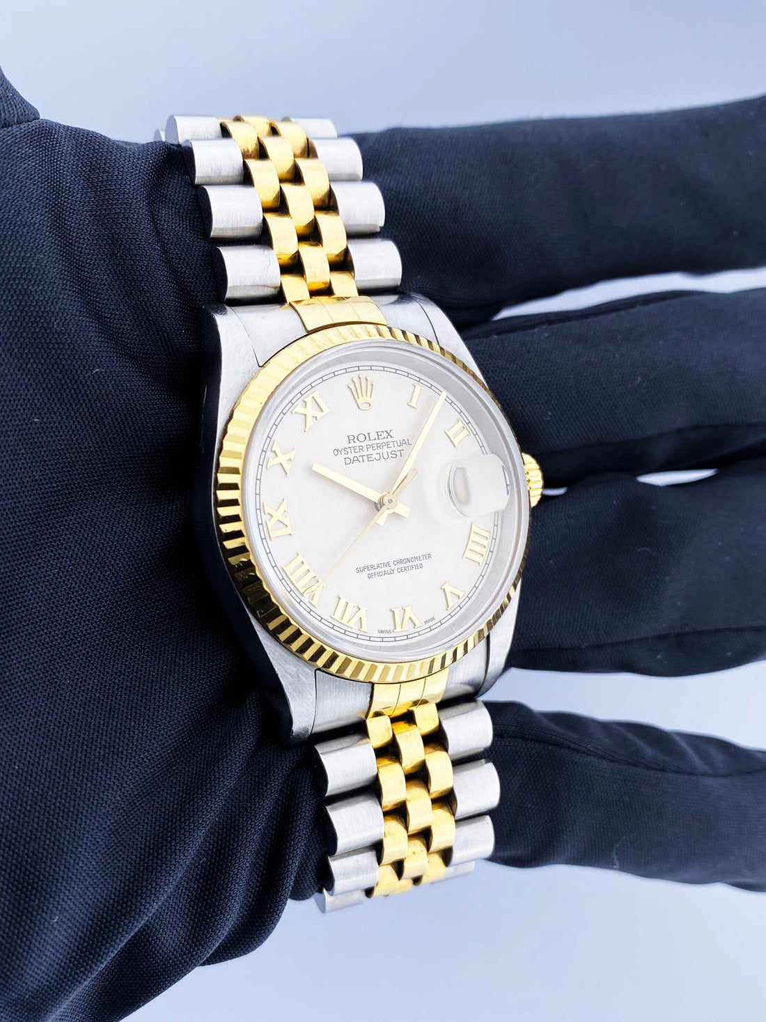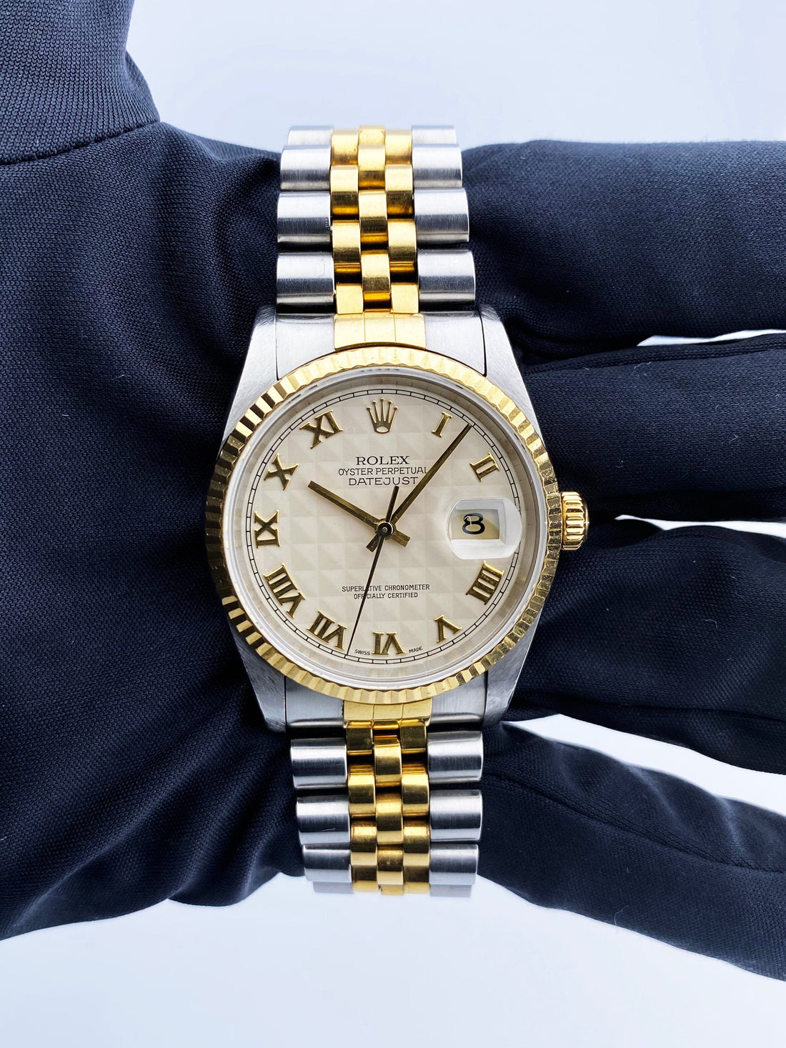Rolex Oyster Perpetual Datejust 16233 Mens Watch. 36mm stainless steel case with 18K yellow gold fluted bezel. Ivory pyramid dial with gold hands and gold Roman numeral hour markers. Minute markers on the outer dial. Date display at the 3 o'clock position. Stainless steel & 18K yellow gold Jubilee bracelet with fold over clasp. Will fit up to a 7-inch wrist. Sapphire crystal. Stainless steel case back. Automatic self-winding chronometer movement. This watch comes with original Box and Papers.