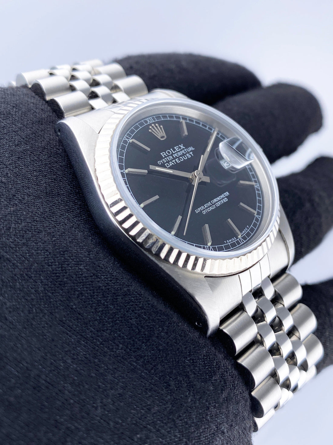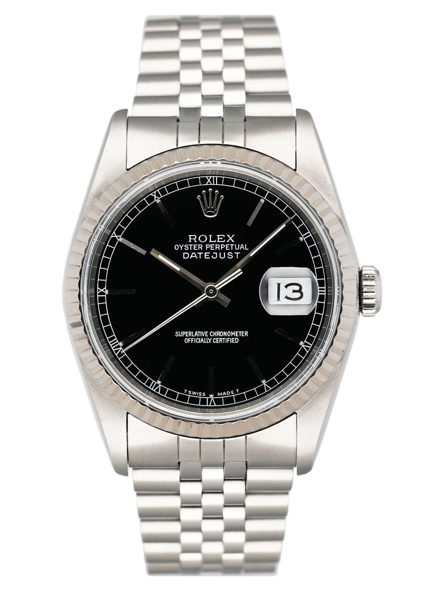 Rolex Datejust 16234 Mens Watch. 36mm stainless steel case. 18K white gold fluted bezel. Black dial with steel hands and Roman numeral hour marker. Minute maker on the outer dial. Stainless steel Oyster bracelet with fold over clasp. Will fit up to a 7-inch wrist. Sapphire crystal. Stainless steel case back. Automatic self-winding movement.